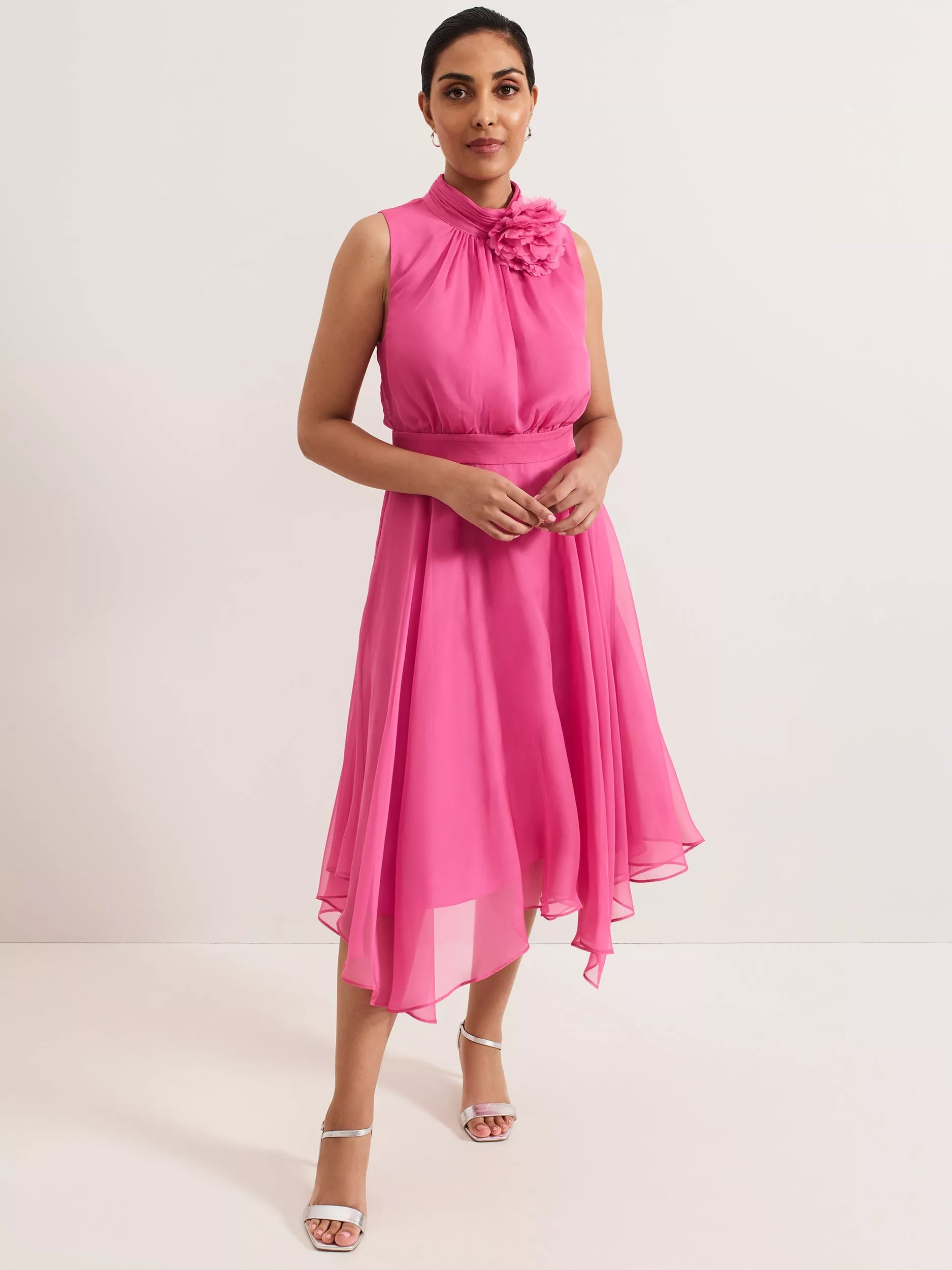 The best-selling Lucinda silhouette from Phase Eight in a new vibrant pink. A romantic floral applique highlights the elegant high neckline for a touch of sophistication. Flowing to a beautiful chiffon skirt for fluid movement. Style it with silver accessories for an effortless event look.