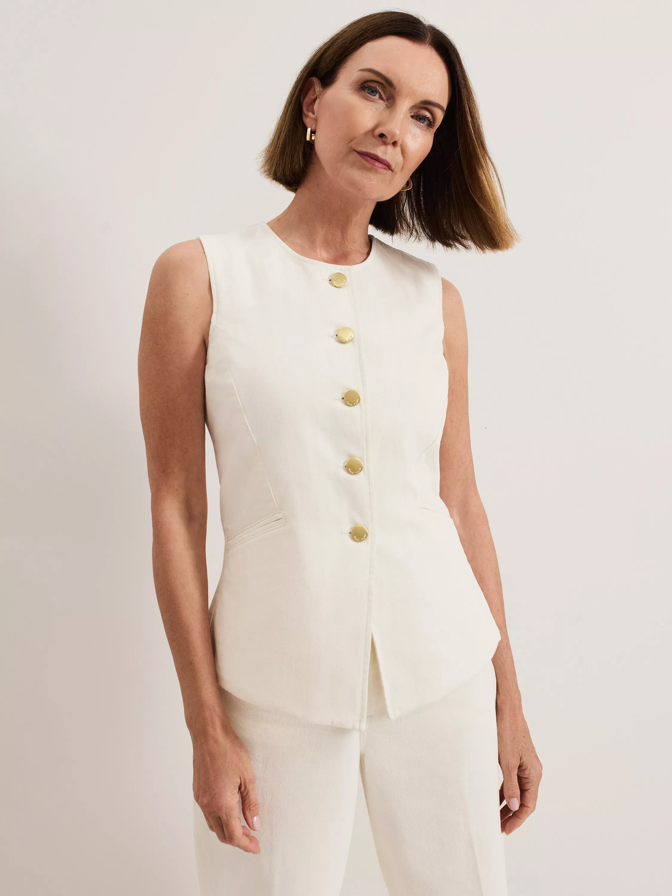 The perfect addition to your denim collection. With exposed seam detailing to create a streamlined silhouette our on-trend waistcoat is finished with welt pockets and gold button detailing for a modern edge. The timeless cream shade will see you through every season.