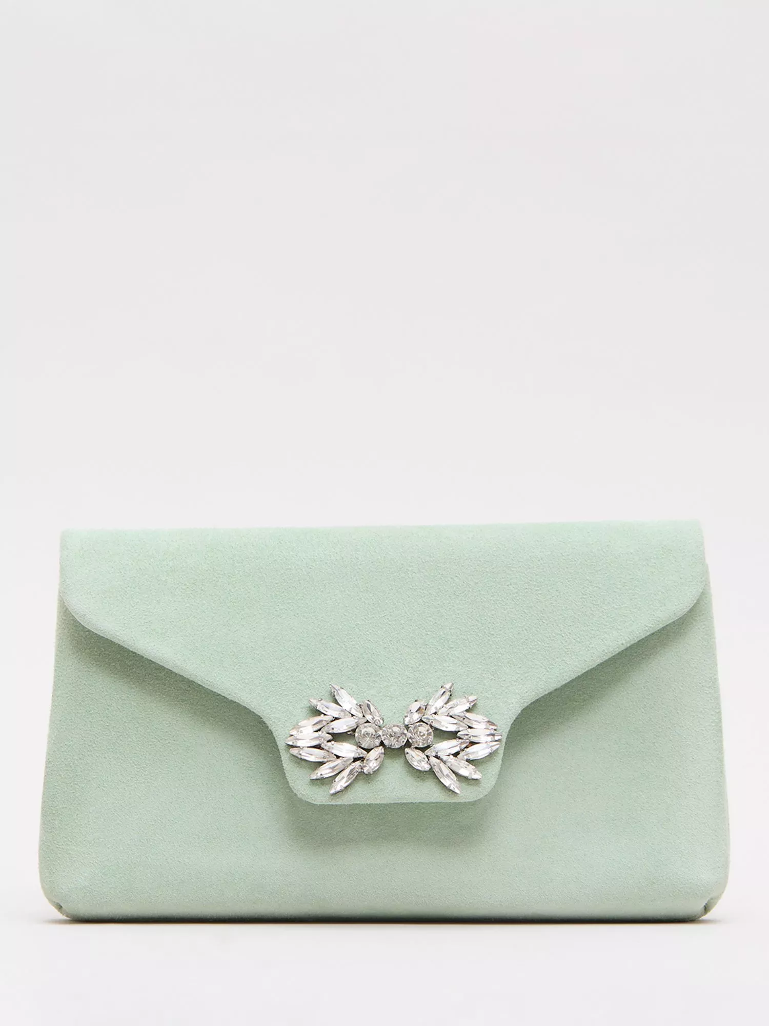 A pure suede foldover clutch bag from Phase Eight, featuring diamante embellishment. With a long chain strap for flexible styling options, the compact design ensures your essentials are kept close.