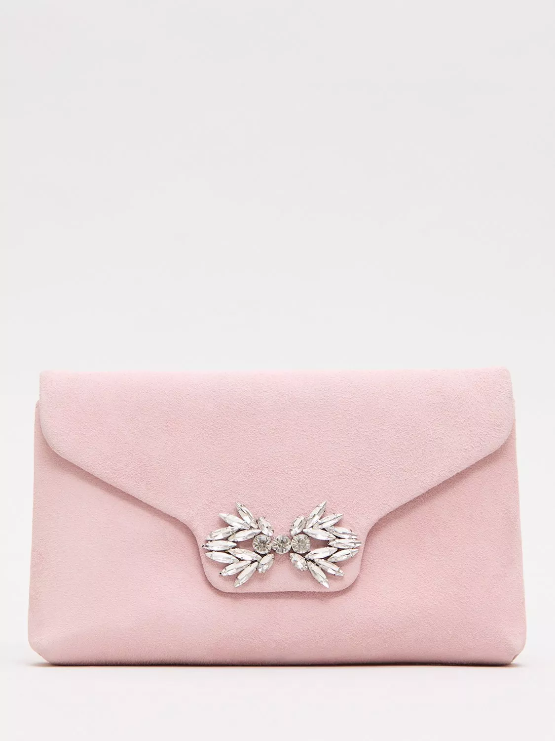 A pure suede foldover clutch bag from Phase Eight, featuring diamante embellishment. With a long chain strap for flexible styling options, the compact design ensures your essentials are kept close.