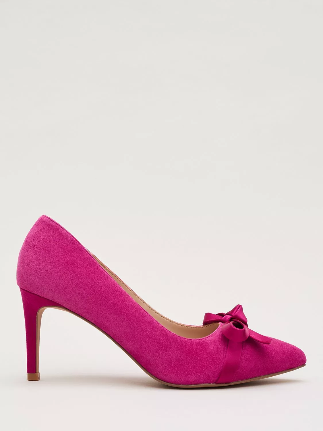 From Phase Eight, these berry pink court shoes are guaranteed to add a dash of glamour to your overall outfit. Featuring a classic stiletto heel, our suede heels are finished with a satin bow detail at the pointed toe. Pair with a matching clutch for a coordinated look.