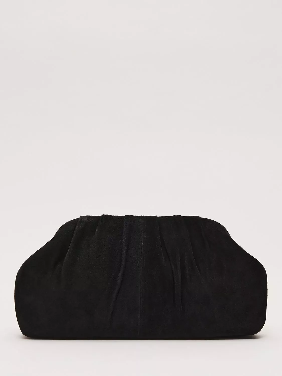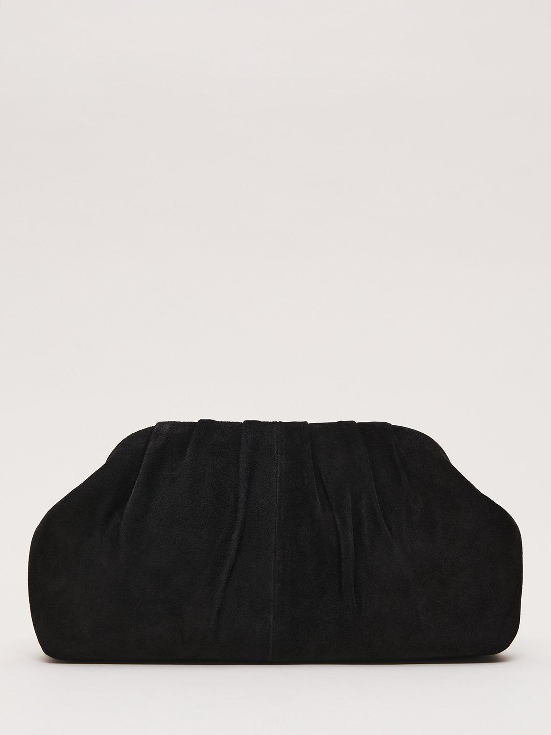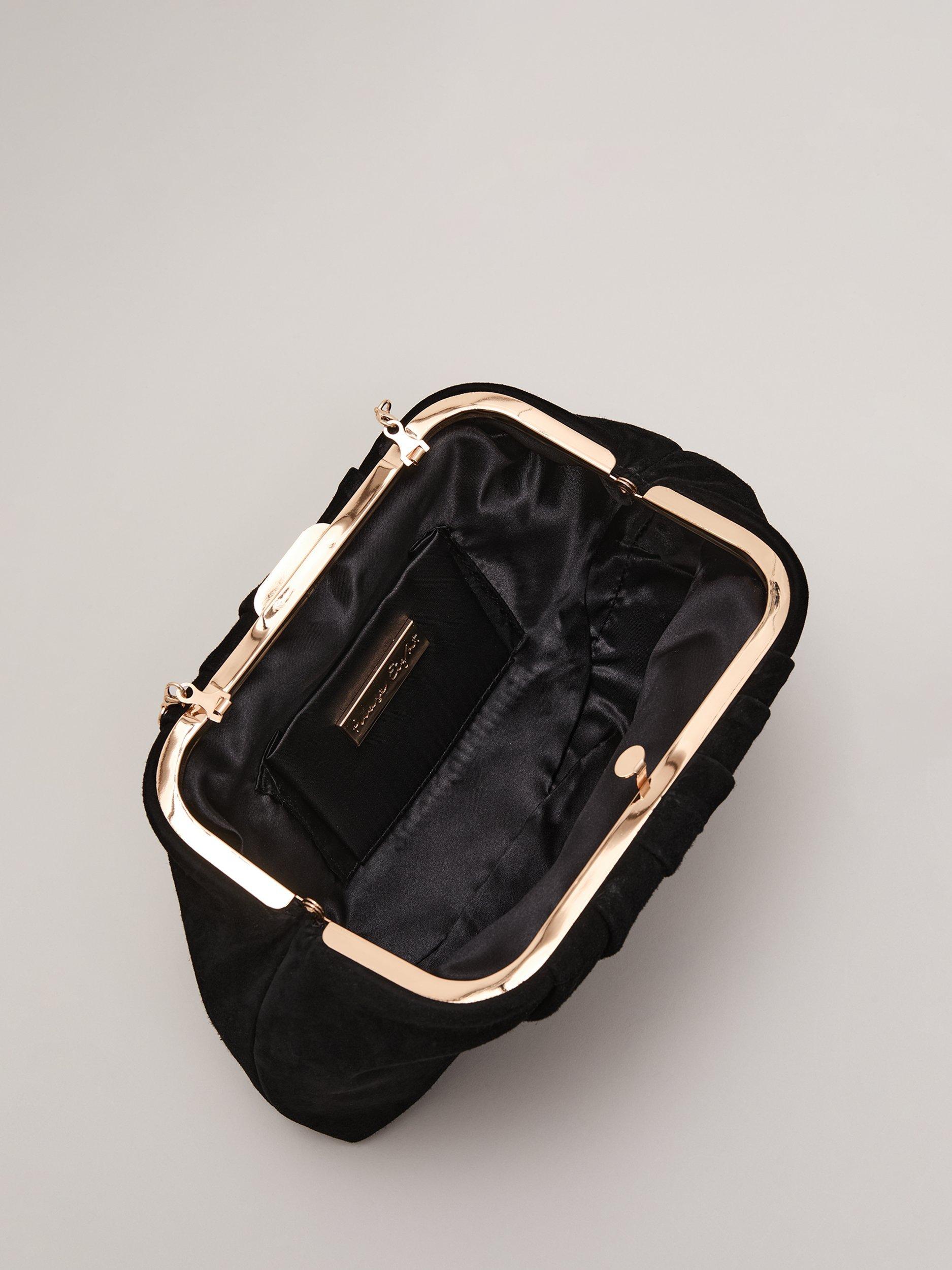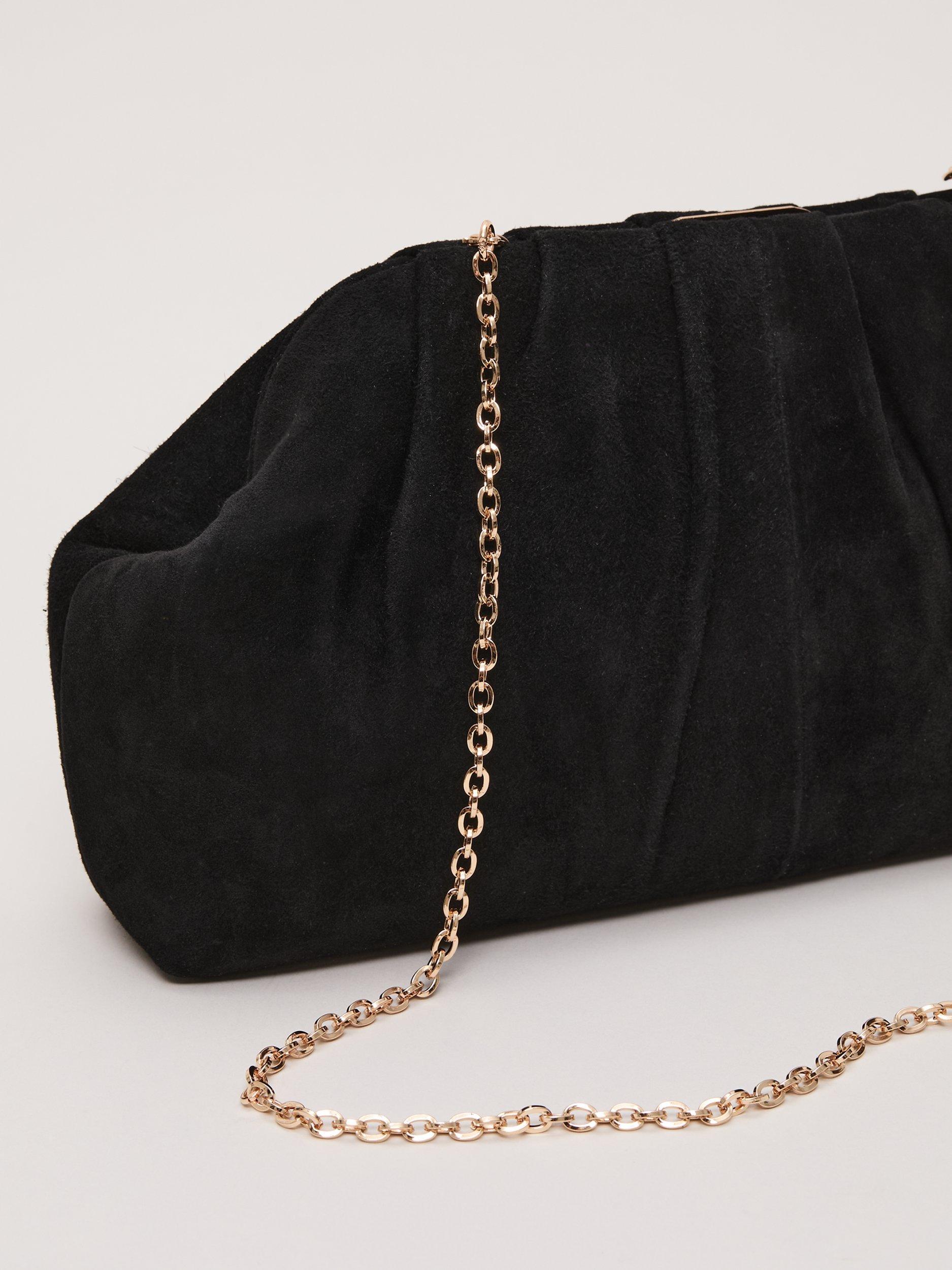 This suede clutch bag features delicate pleating, metal detailing and a handy chain for versatile use, ideal as a sophisticated event accessory. Style with matching suede heels for a coordinated look.