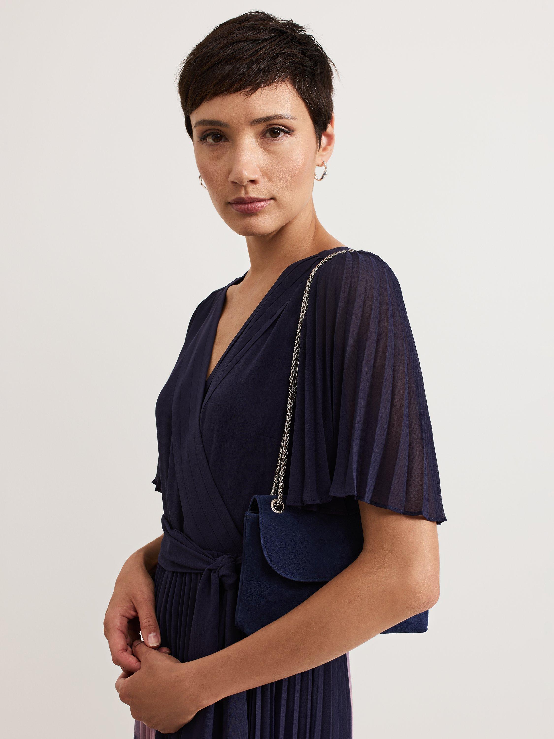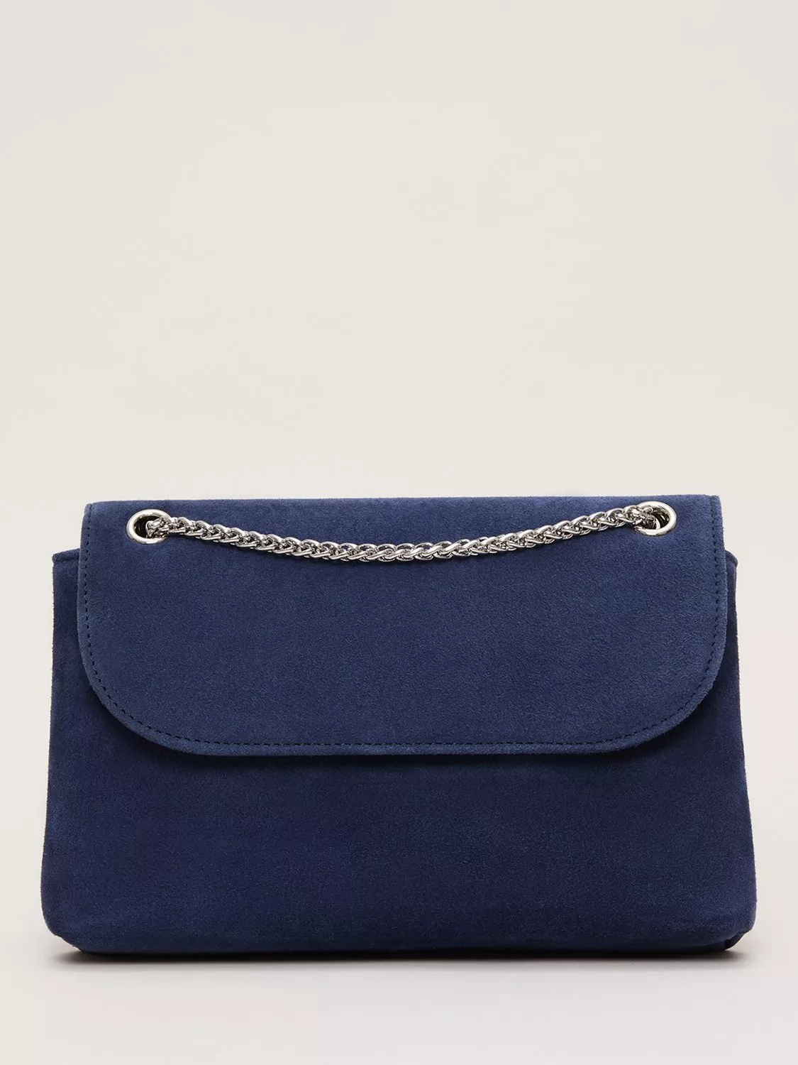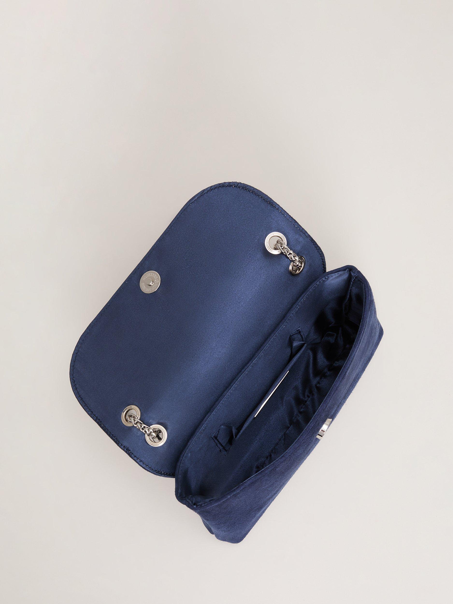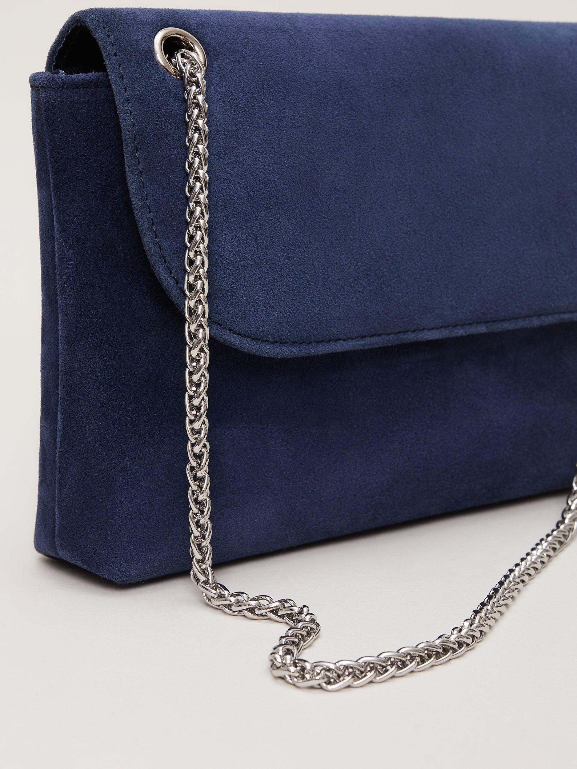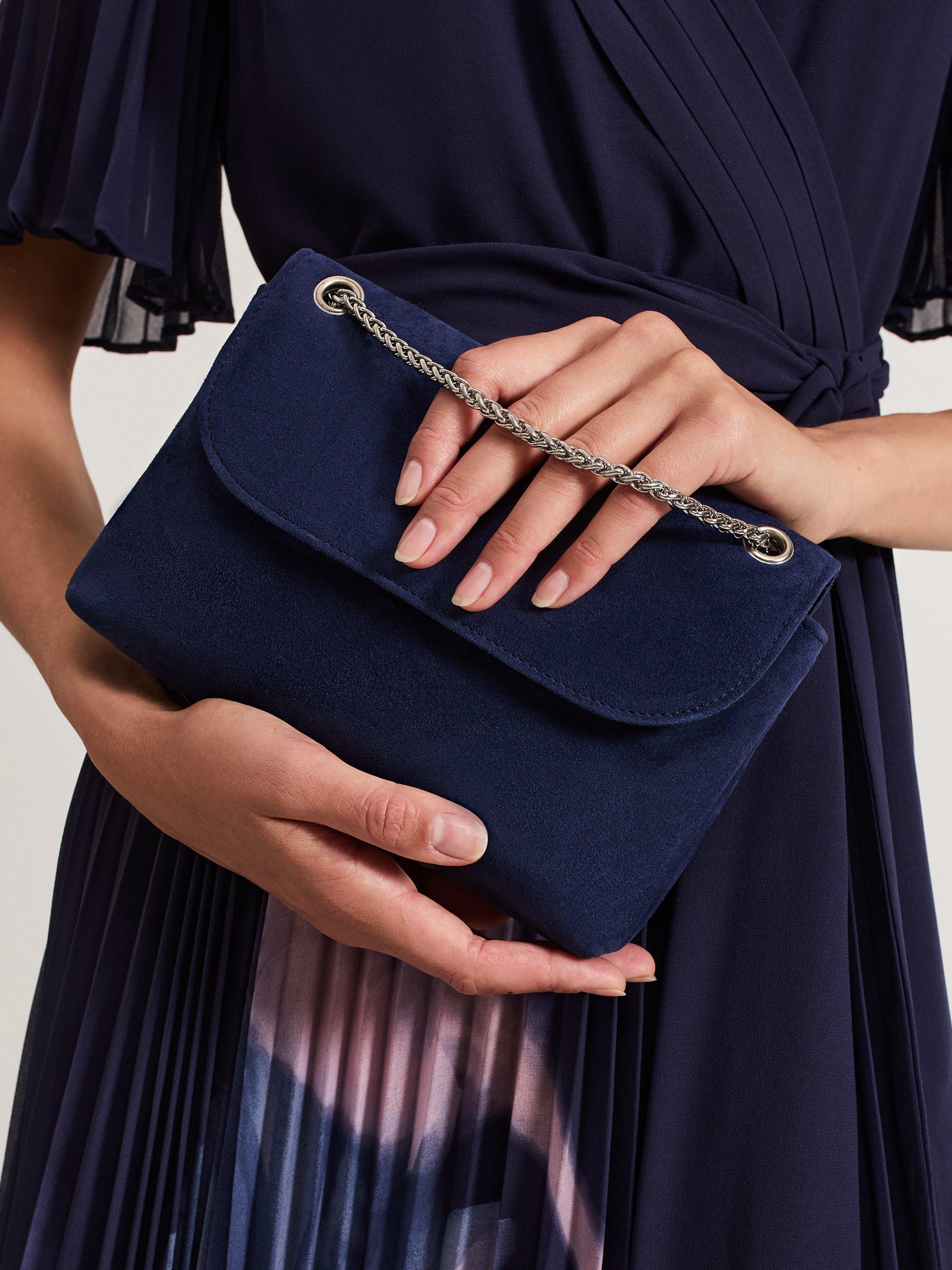 This bag is a timeless accessory to finish all your favourite styles. In a luxury suede material our bag fastens with a concealed magnetic clasp and can be used as a clutch or worn as a classic crossbody style with the delicate silver chain. We style ours with suede heels for a coordinated look.