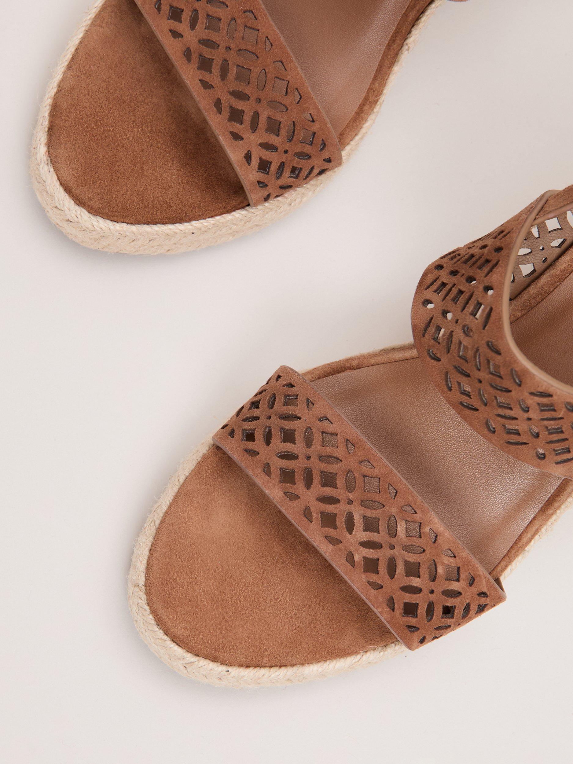 Suede heeled sandals from Phase Eight, featuring a comfortable 6cm wedge heel, leather lining, and easy buckle fastening.