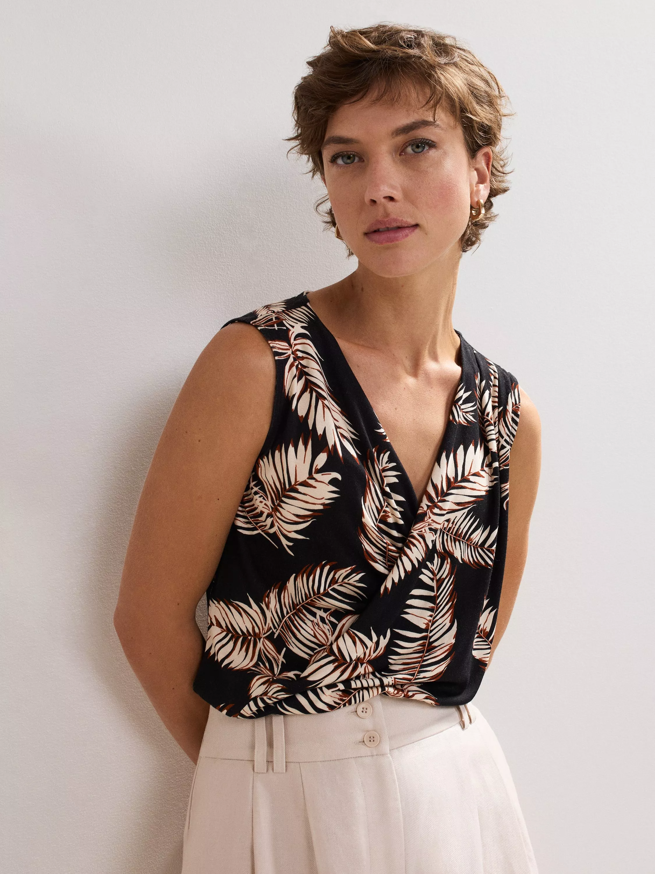 Discover the Sutton top from Phase Eight in a new leaf print. A wrap-style front and subtle draping at the neckline create an effortless style to dress up or down, while the sleeveless cut means it's ideal for spring and summer.