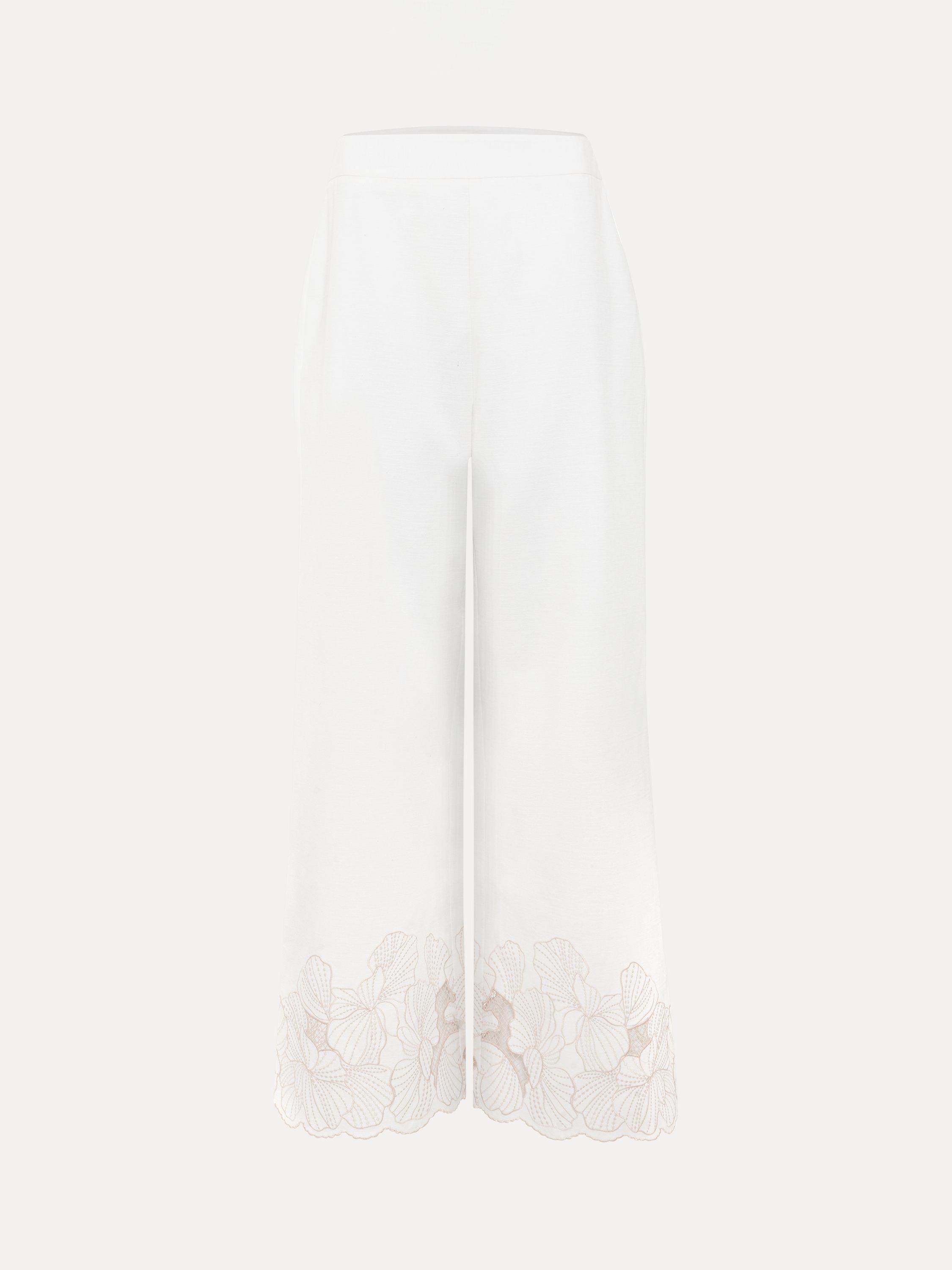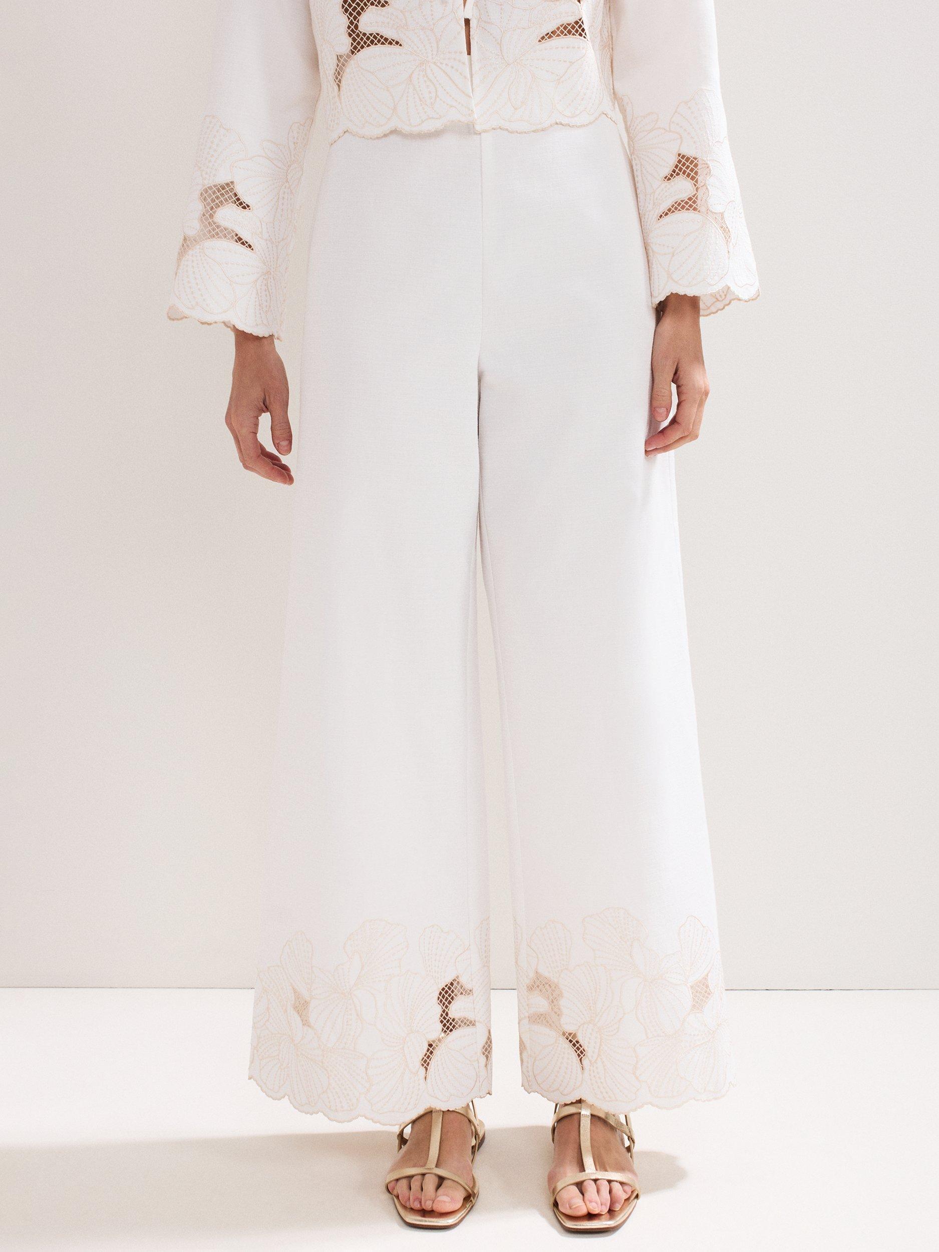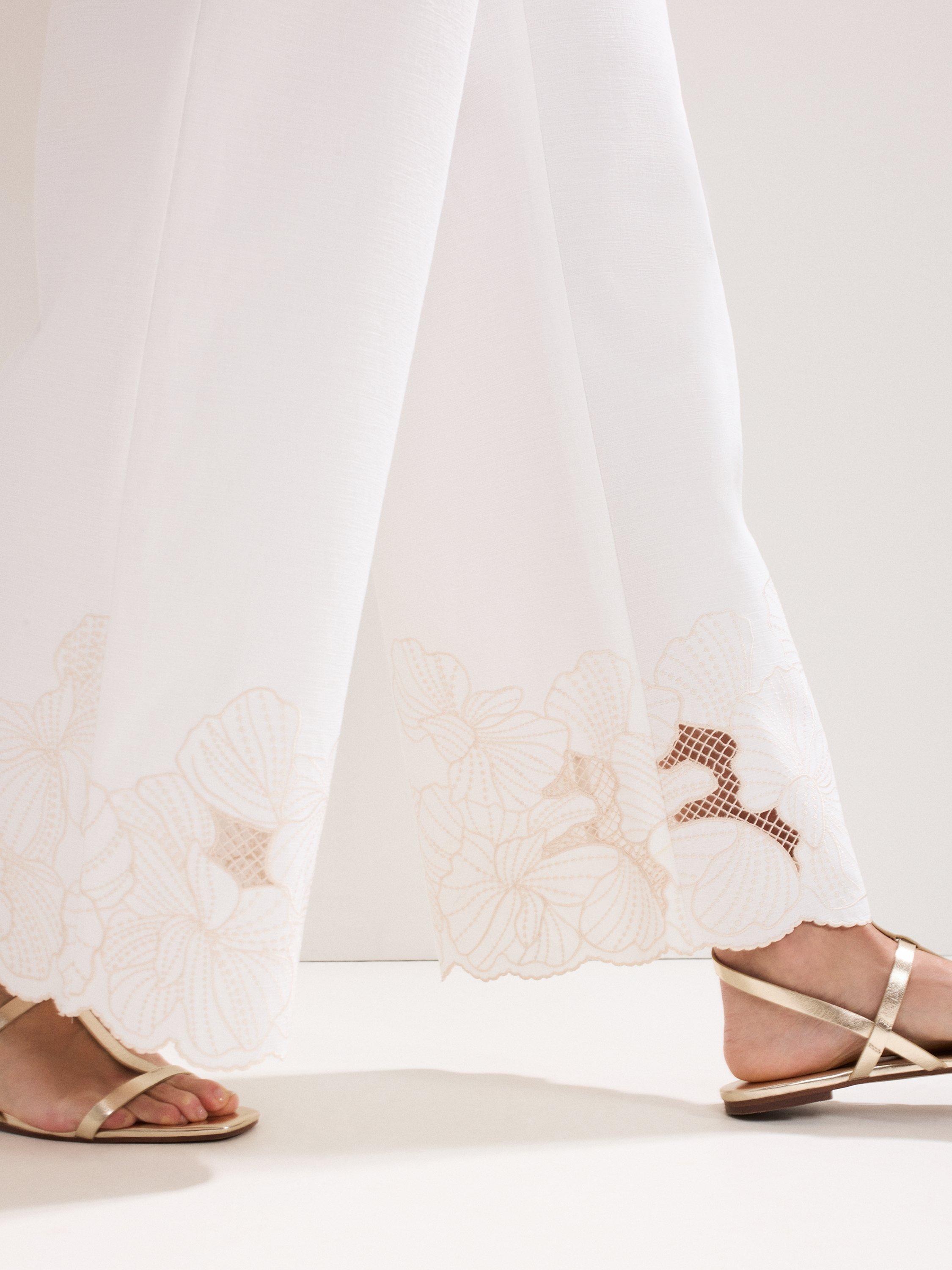 Crafted with 100% cotton for a lightweight feel, these trousers will become a staple in your wardrobe. Finished with intricate embroidered detailing at the hem for a contemporary edge, the wide leg silhouette makes for a stylish day or night look.