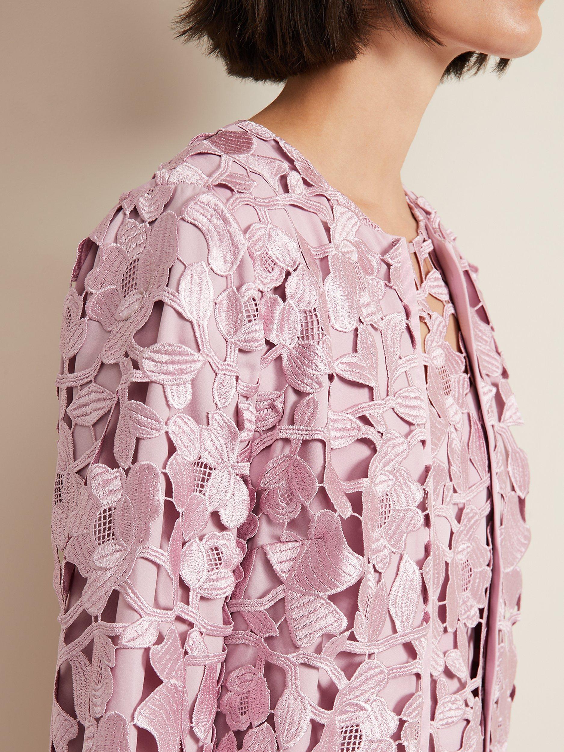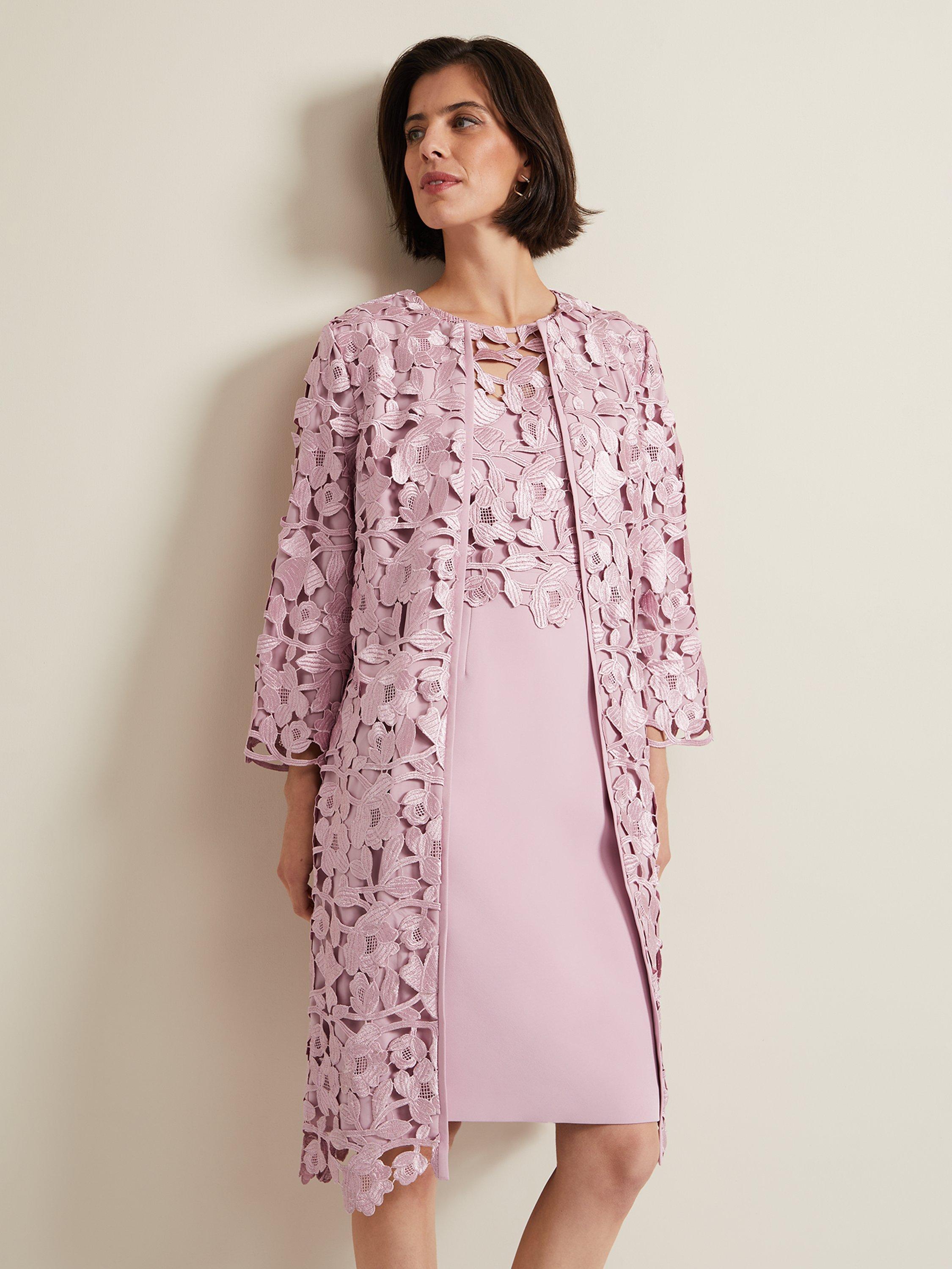 Designed in a versatile shade this fully lace coat is designed with clean seam detailing an open front and a peplum silhouette. It makes for the perfect final layer to your special occasion dress.