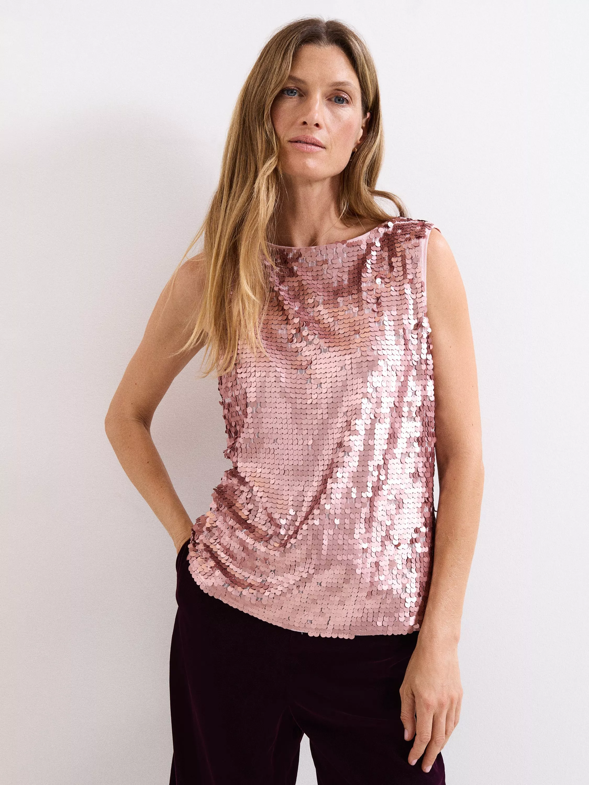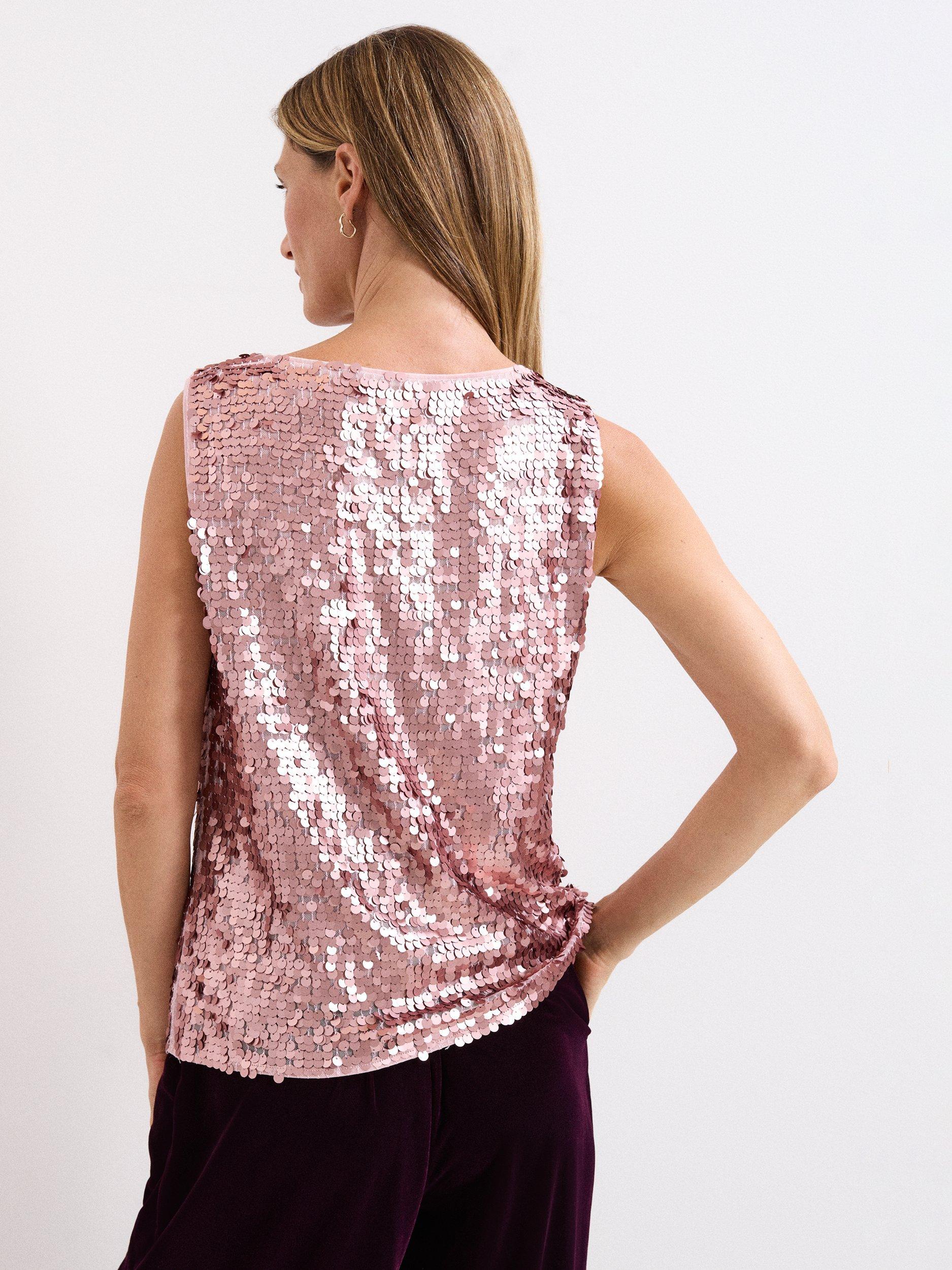 Let this style do all the talking this party season. Designed in statement sequins, this sleeveless top is designed in a timeless silhouette to keep all the attention on the sparkle. Versatile but eye-catching, style with black wide-leg trousers and your favourite heels for a modern take on a glitzy party look.