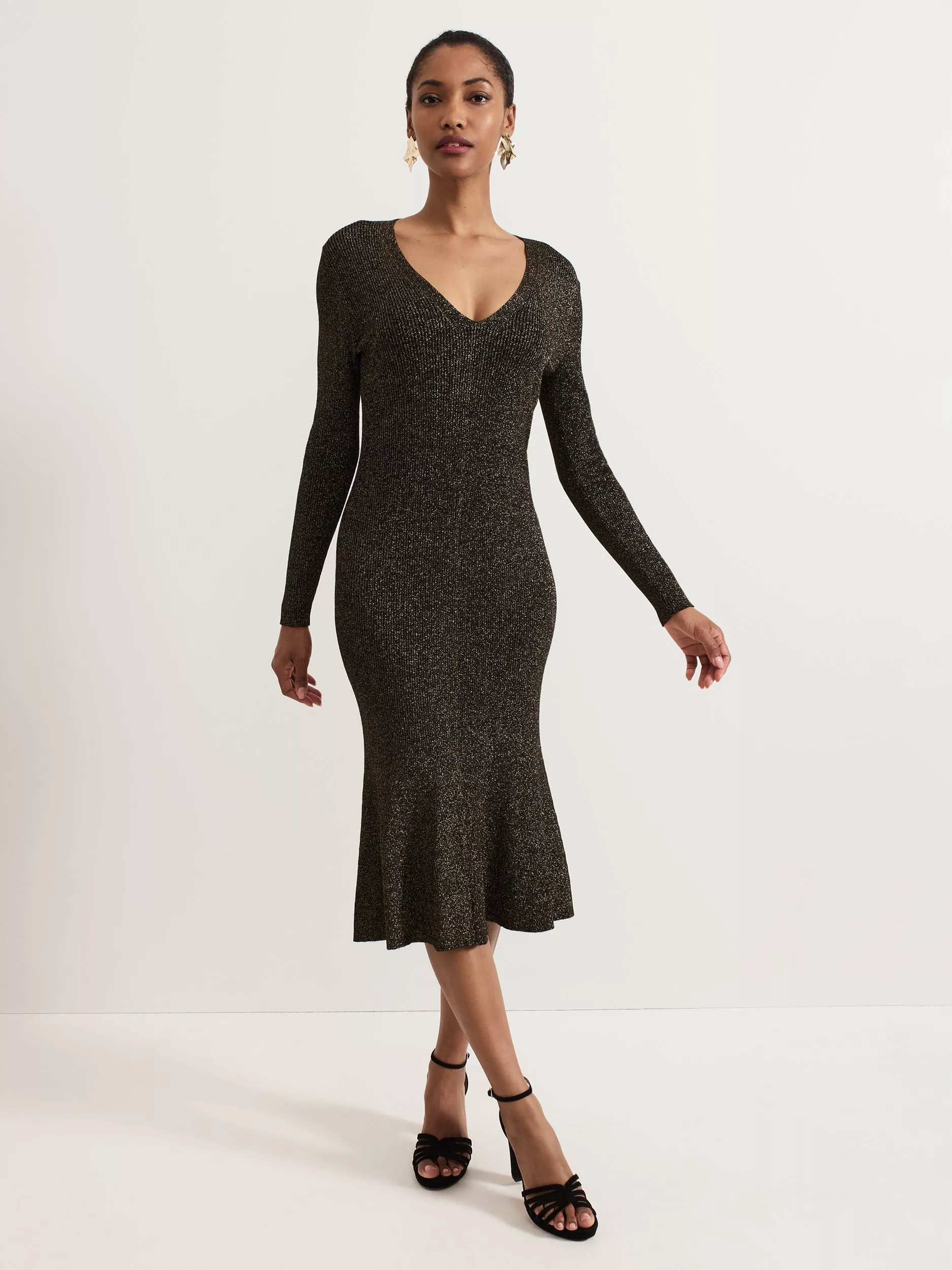 The Tillie dress is a one step styling solution to achieve effortless appeal. With a feminine scoop neck, this black dress features metallic thread detailing throughout. The ribbed material skims the body to flatter your figure before falling to a subtly flared hem, perfect to pair with your favourite black heels.