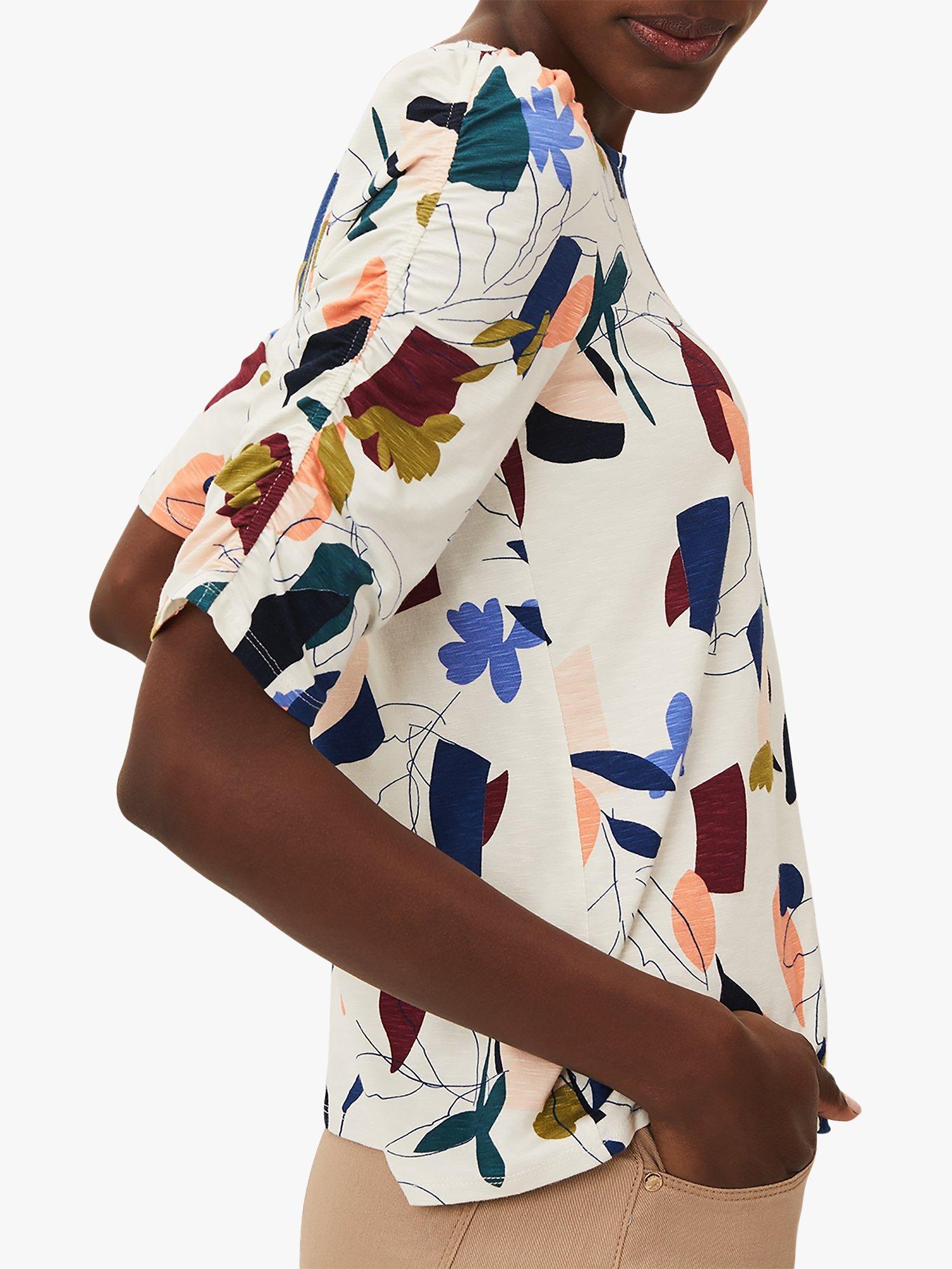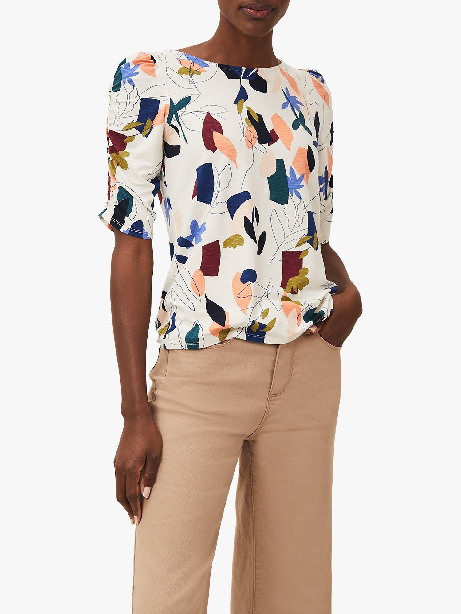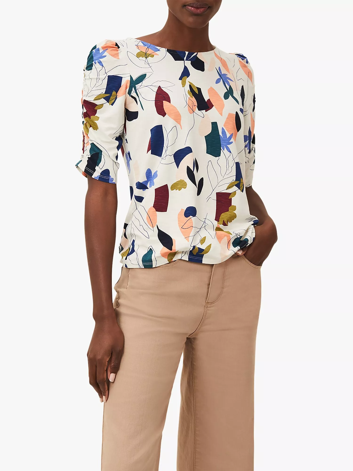 The Phase Eight Torrie top has a modern floral-inspired abstract print, short ruched sleeves and a round neckline. Perfect for dressing down on weekends, style yours with jeans and flats.