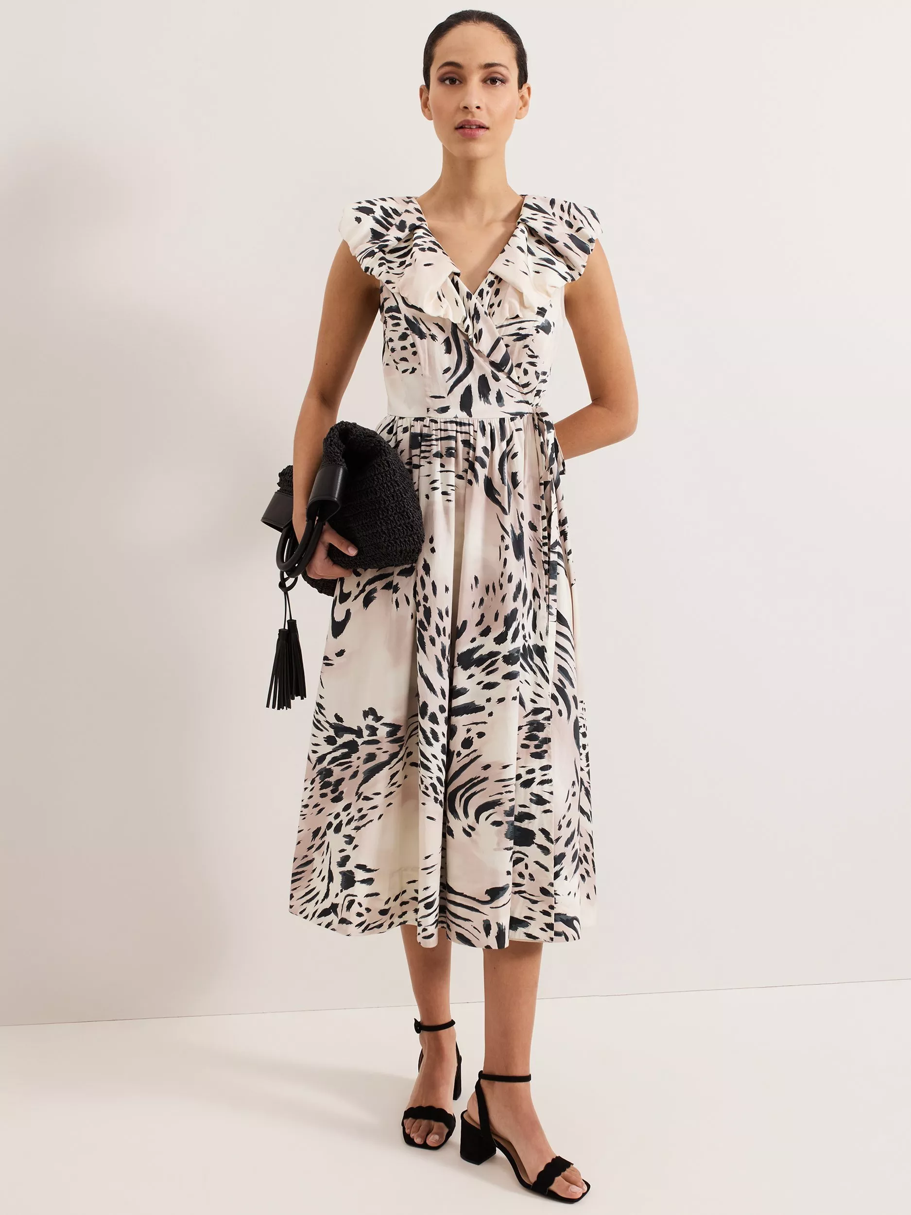 The new neutral: leopard print. The Trix wrap dress features beautiful ruffle detailing at the neckline and shoulders, flowing to a soft midi skirt for fluid movement. Styled with matching accessories, it's the perfect contemporary look with day-to-night versatility.