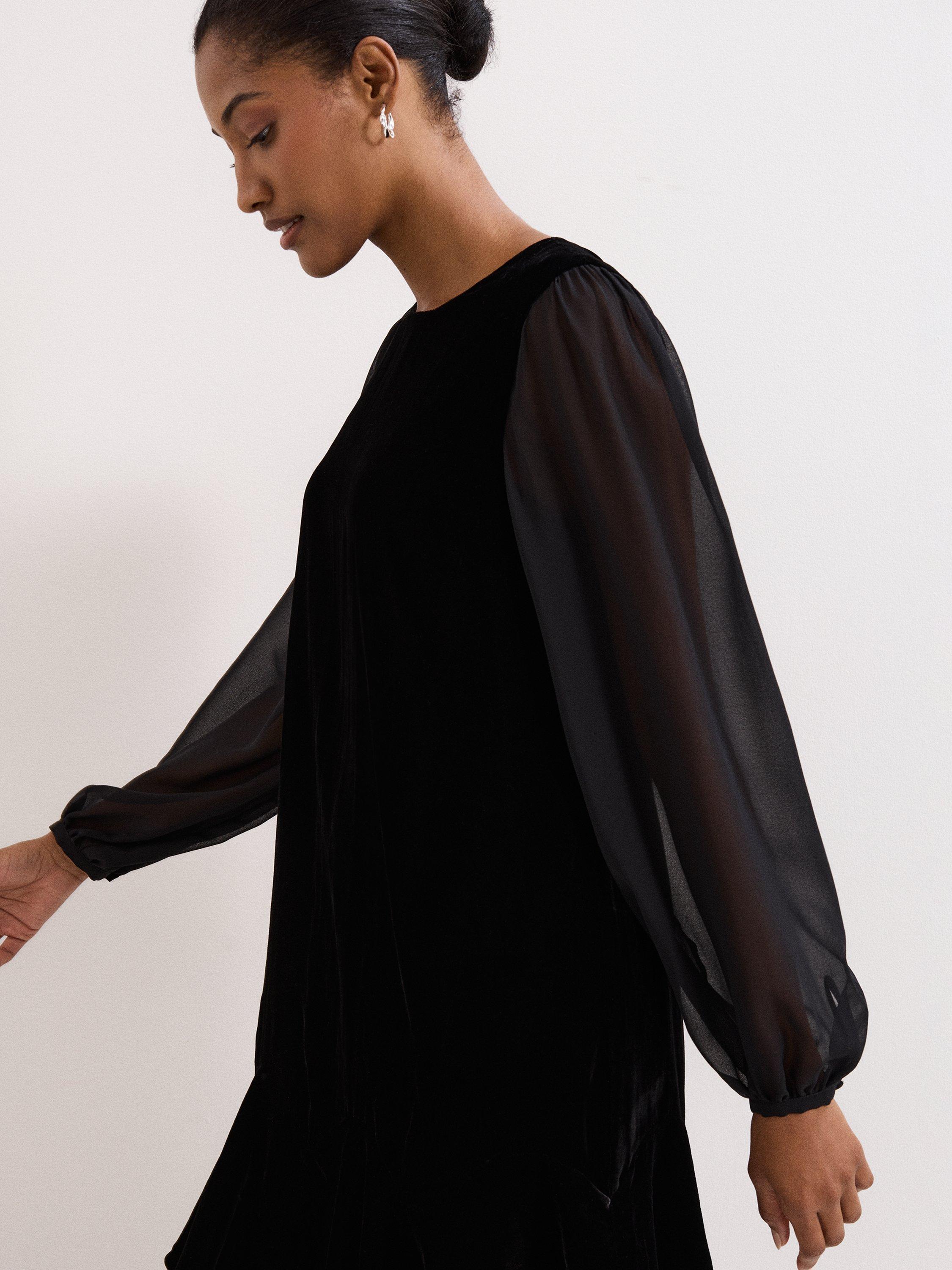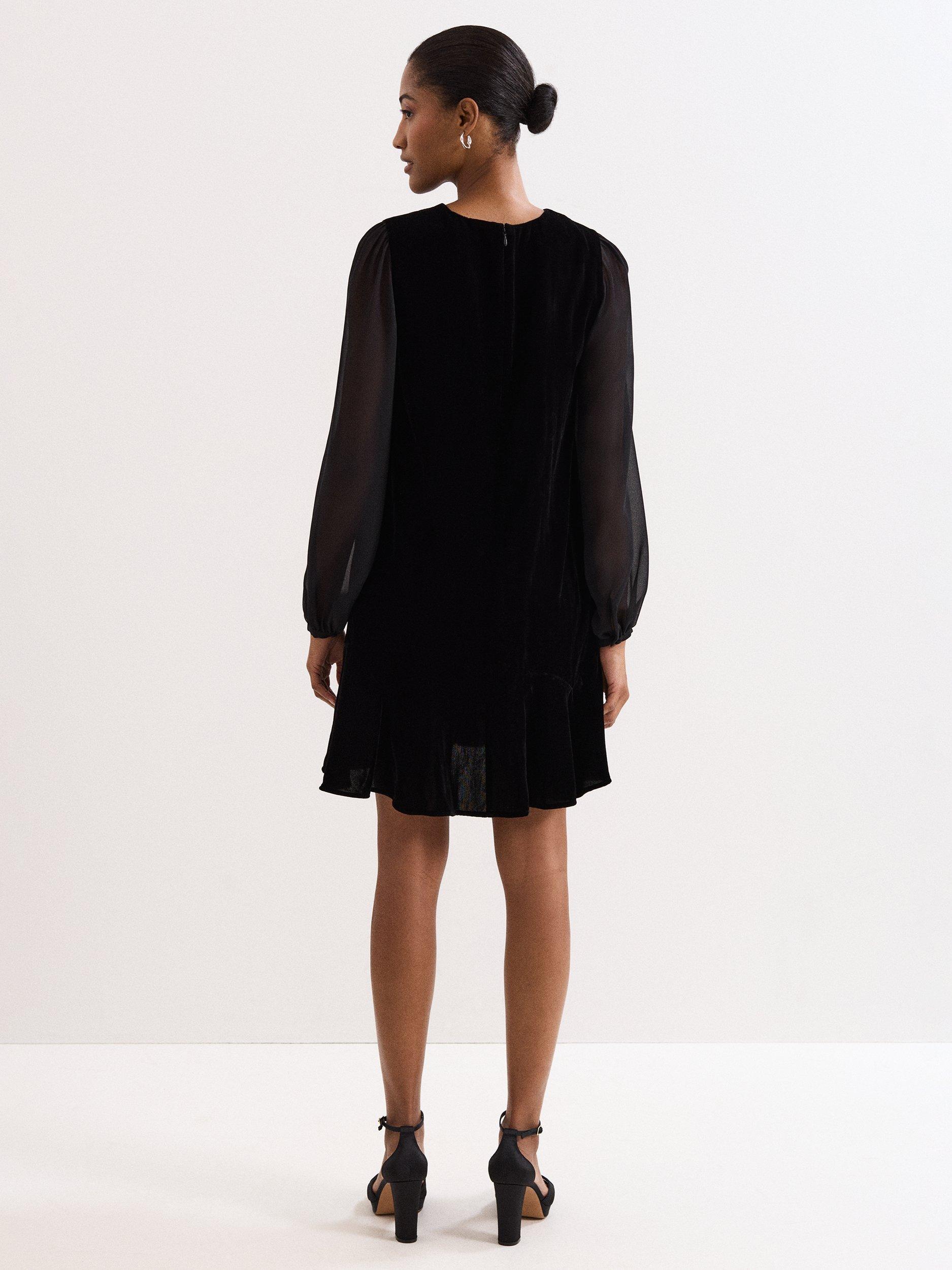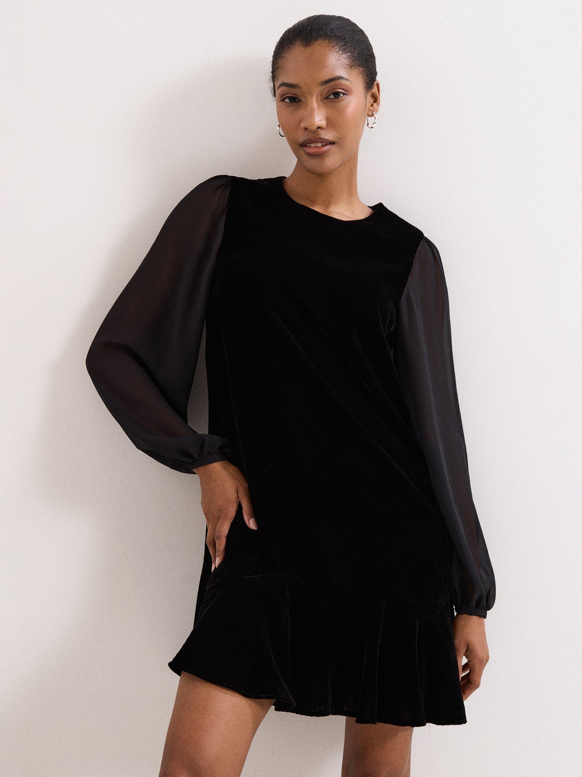 A mini swing dress from Phase Eight. The round neck and long sleeves balance flair and comfort, while the regular cut and soft velvet fabric moves effortlessly with you.