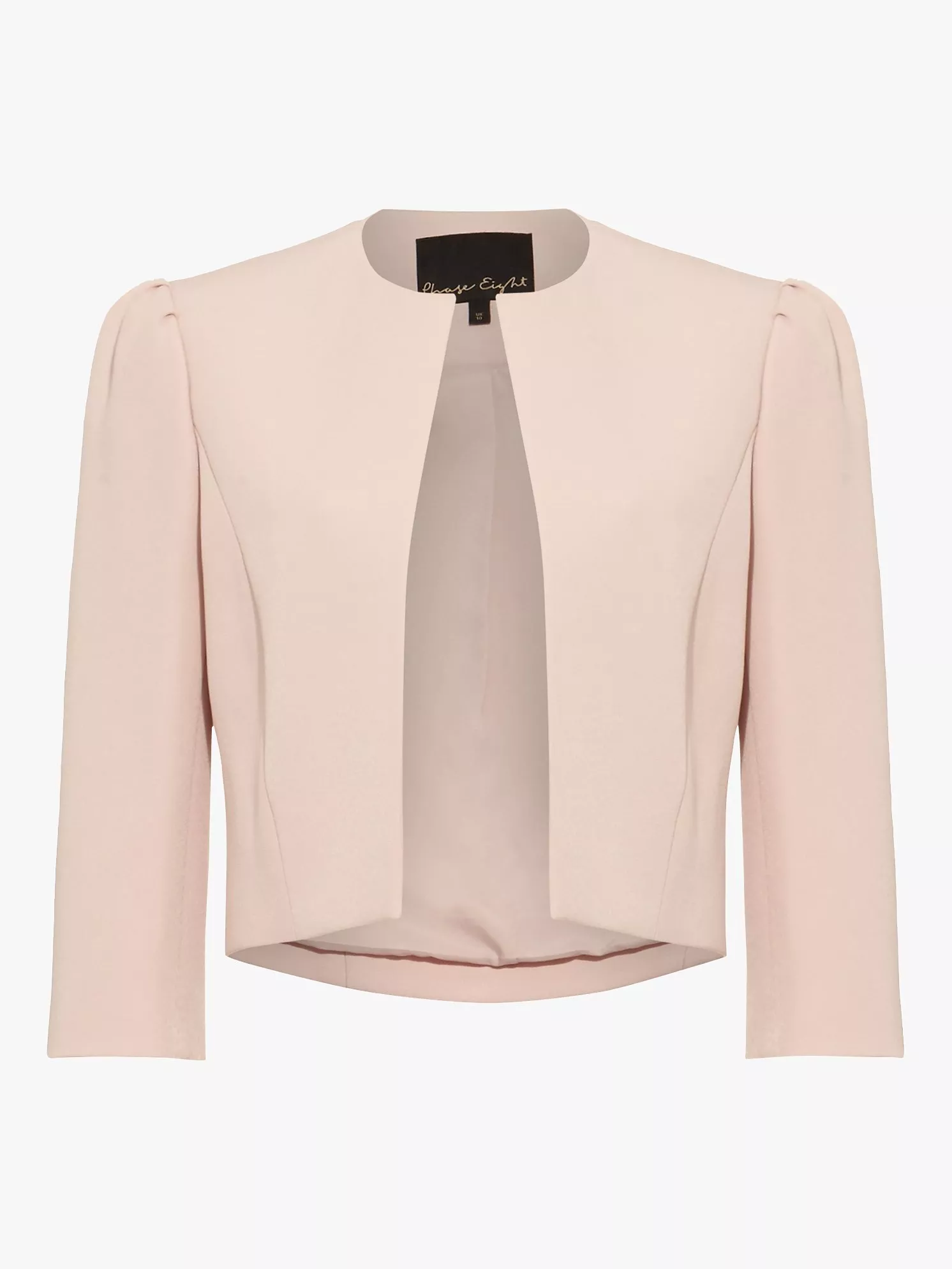 Tailored from smooth fabric in a fitted design, it is fully lined and features an open front, flattering seaming, three-quarter length sleeves, and detailing at the shoulders for an attractive silhouette.
