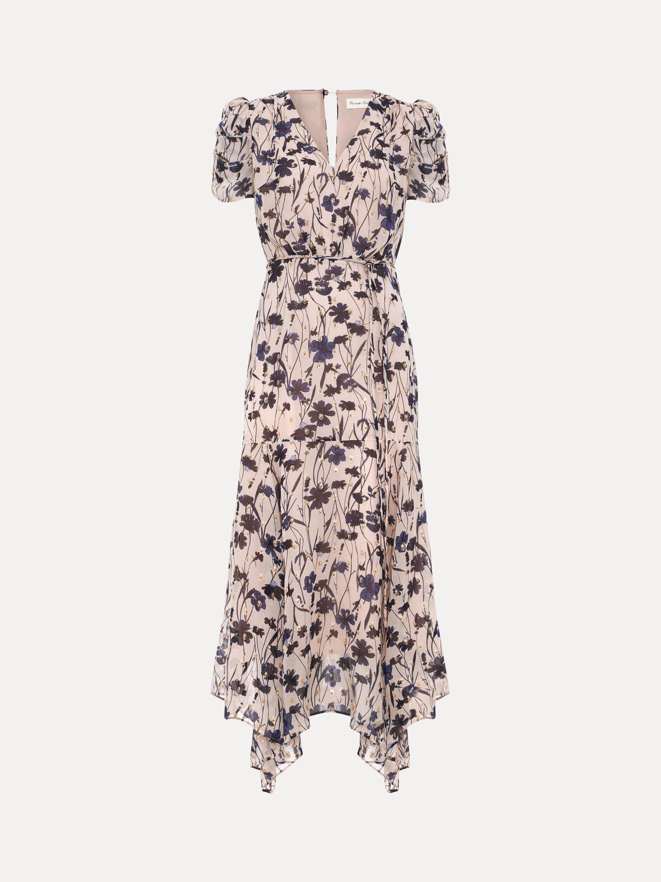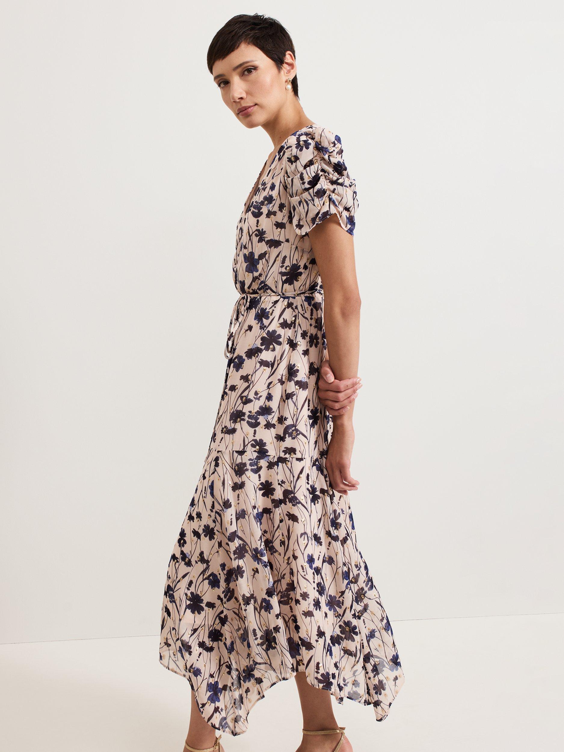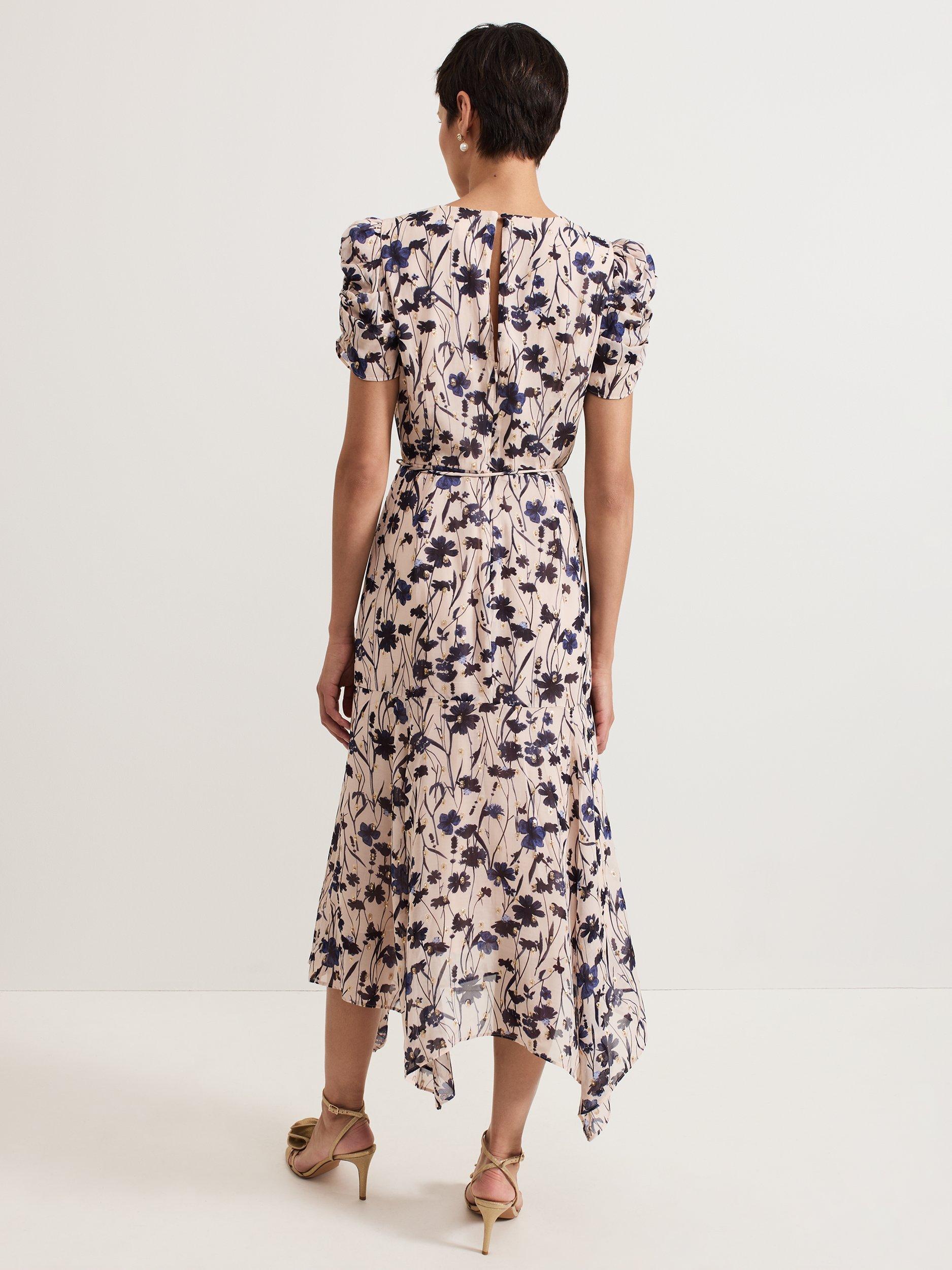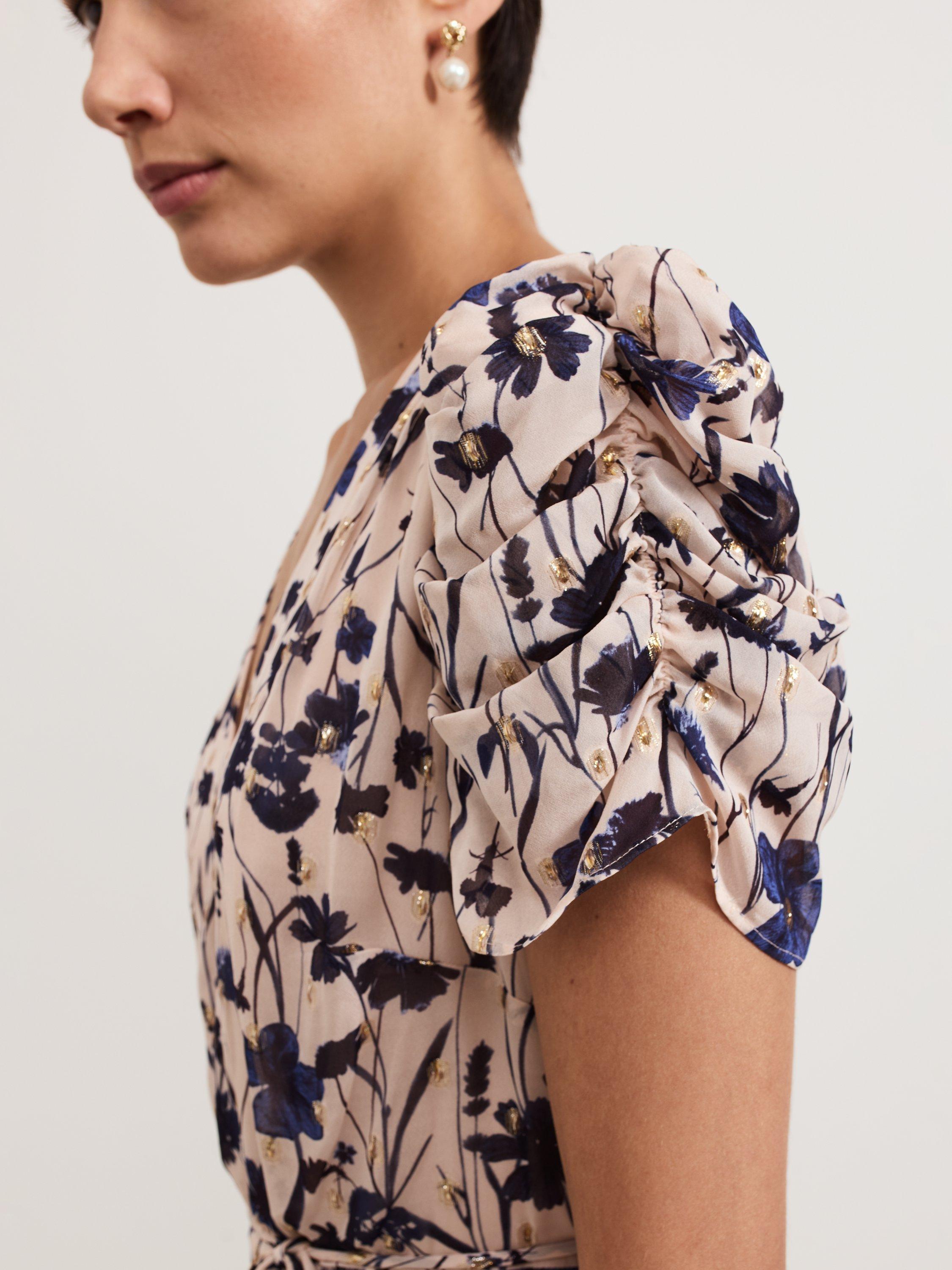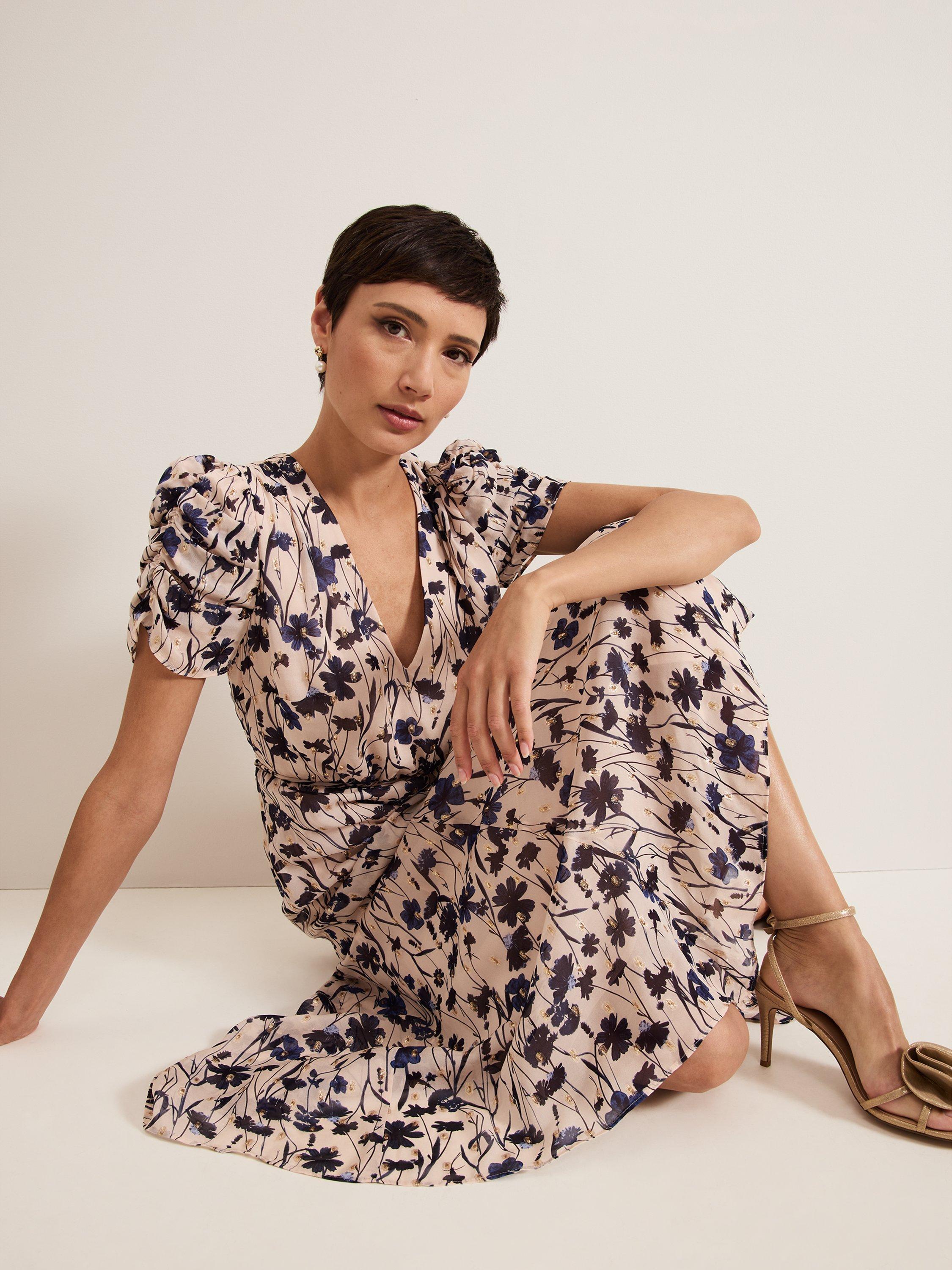 Embrace elegant florals with the Verity dress. Full of beautiful detailing, this midi dress has ruched sleeves to create a gathered effect, falling to a midi length with an asymmetric hem. Flecks of gold detailing subtly catch the light as you move, the perfect feminine style for all your upcoming occasions.
