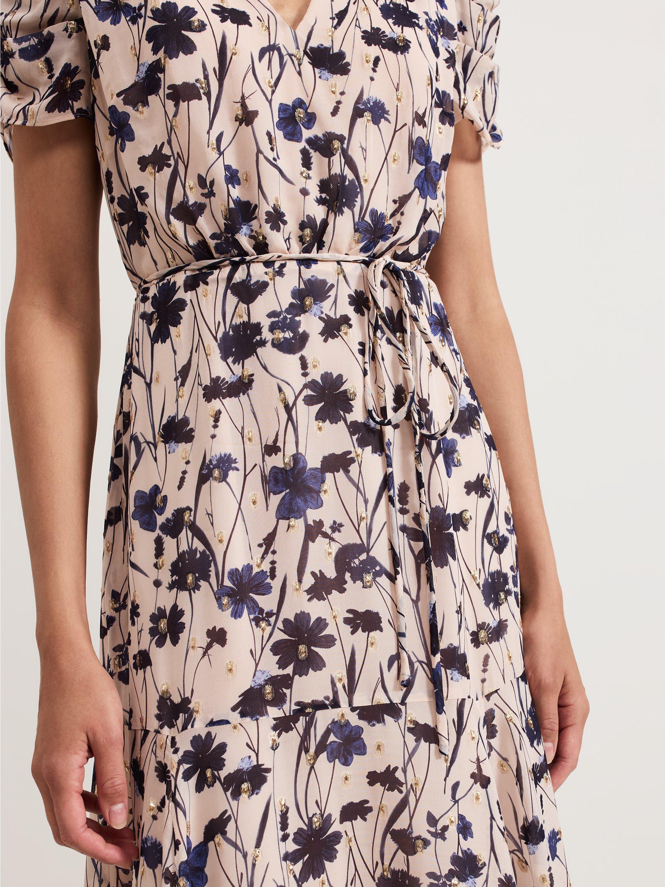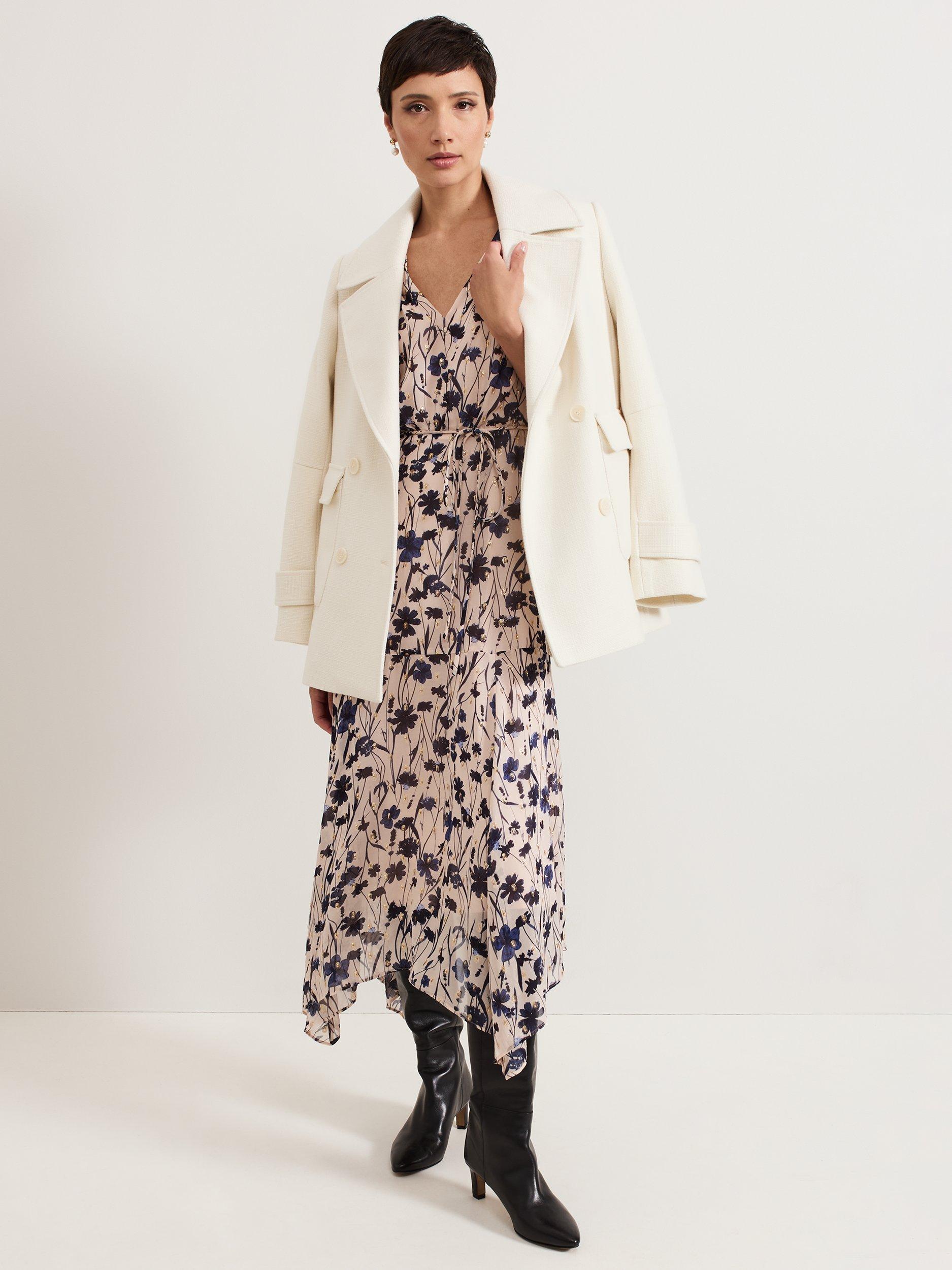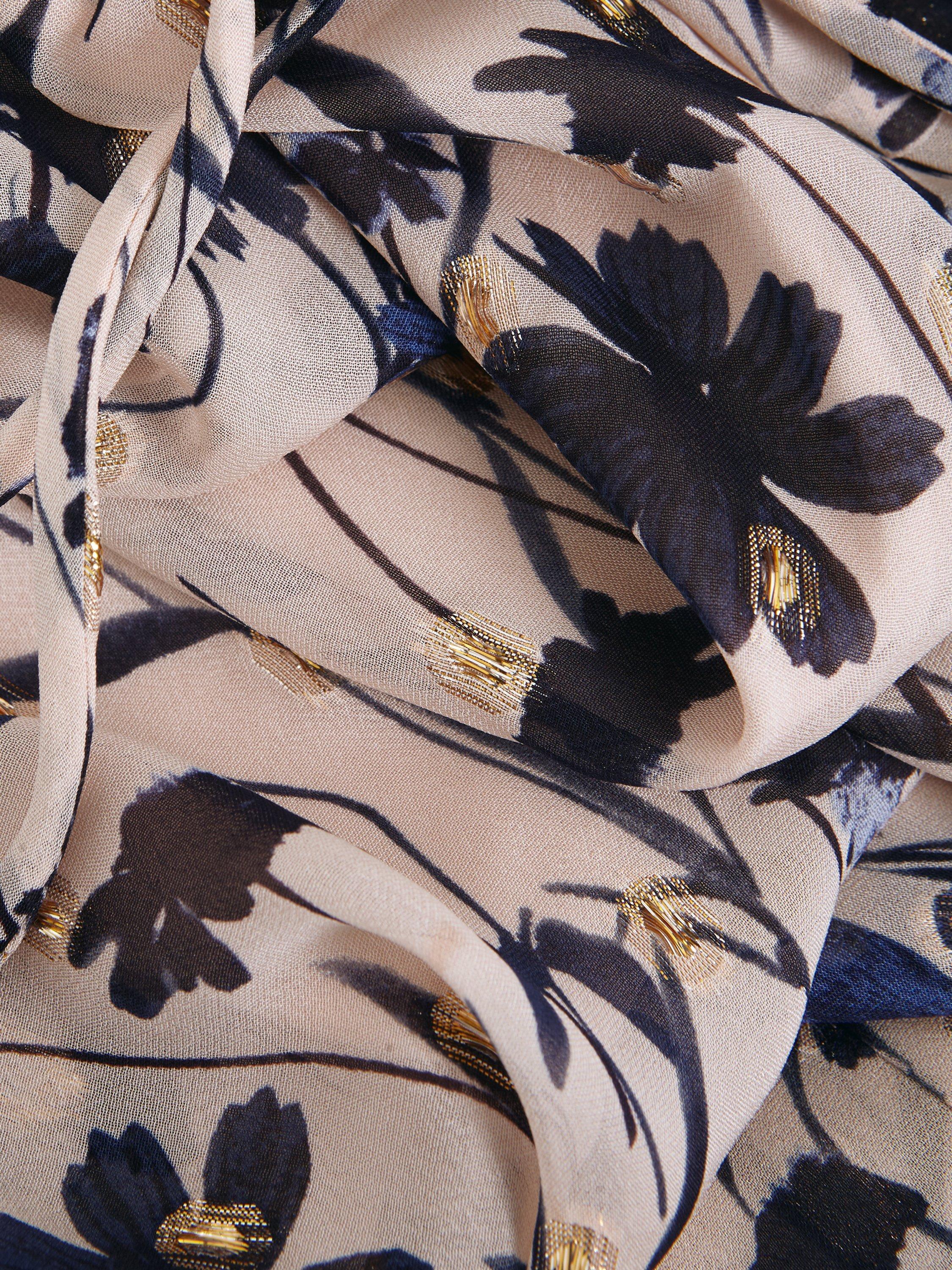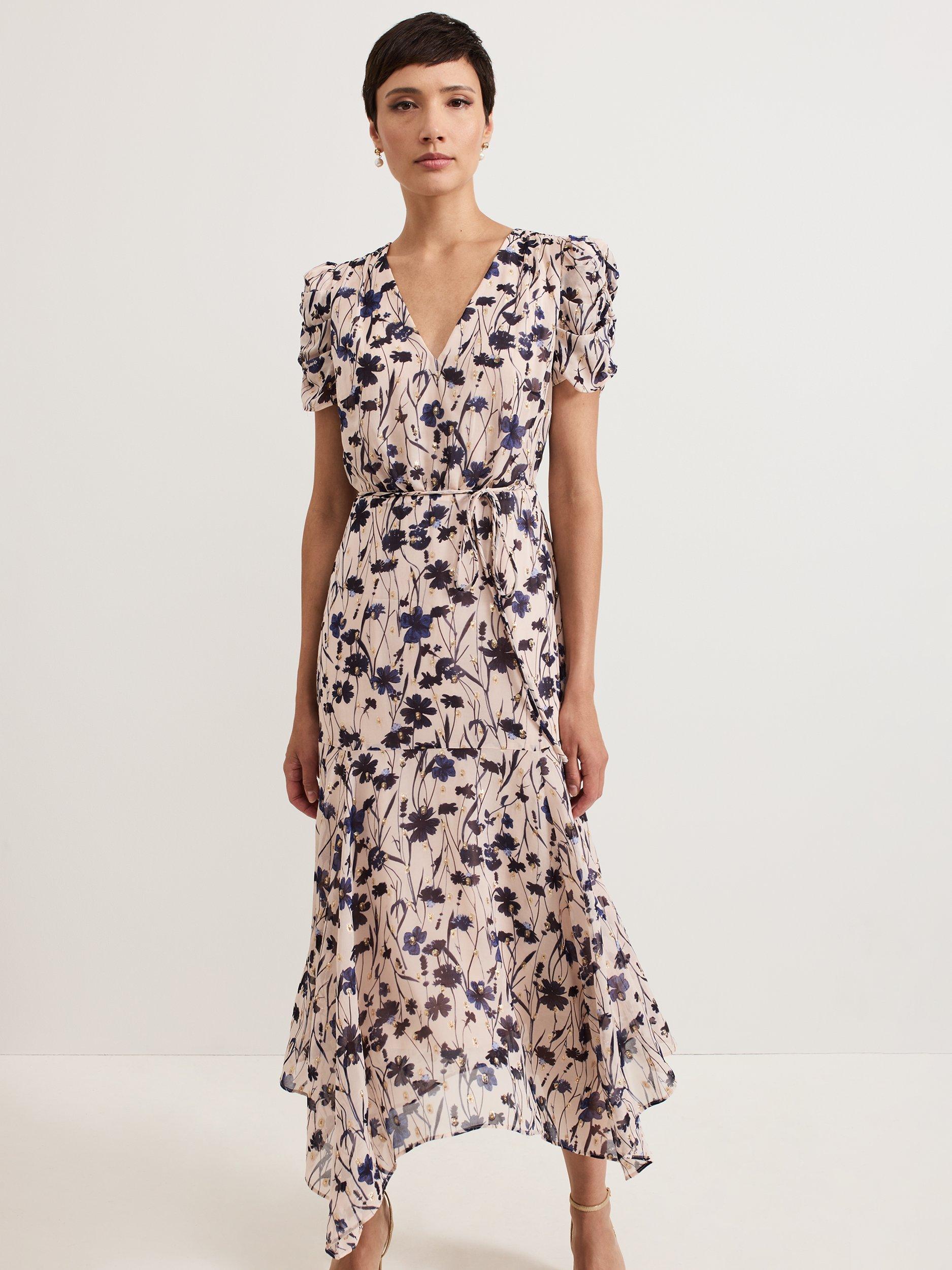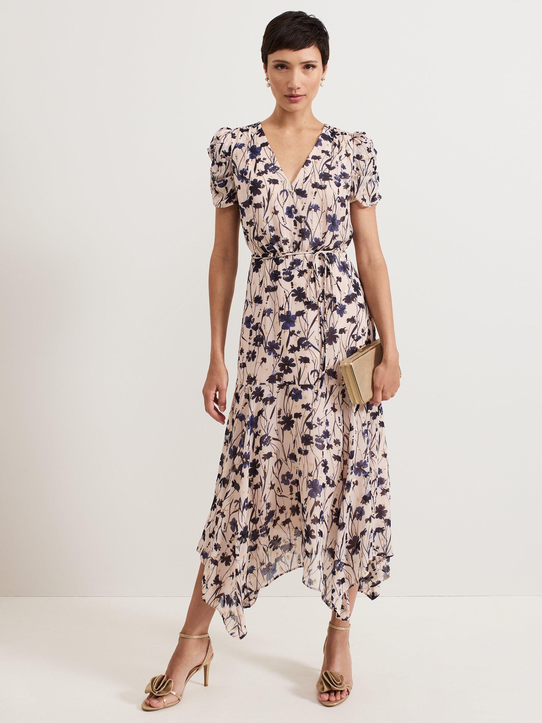 Embrace elegant florals with the Verity dress. Full of beautiful detailing, this midi dress has ruched sleeves to create a gathered effect, falling to a midi length with an asymmetric hem. Flecks of gold detailing subtly catch the light as you move, the perfect feminine style for all your upcoming occasions.