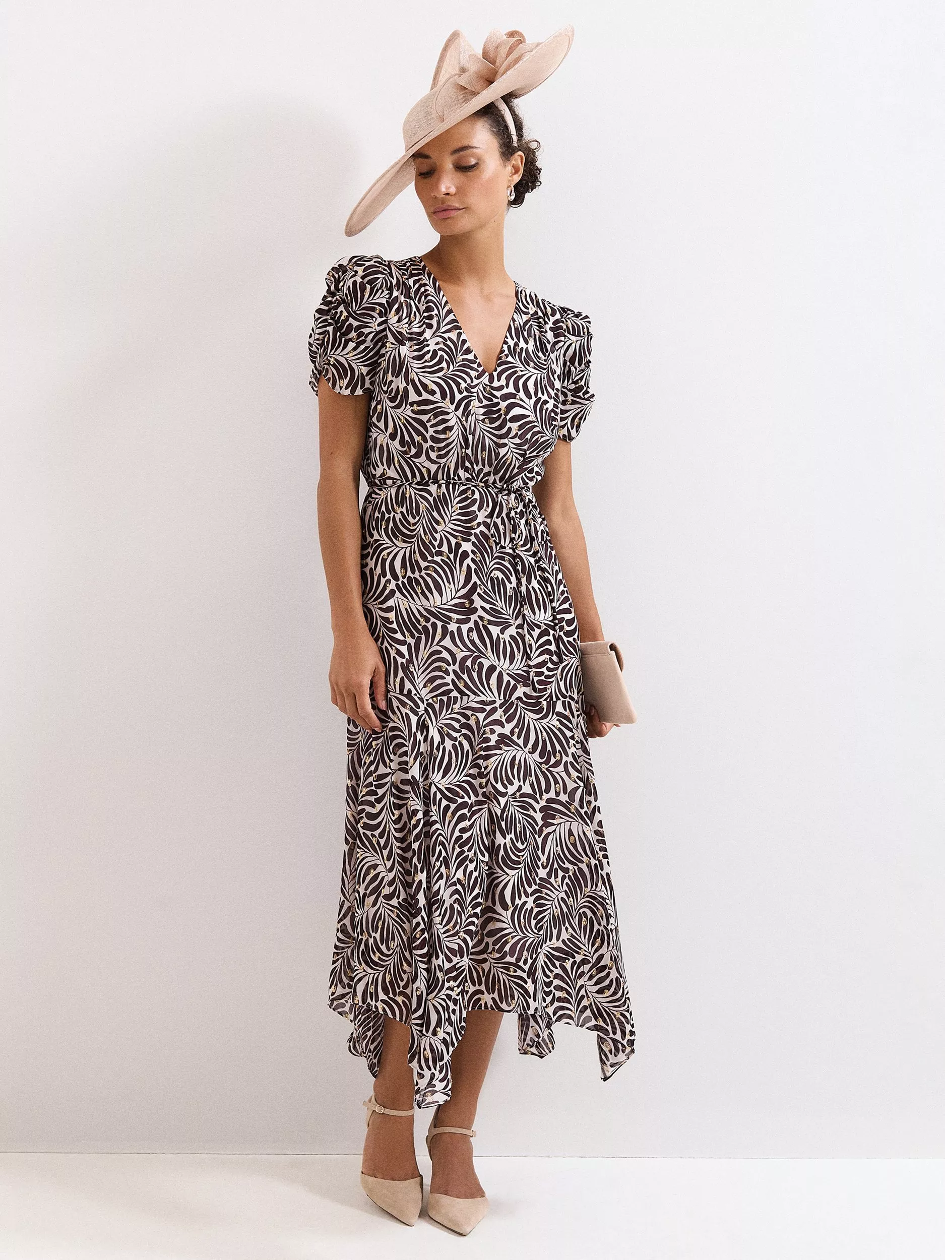 Phase Eight midi dress, featuring a striking leaf pattern, shimmering details, and a wrap silhouette. Soft lining ensures you stay comfortable while the clever keyhole back adds a touch of unexpected charm.