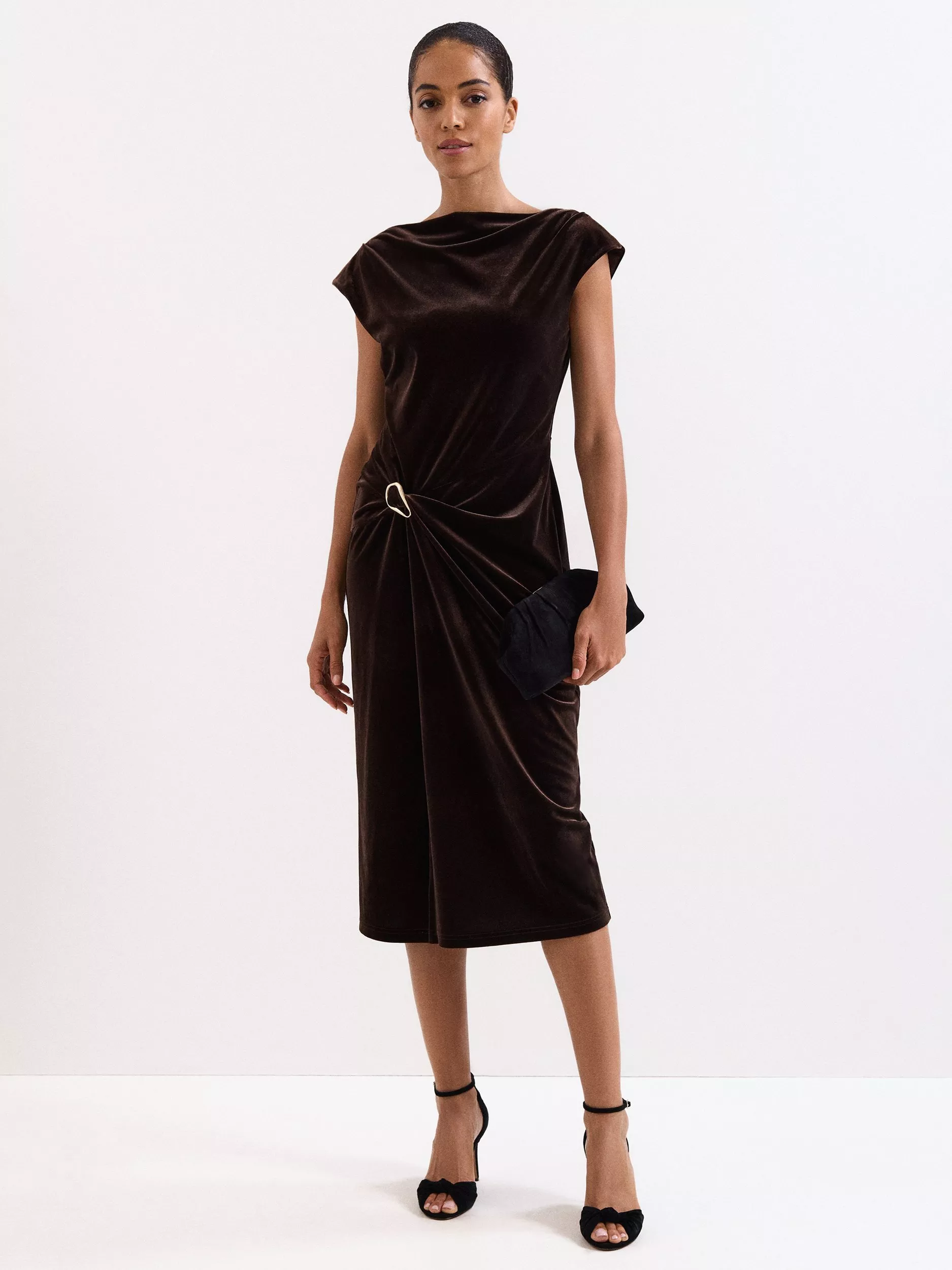 This cap sleeved midi dress by Phase Eight is characterised by a boat neckline and boasts a pencil silhouette that gathers at the front.