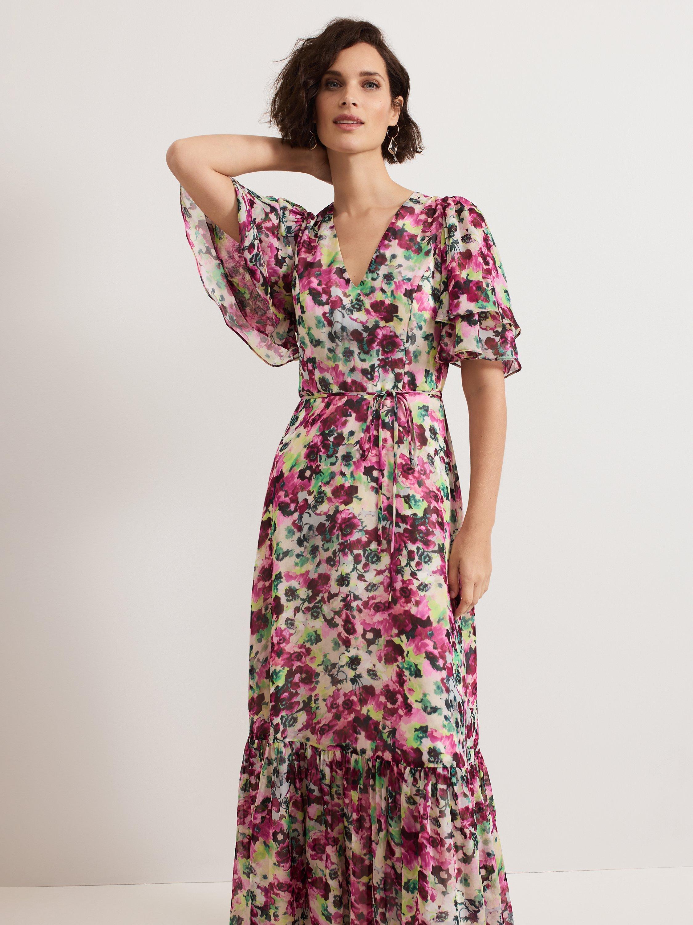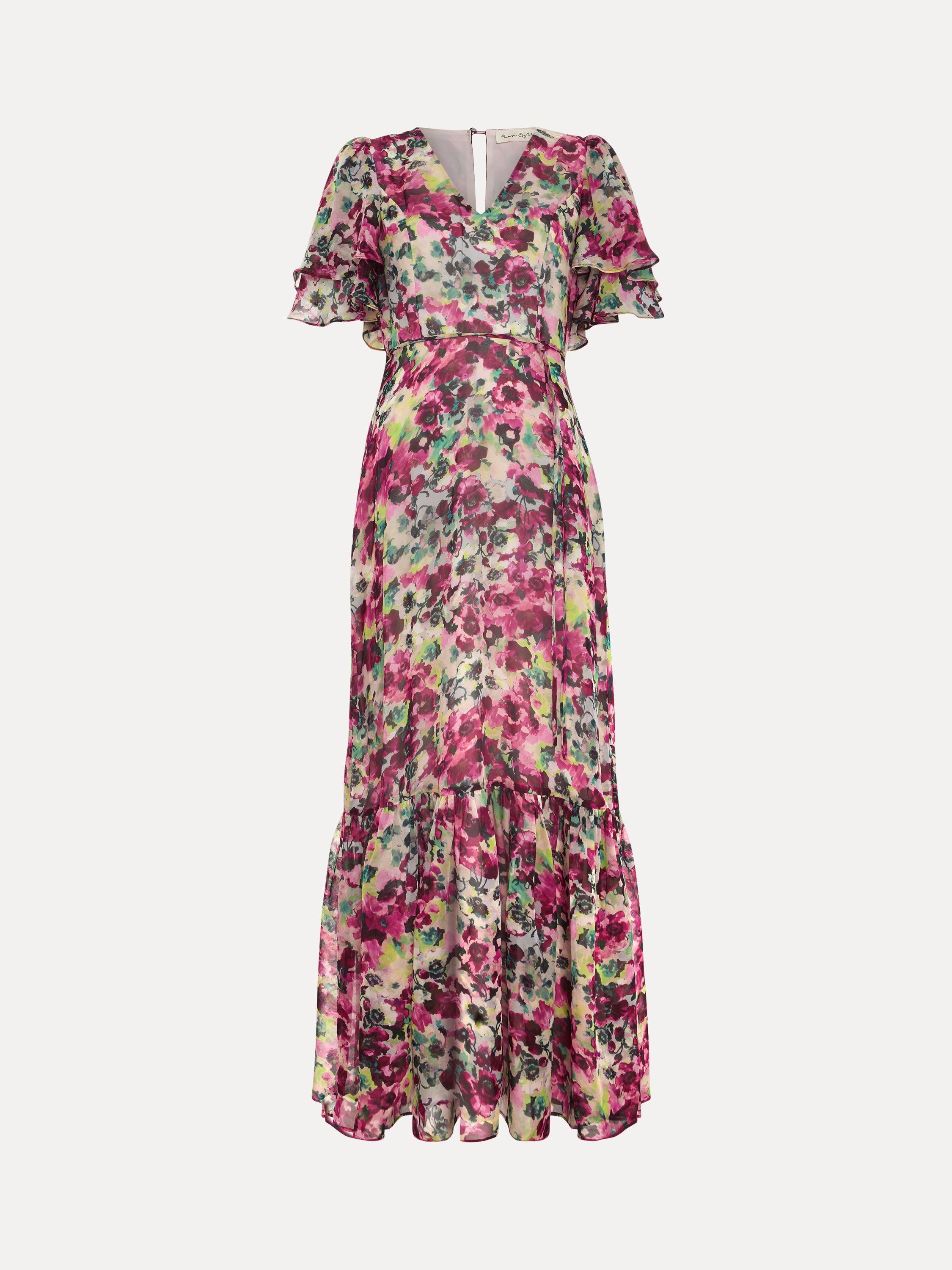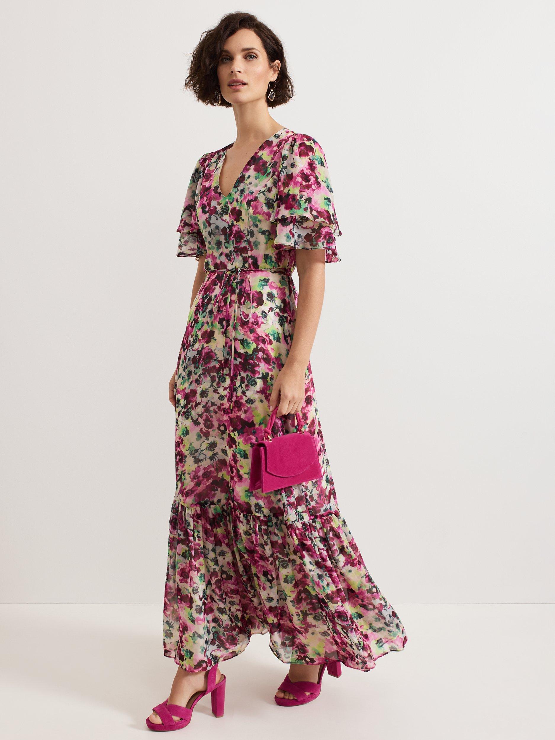 Falling to an A-line silhouette with a fluted hem, this floor-length dress from Phase Eight features a v-neckline, short floaty angel sleeves and an all-over floral print.