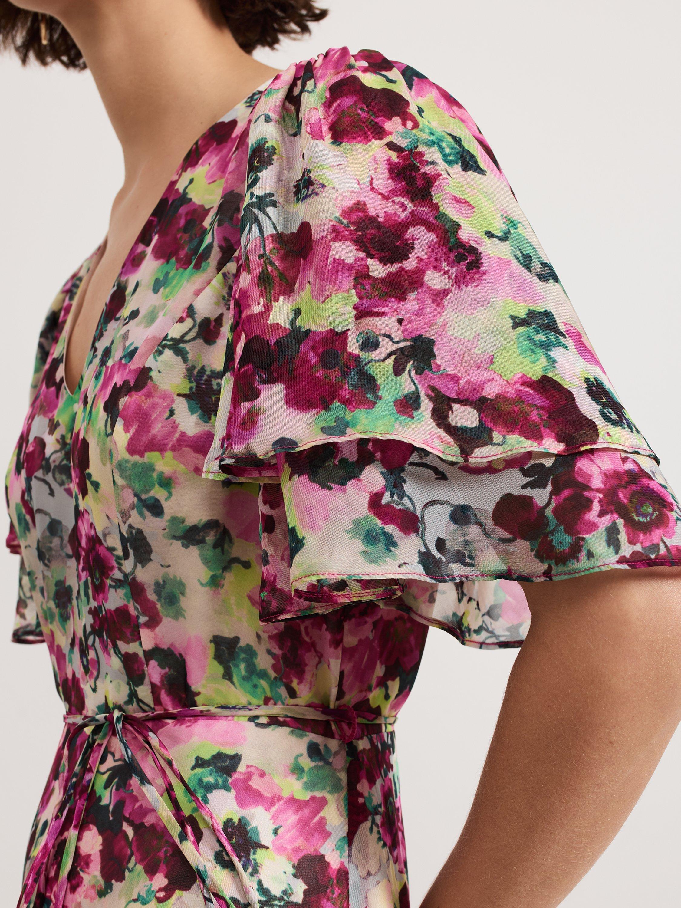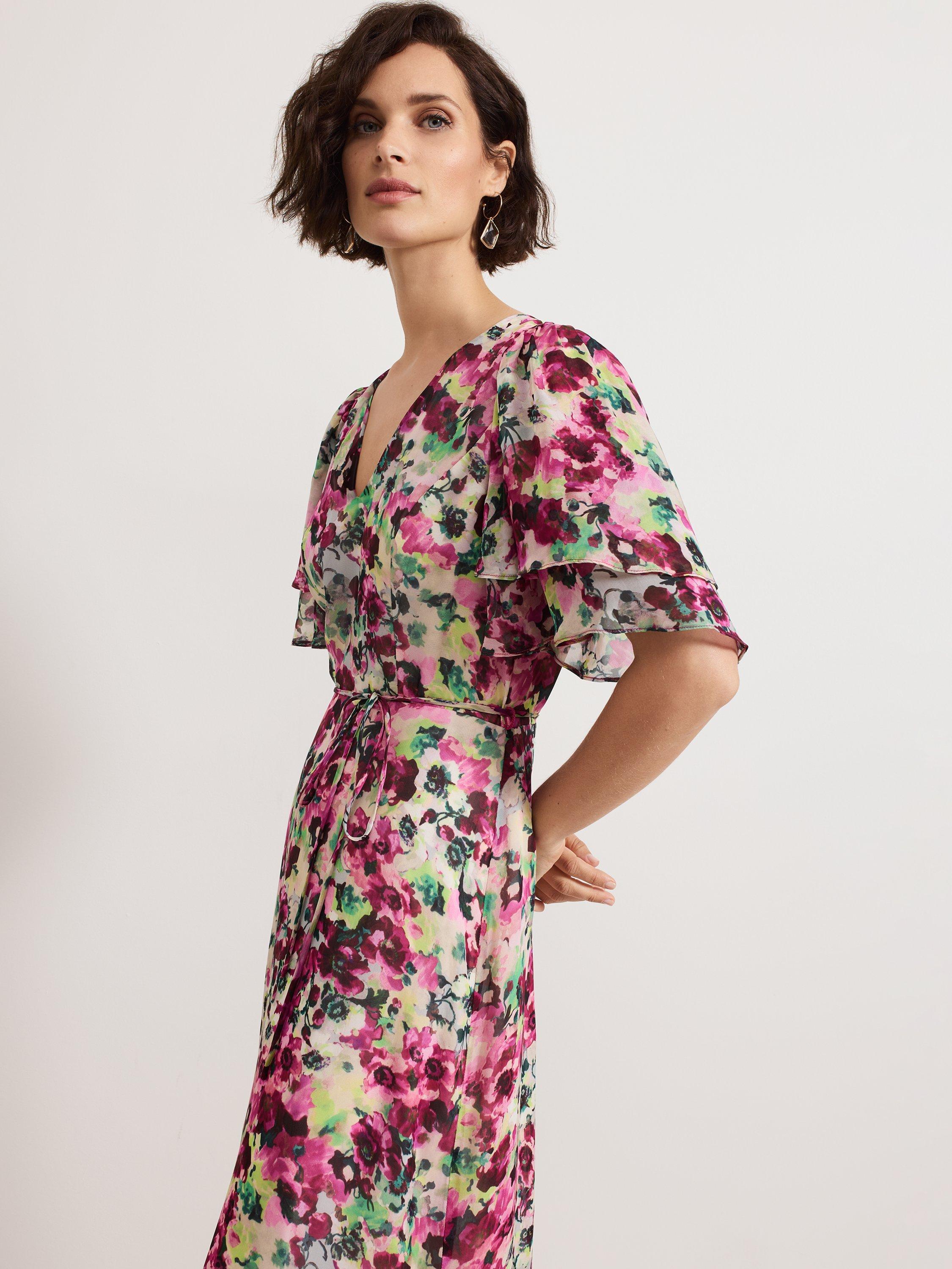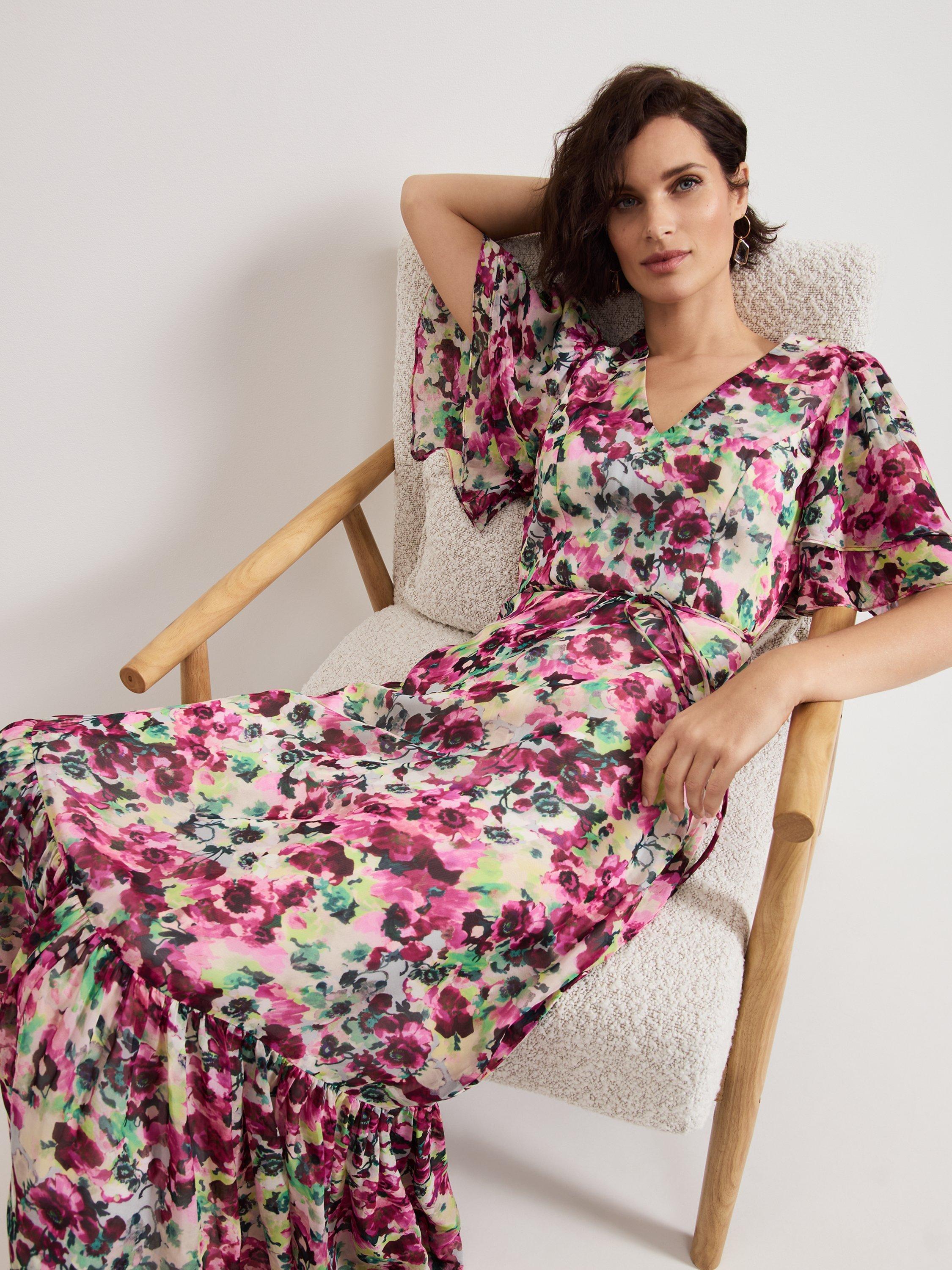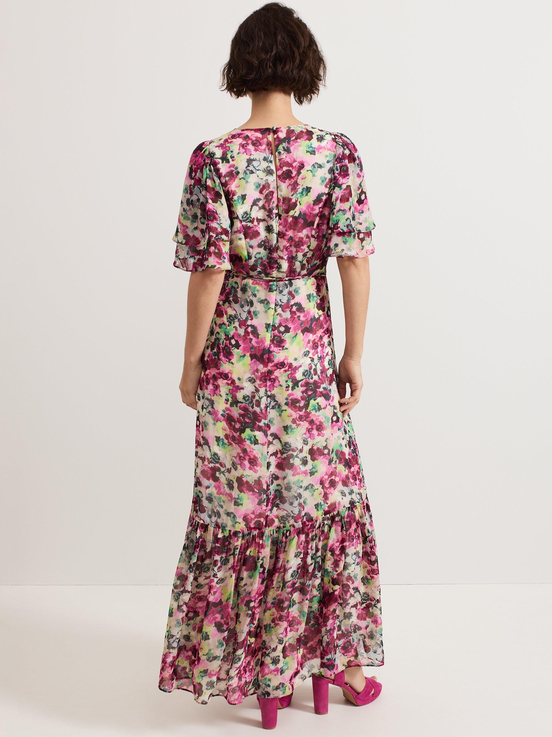 Falling to an A-line silhouette with a fluted hem, this floor-length dress from Phase Eight features a v-neckline, short floaty angel sleeves and an all-over floral print.