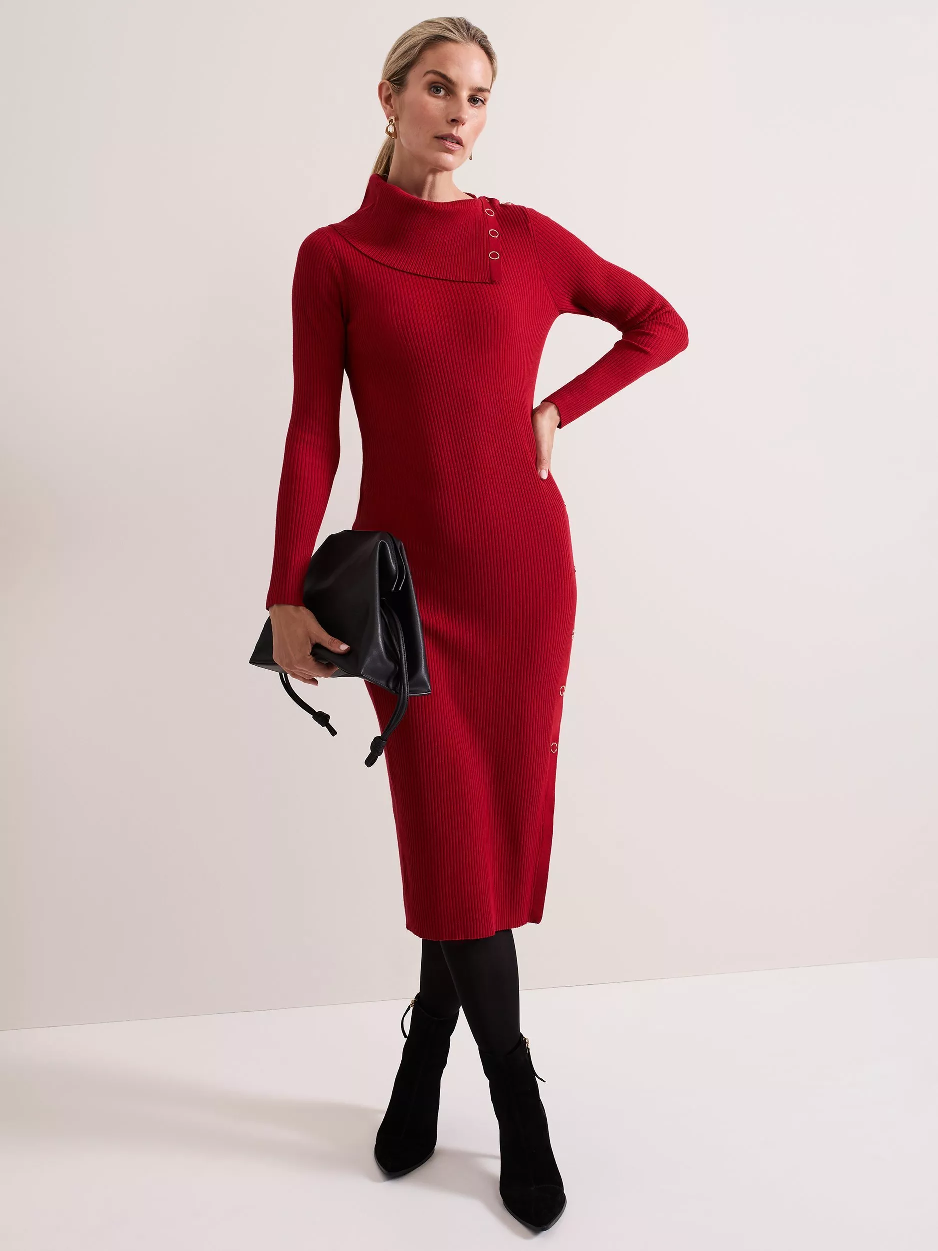 Featuring long sleeves and a foldover neck, our Willow dress layers effortlessly under coats and jackets. The ribbed column shape skims the body to enhance your figure whilst asymmetric gold popper detailing adds a statement finish.