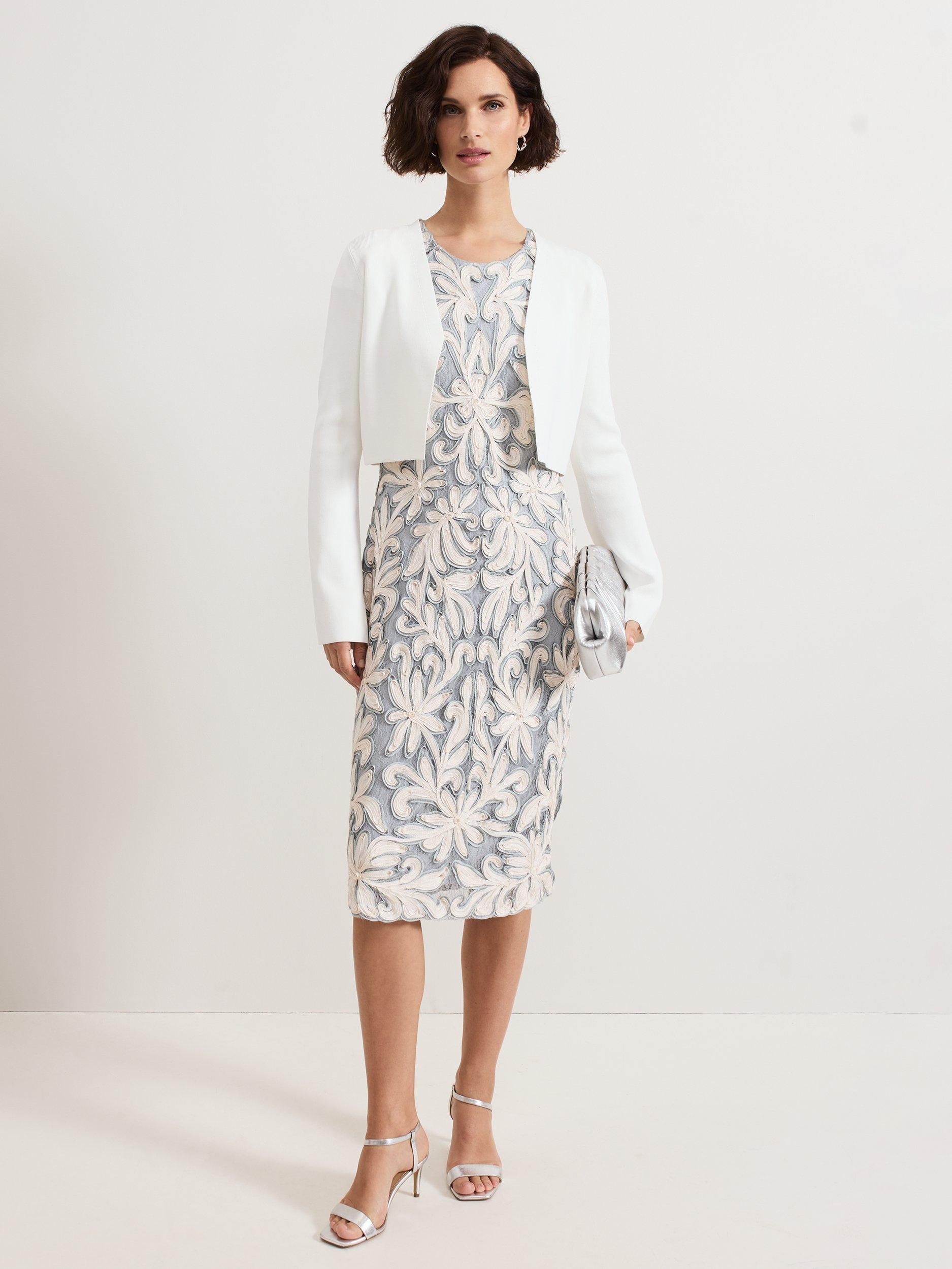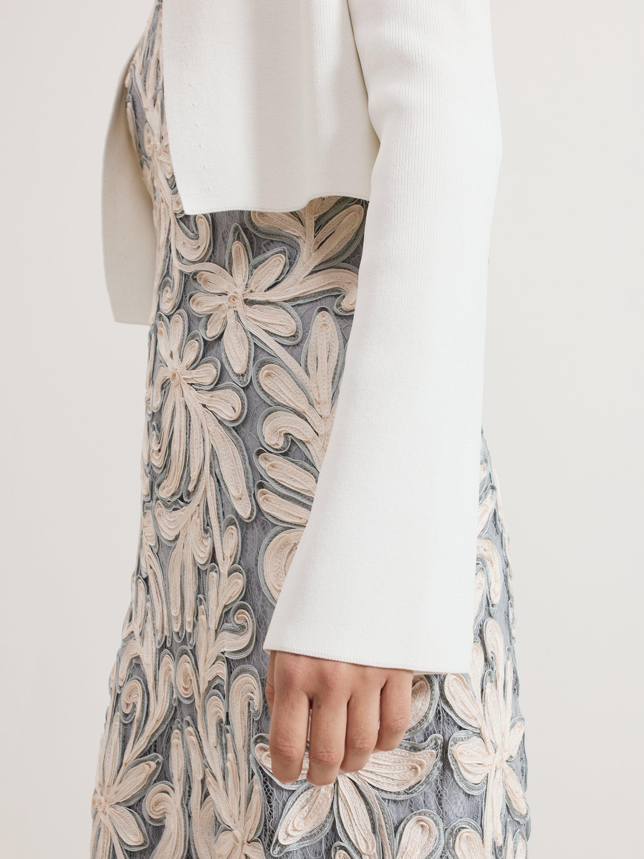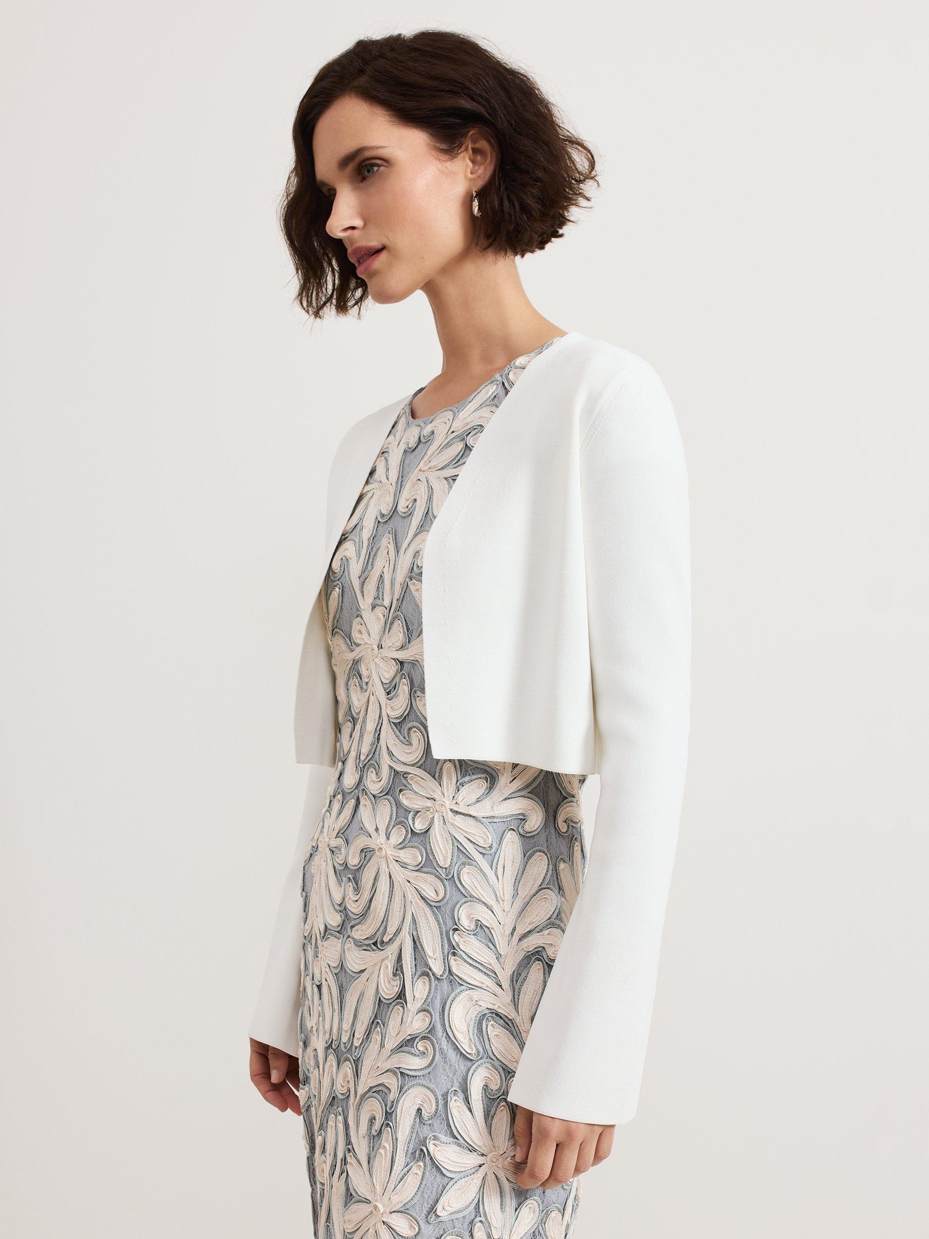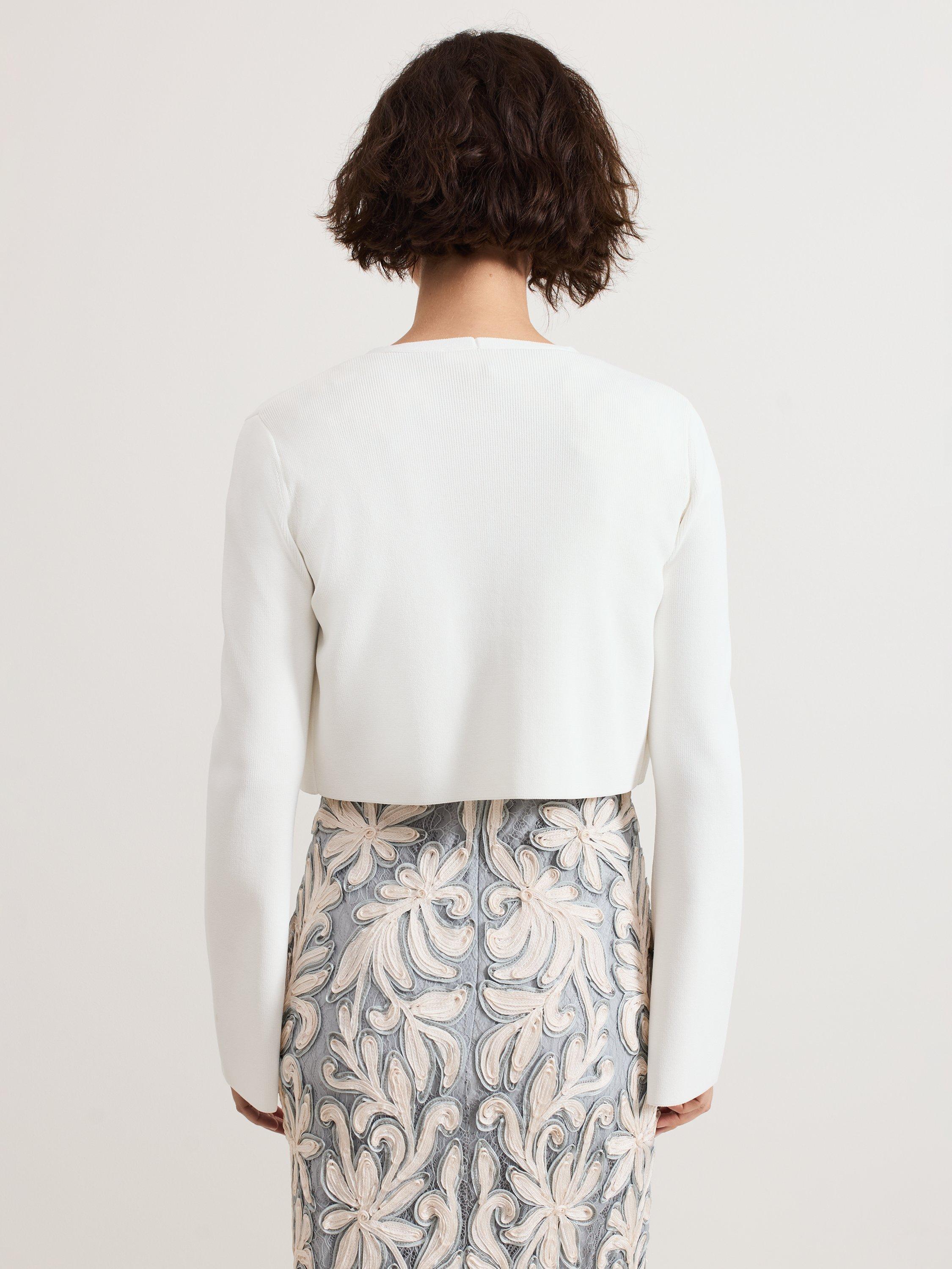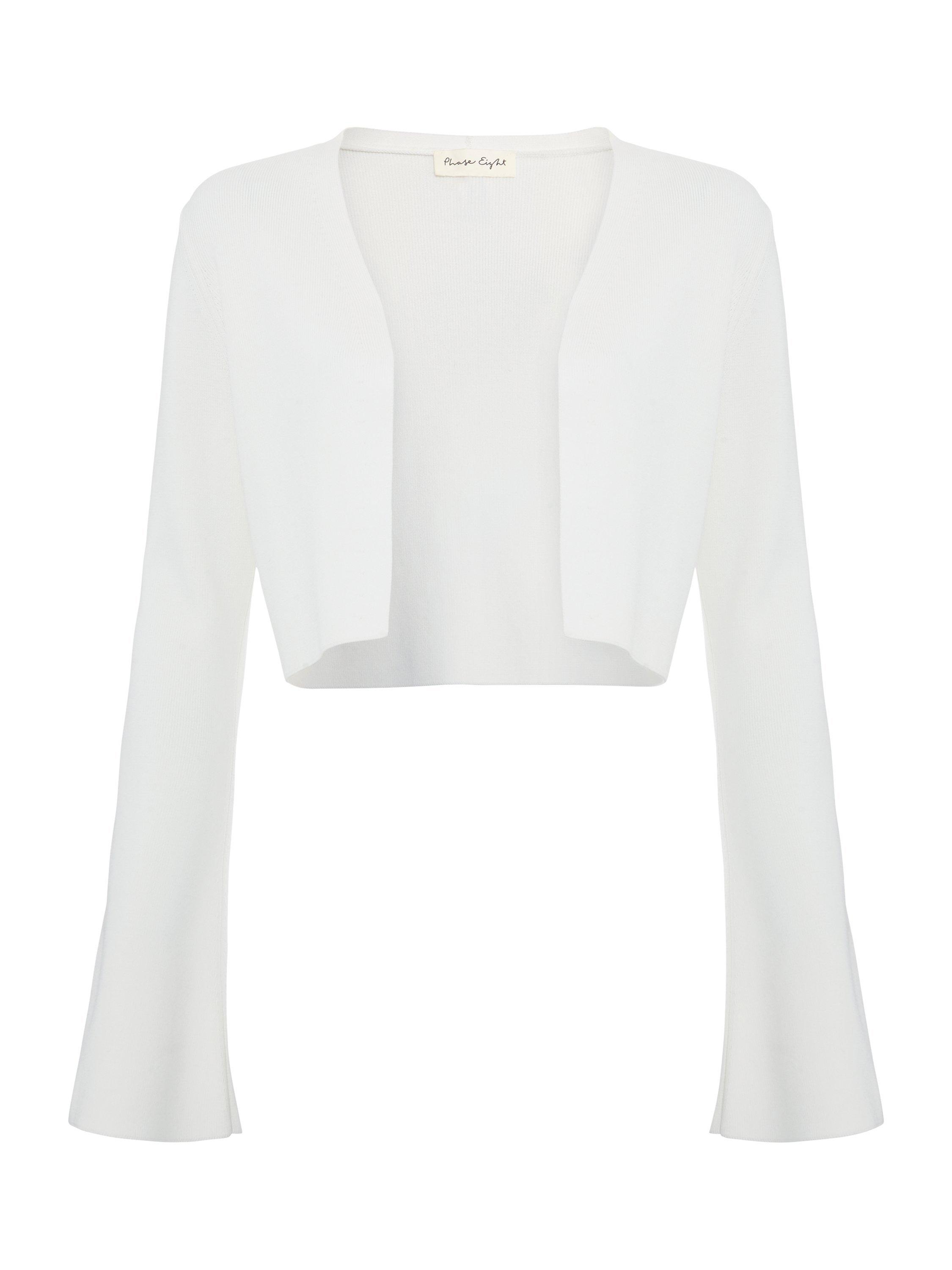 The Yasmin cardigan is a style that you can wear all year round. In a fine knit, this cropped cardigan is finished with fluted sleeves to create a feminine layering piece, perfect to pair over your favourite day and night styles.