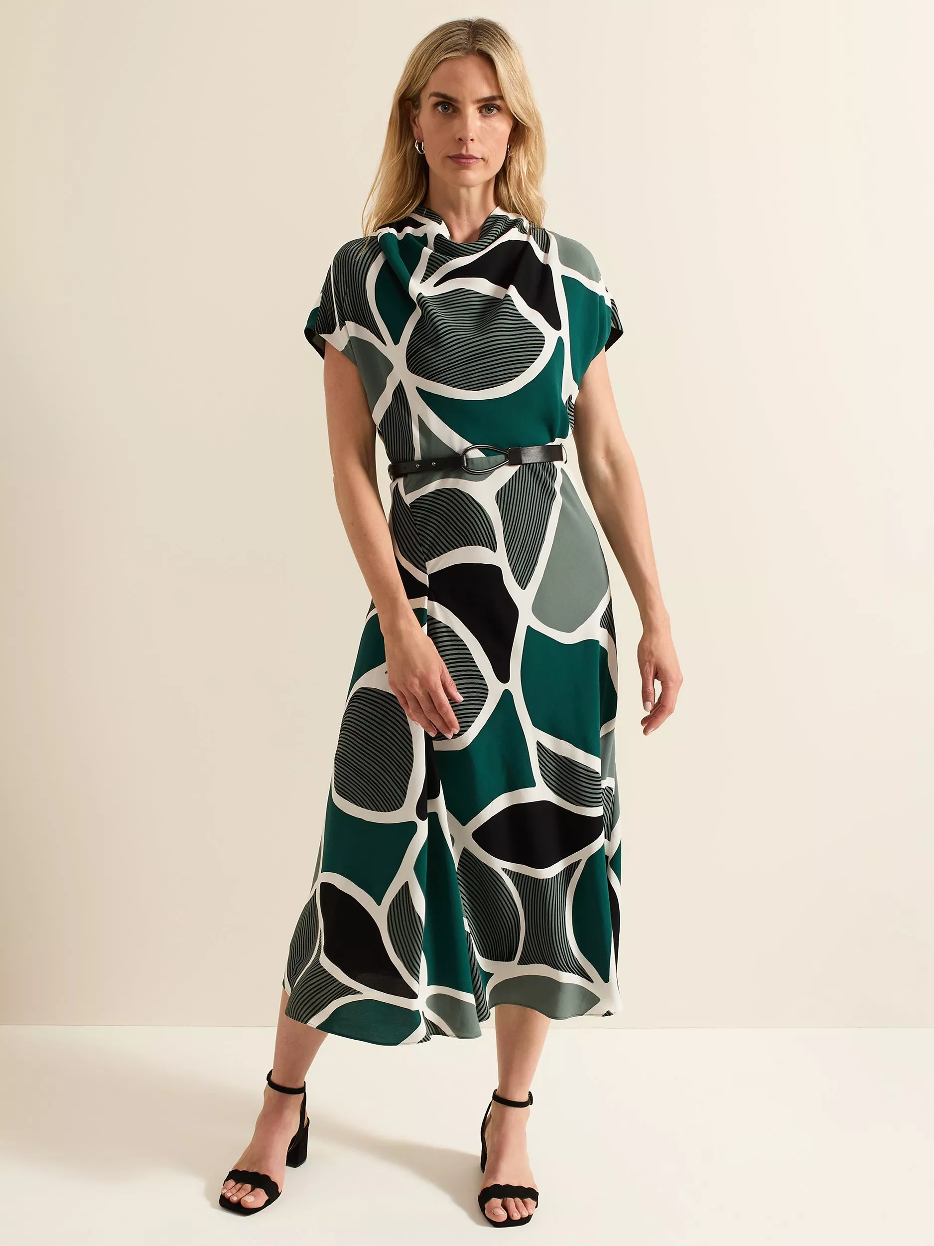Designed in an abstract print our Zaynab dress features a feminine cowl neck and is framed by short sleeves. With a contrast belt that highlights the waist the skirt falls to a relaxed midaxi length.