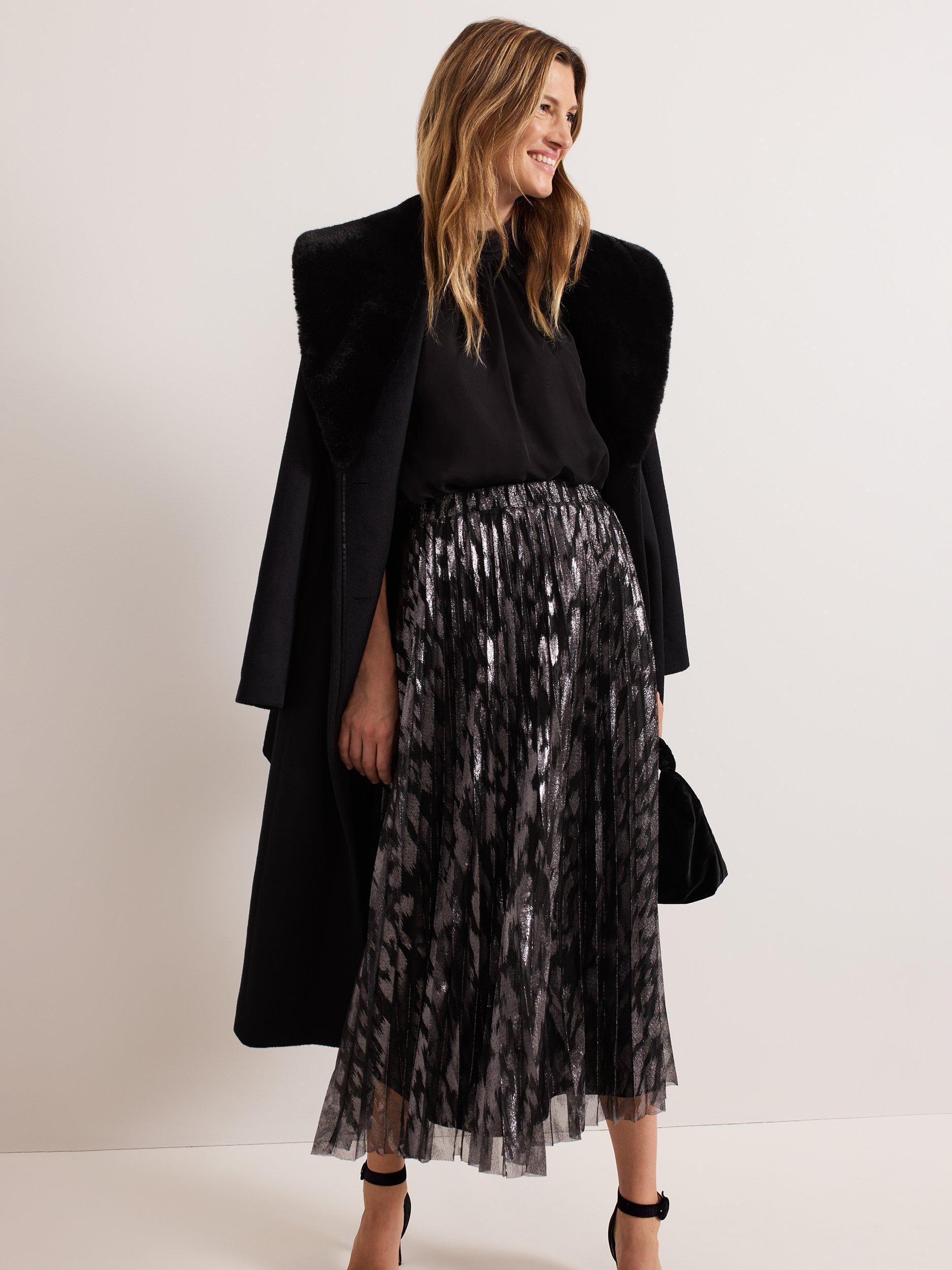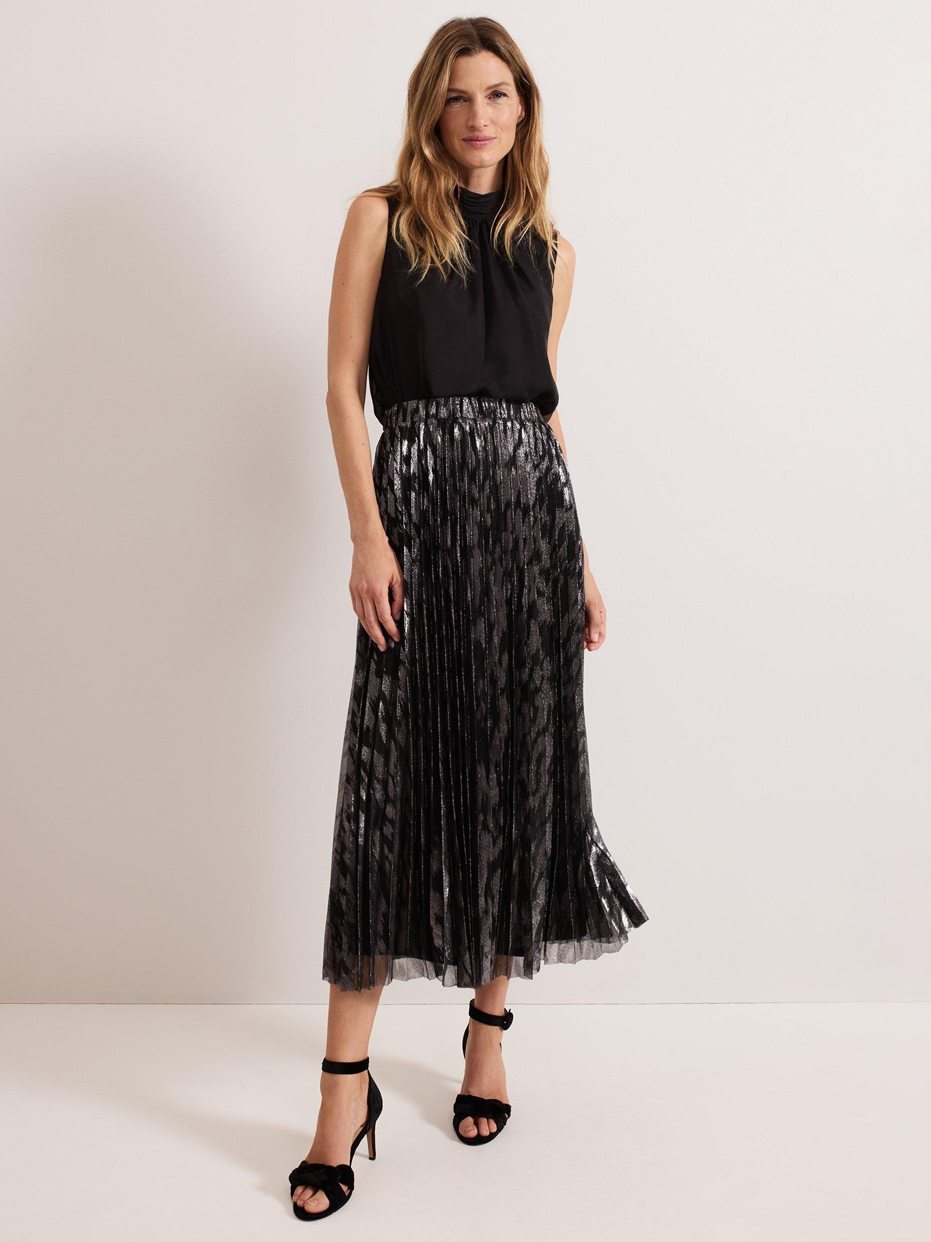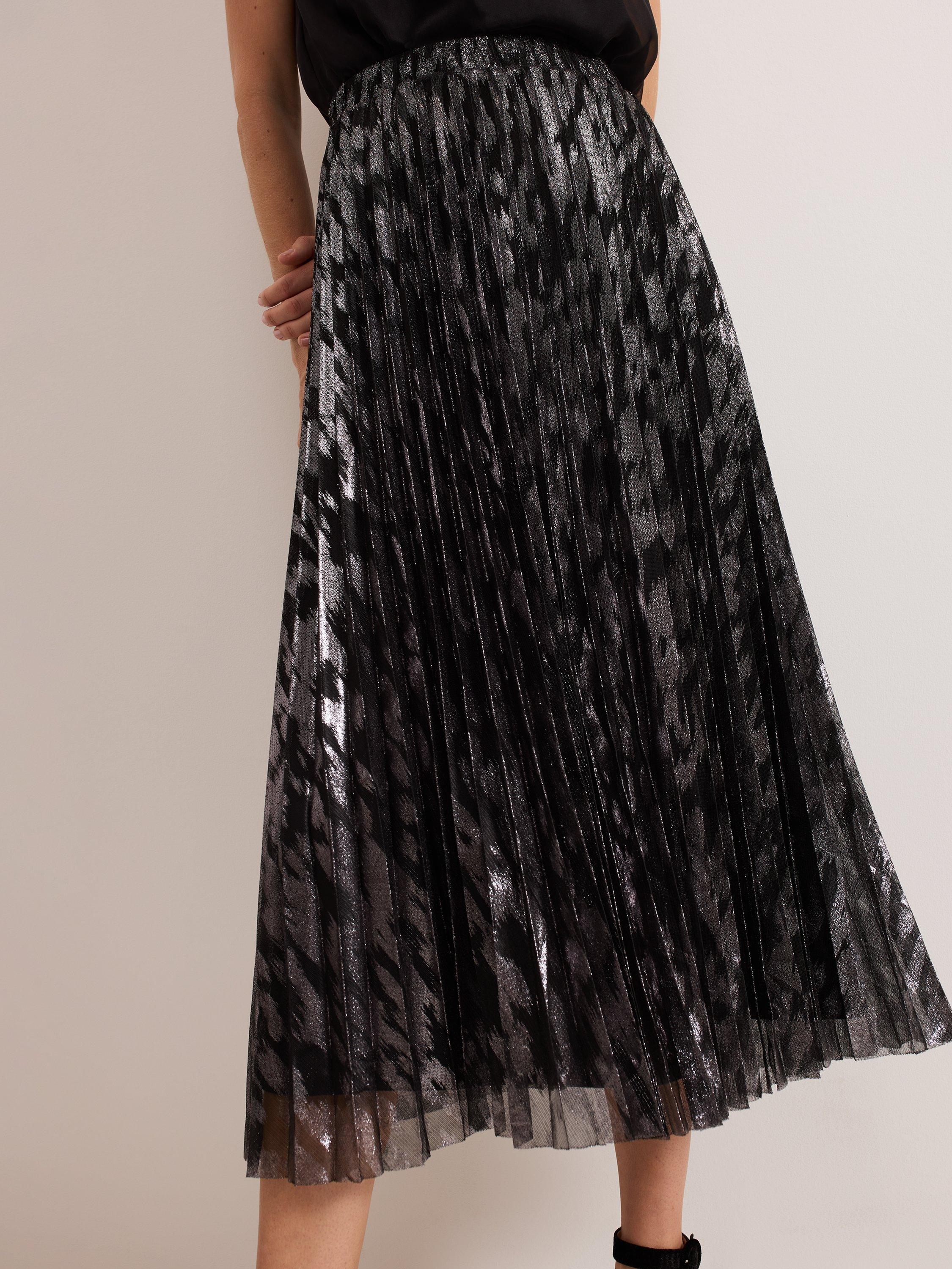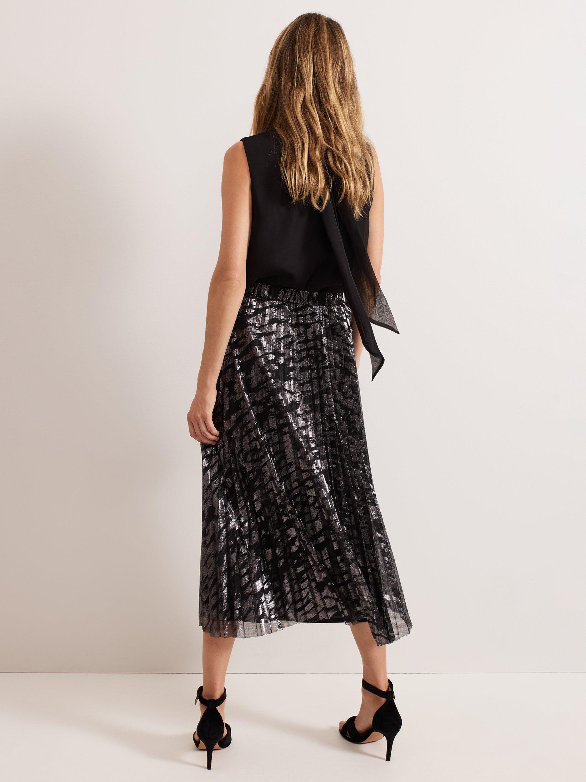 Maintain a polished look all day and night with this metallic skirt. Designed with a metallic foil effect, this skirt falls to a fully pleated flowing midi, which is lined and fastens with a zip at the waist. Pair with your favourite monochromatic top for a standout look.