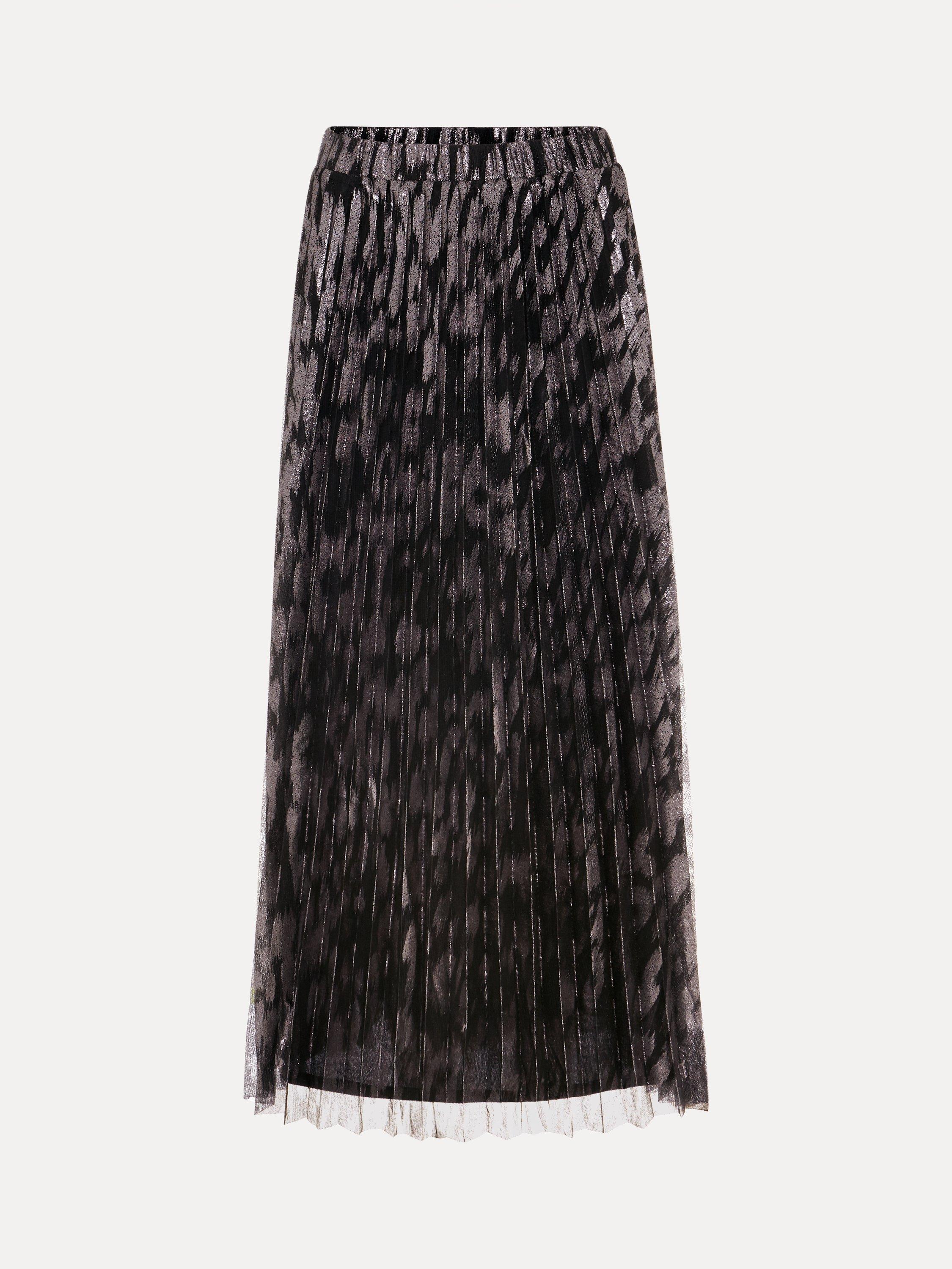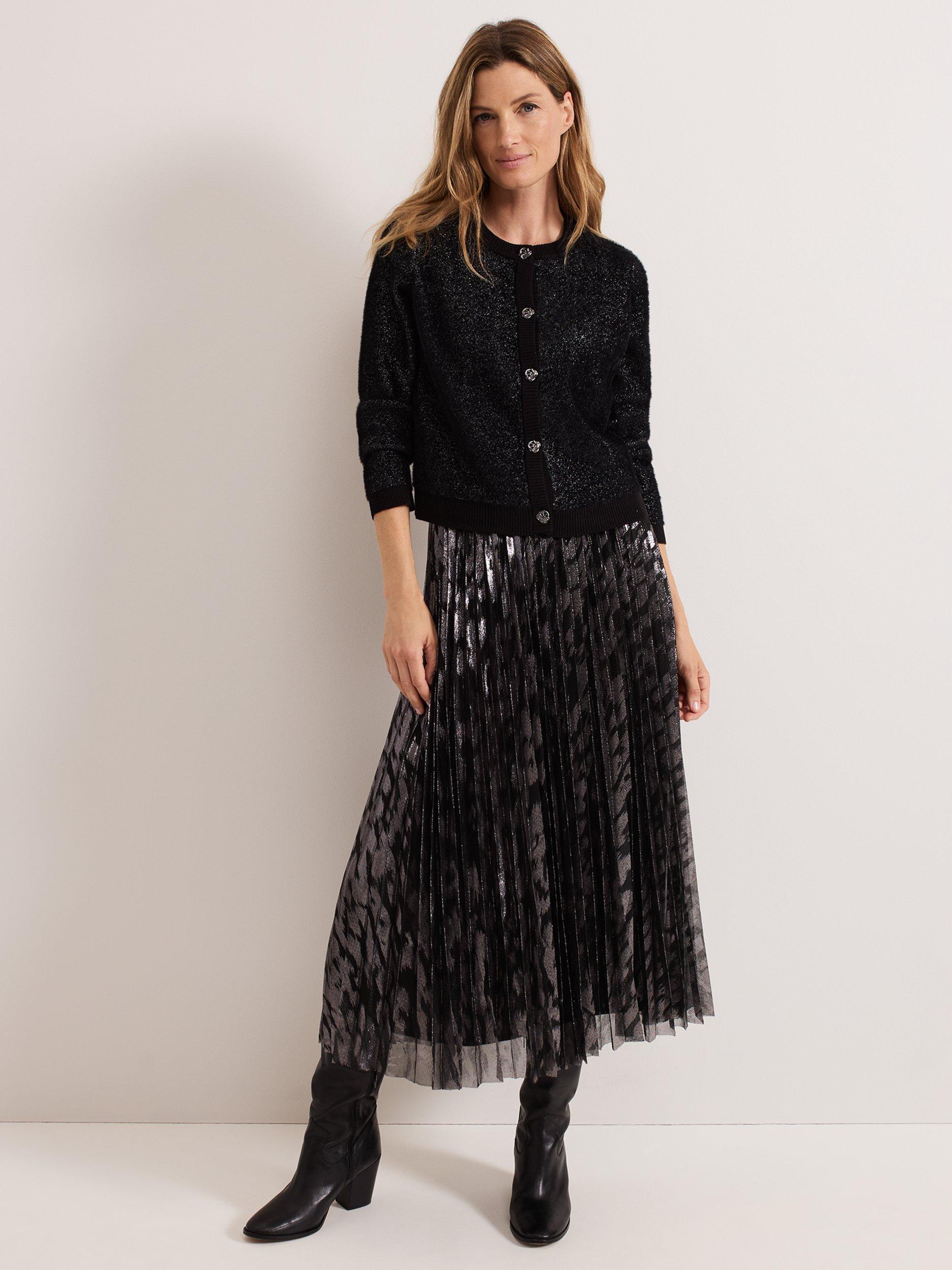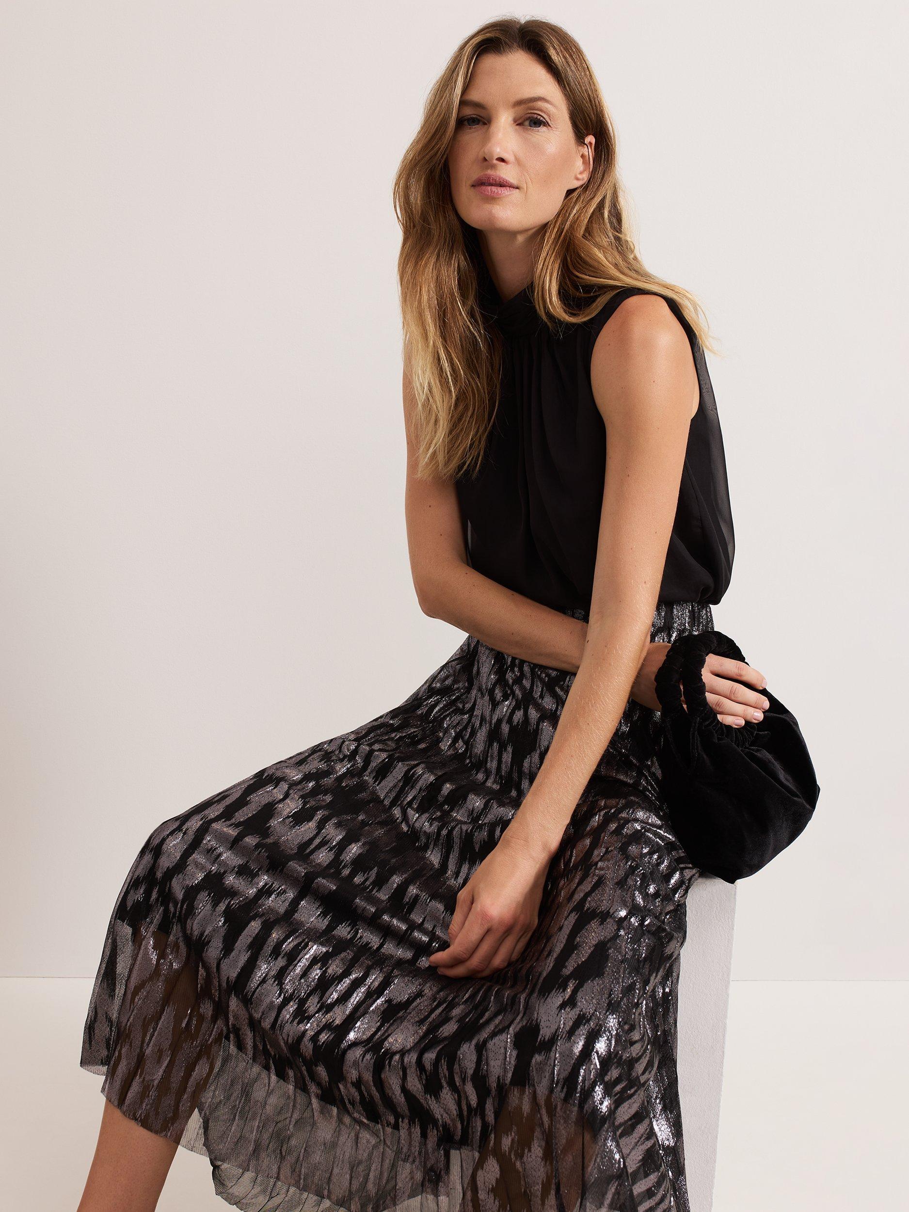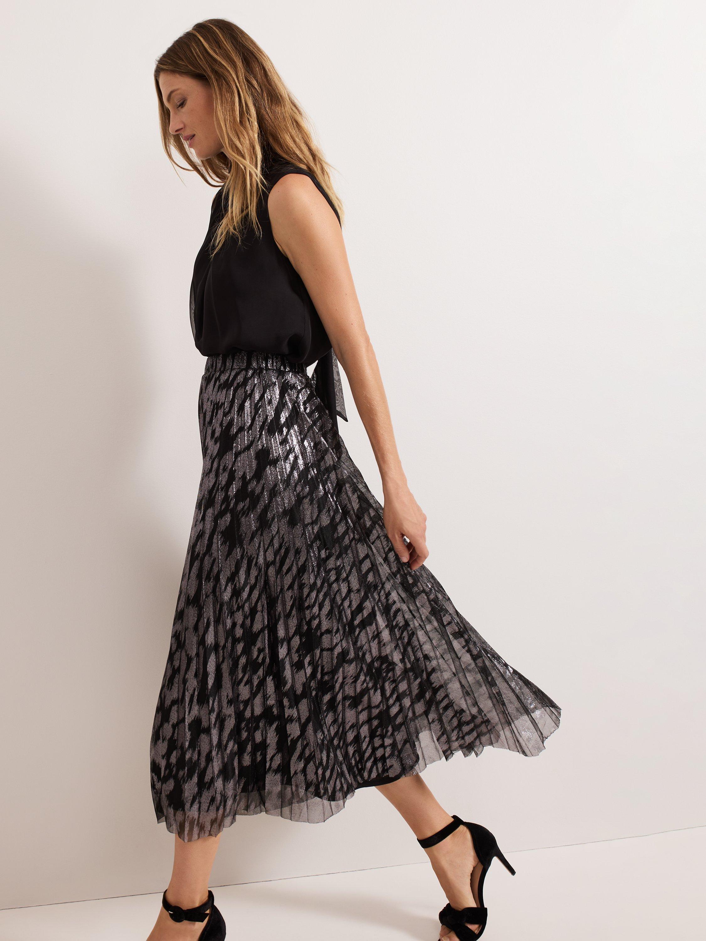 Maintain a polished look all day and night with this metallic skirt. Designed with a metallic foil effect, this skirt falls to a fully pleated flowing midi, which is lined and fastens with a zip at the waist. Pair with your favourite monochromatic top for a standout look.