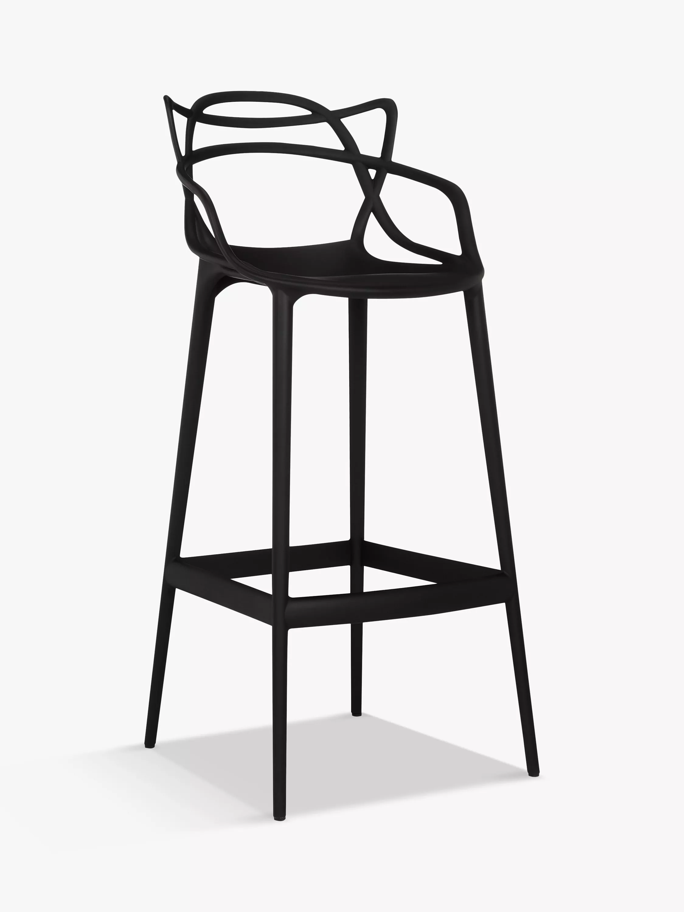 In the bar stool version of the Masters chair, the legs lengthen and the seat becomes more compact, but the unmistakable graphic style of its structure remains the same. Designed by Philippe Starck in collaboration with Eugeni Quitllet, it's a hybrid of three iconic Kartell designs: 'Serie 7' by Arne Jacobsen, the 'Tulip Armchair' by Eero Saarinen and the 'Eiffel Chair' by Charles Eames. Made from sturdy polypropylene, it's lightweight, practical and it also be used outdoors. Contains 100% recycled materials.