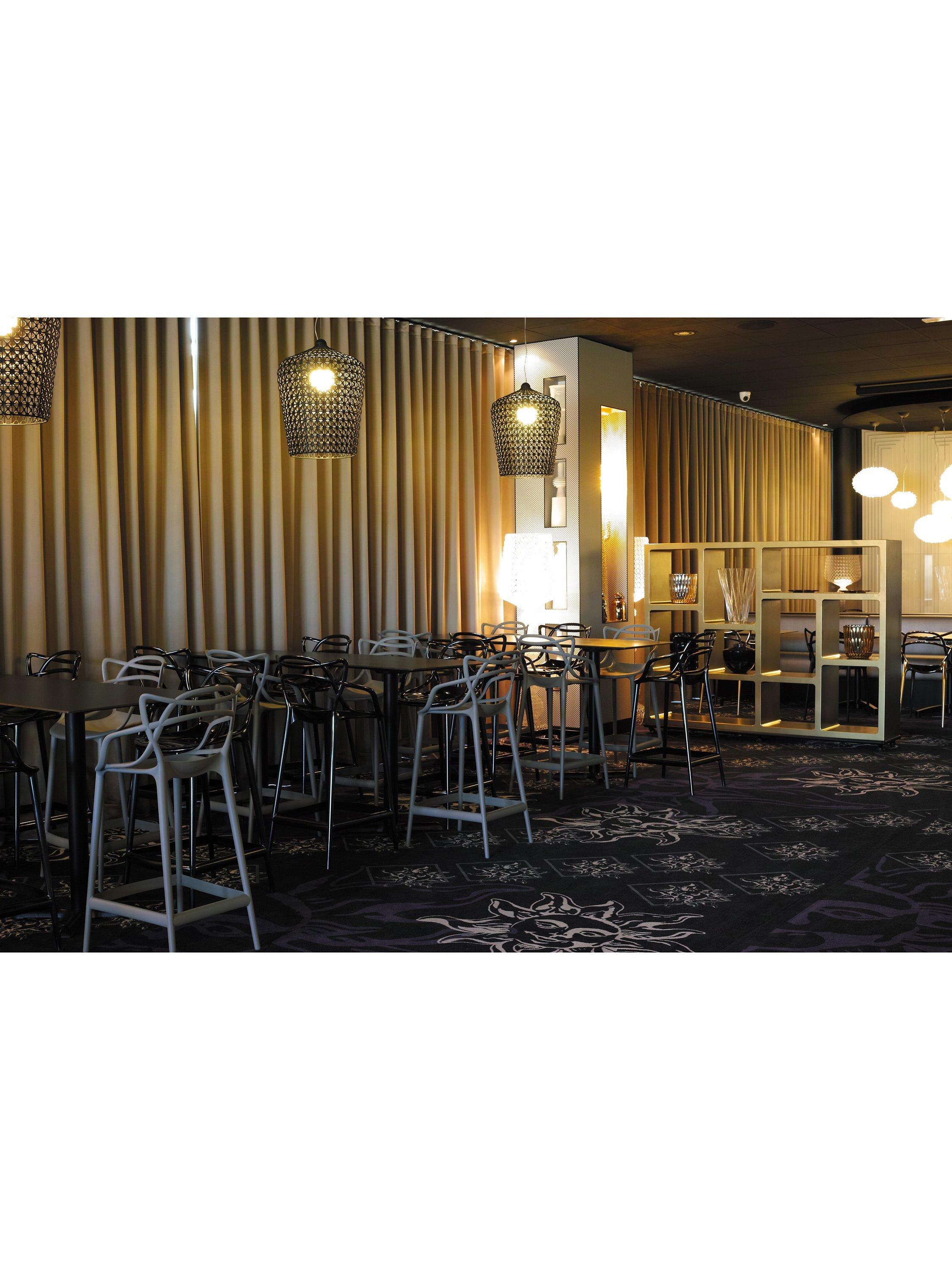 In the bar stool version of the Masters chair, the legs lengthen and the seat becomes more compact, but the unmistakable graphic style of its structure remains the same. Designed by Philippe Starck in collaboration with Eugeni Quitllet, it's a hybrid of three iconic Kartell designs: 'Serie 7' by Arne Jacobsen, the 'Tulip Armchair' by Eero Saarinen and the 'Eiffel Chair' by Charles Eames. Made from sturdy polypropylene, it's lightweight, practical and it also be used outdoors. Contains 100% recycled materials.