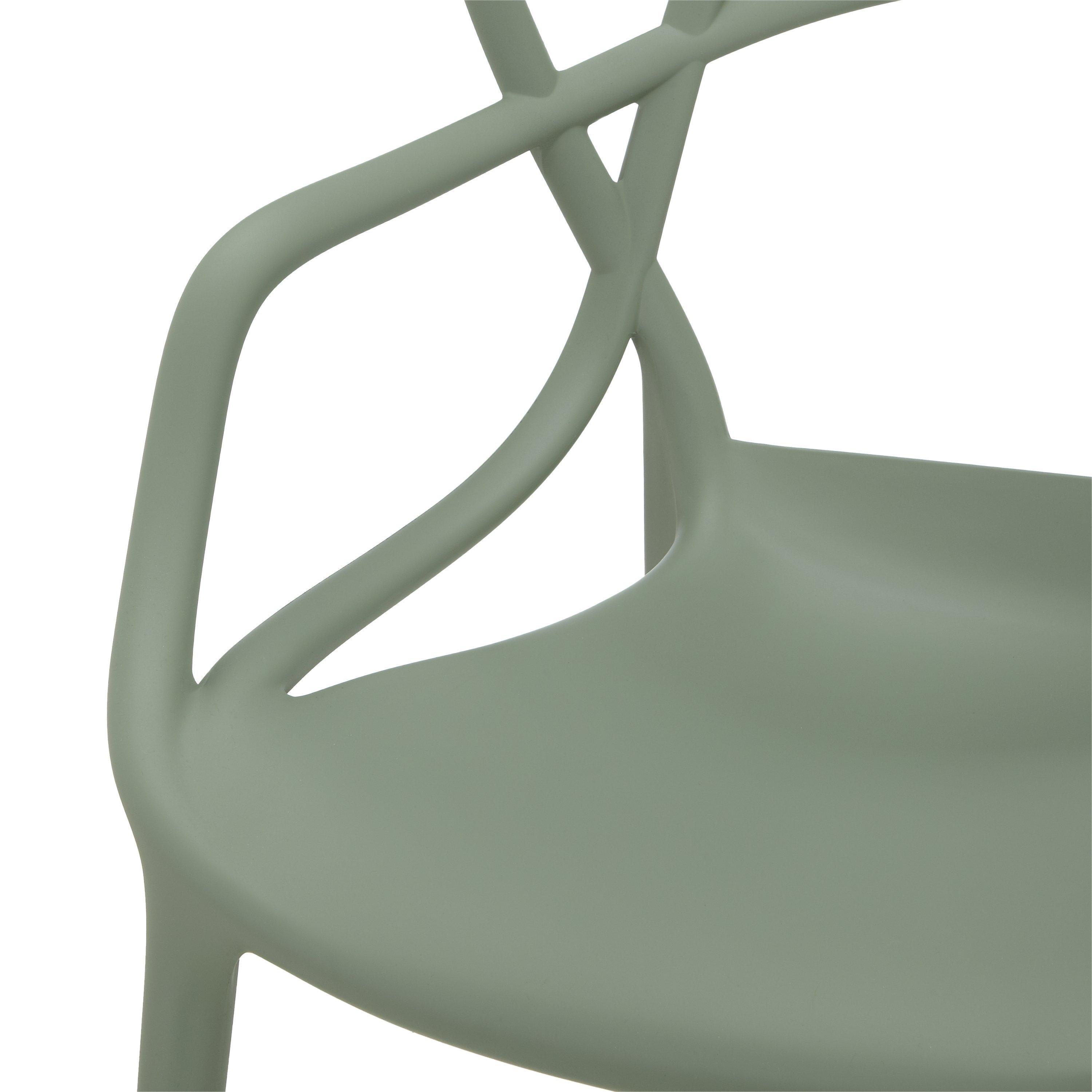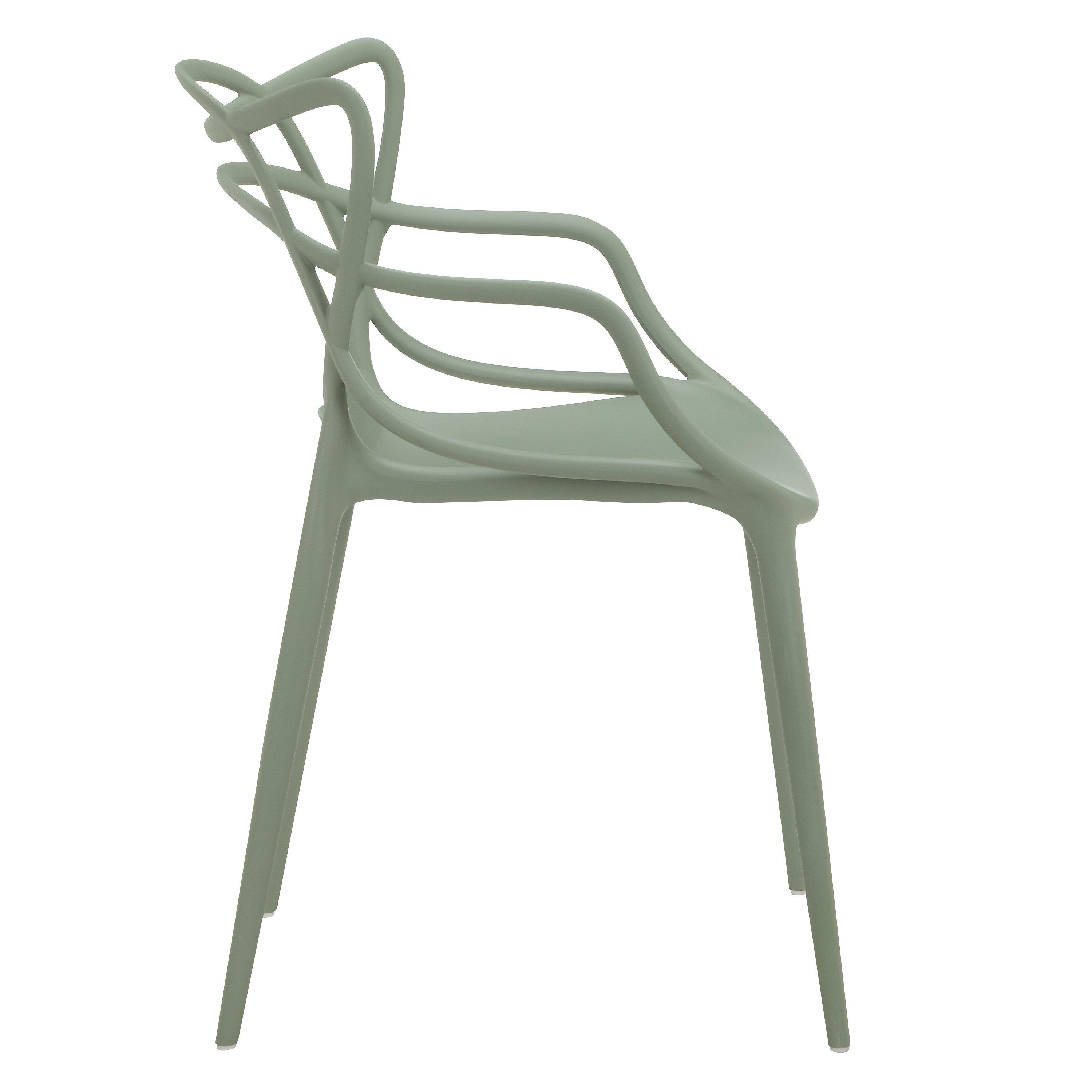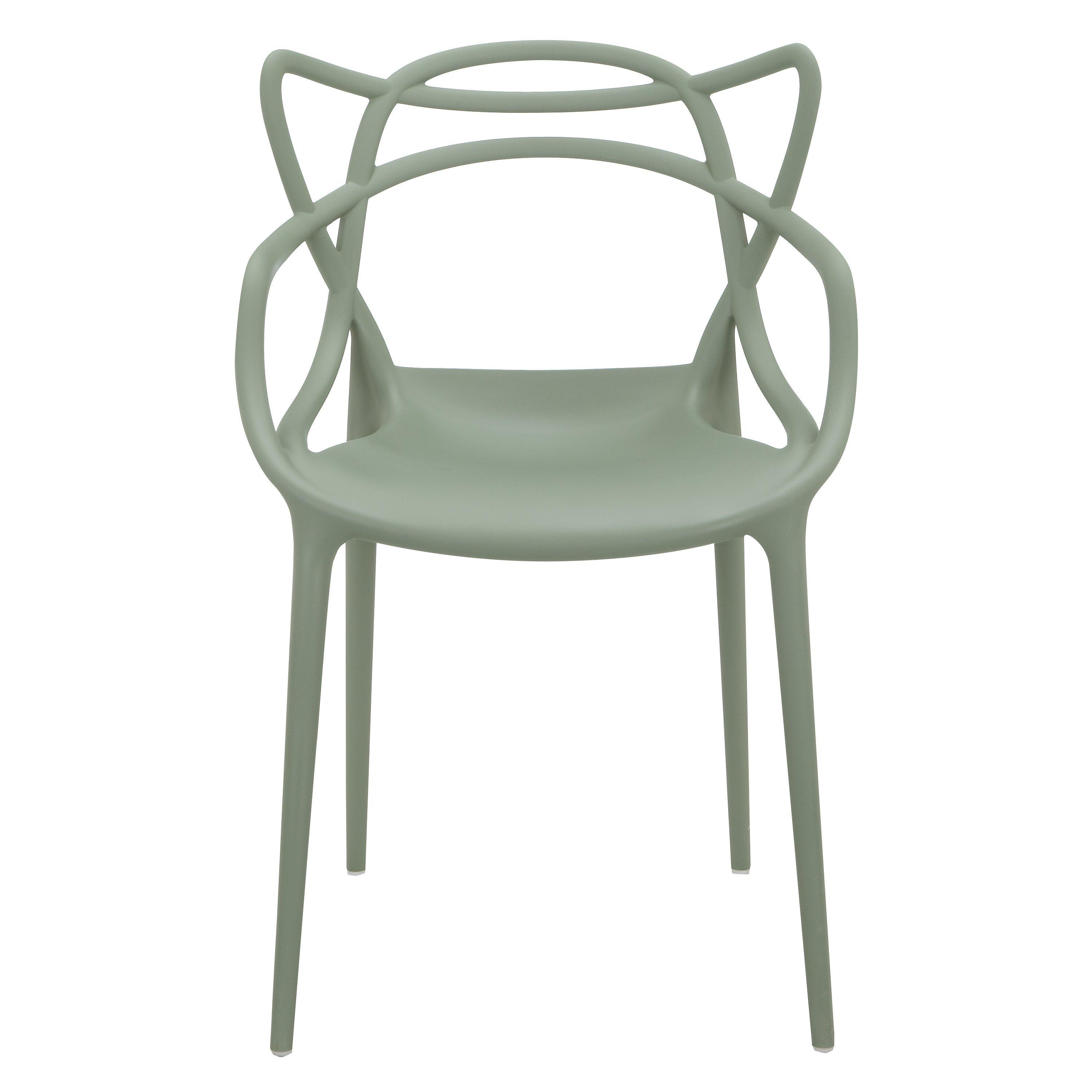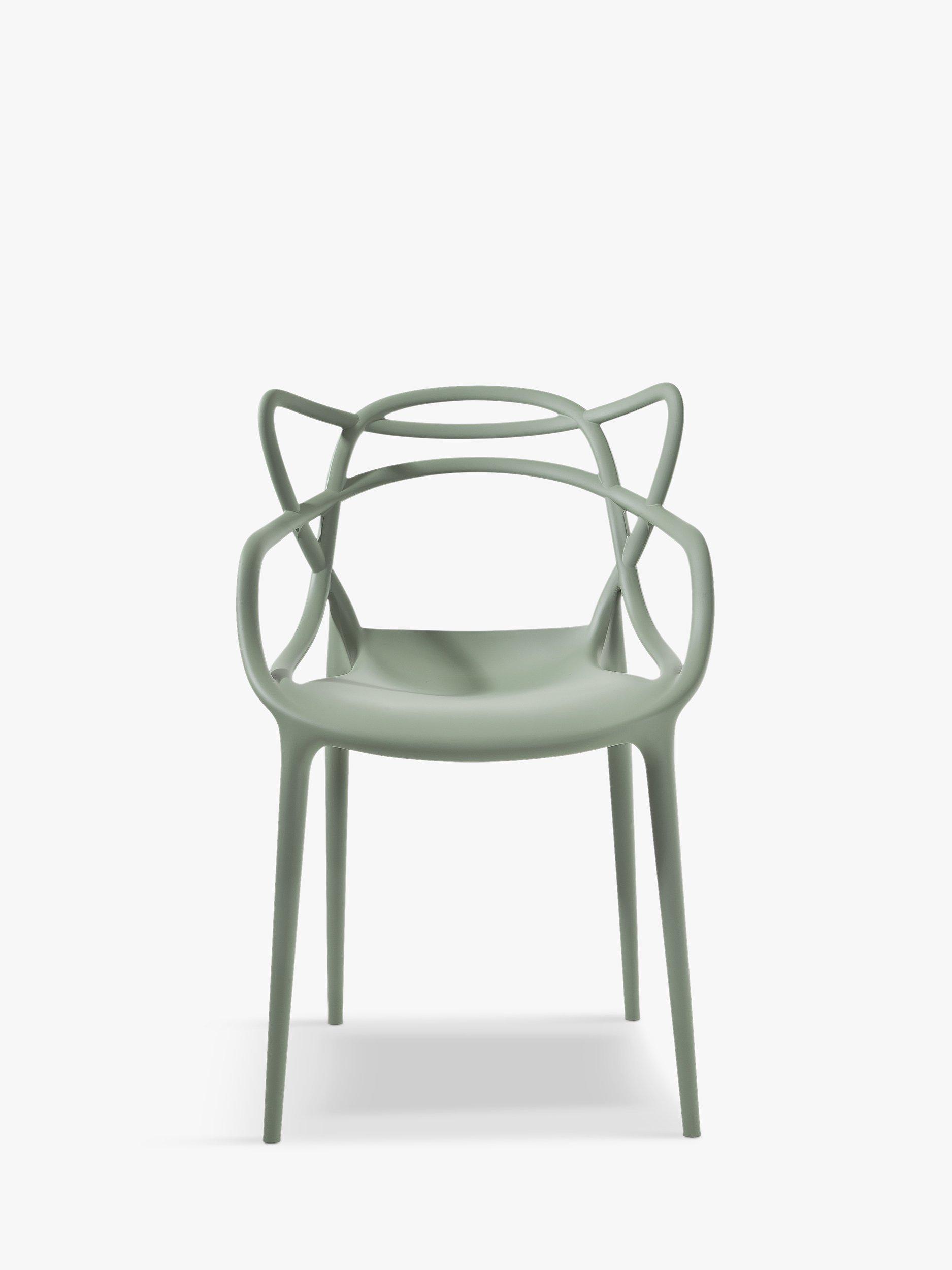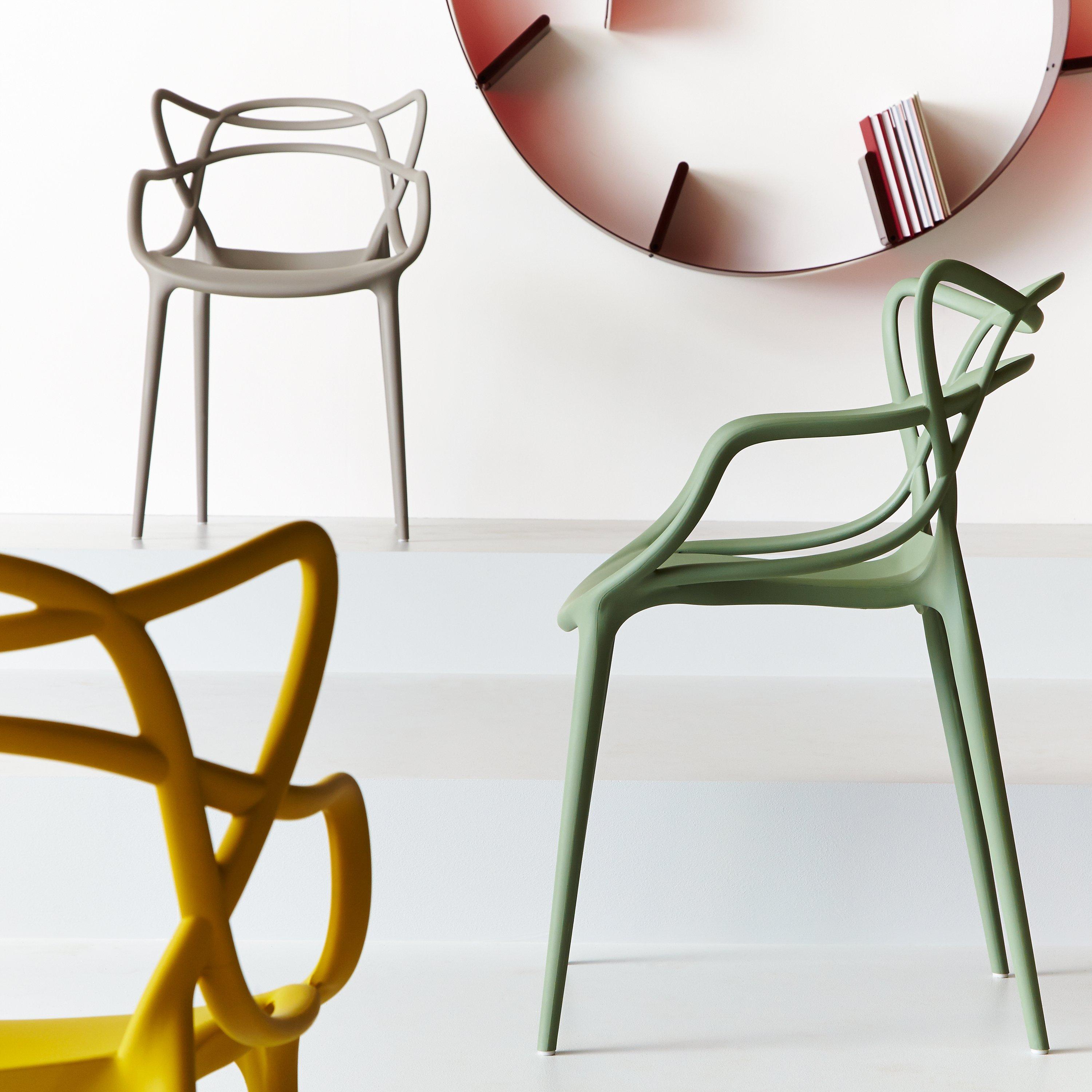 Designed by Philippe Starck in collaboration with Eugeni Quitllet, the Masters chair is a hybrid of three iconic Kartell designs: 'Serie 7' by Arne Jacobsen, the 'Tulip Armchair' by Eero Saarinen and the 'Eiffel Chair' by Charles Eames. The unmistakable silhouettes of these three chairs entwine to create a fusion of original styles. Made from sturdy polypropylene, it's lightweight, practical and stackable and can also be used outdoors. Contains 100% recycled materials.