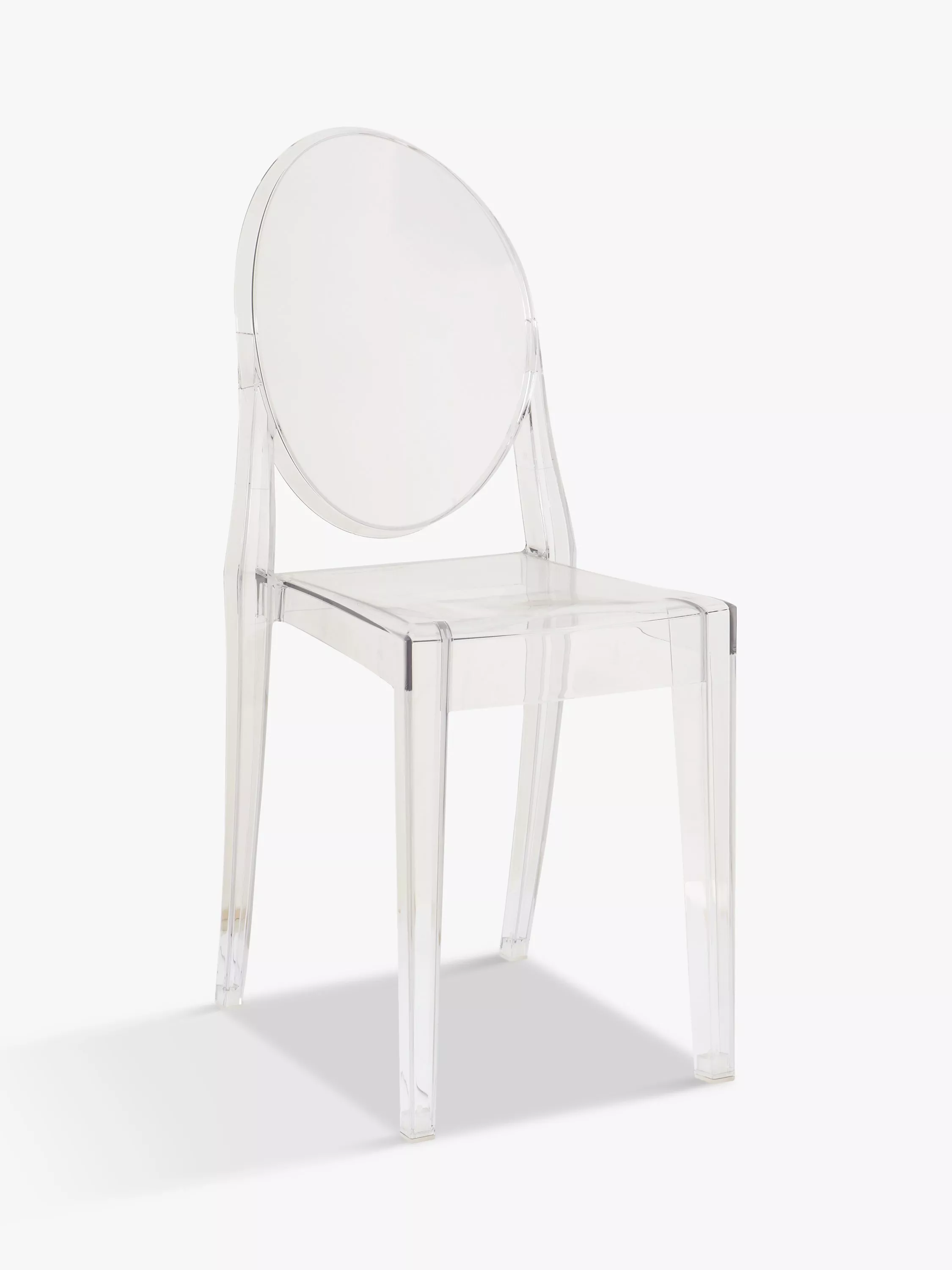 Designed by innovative architect and product designer Philippe Starck, the Ghost chair has become a modern cult classic. The elegant Neoclassical style, complete with slim oval back, is pared right down down into one single moulding of crystal-clear polycarbonate - which has a transparent, 'ghost' appearance.