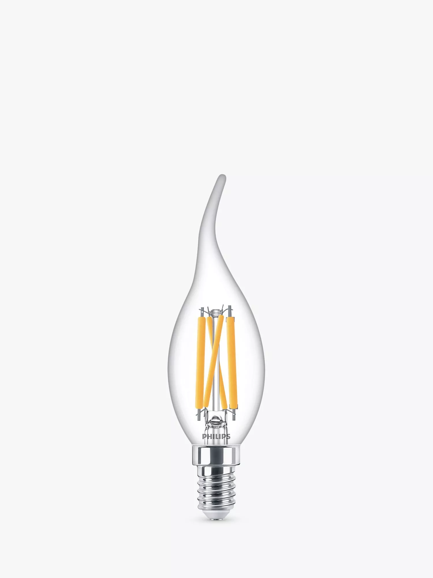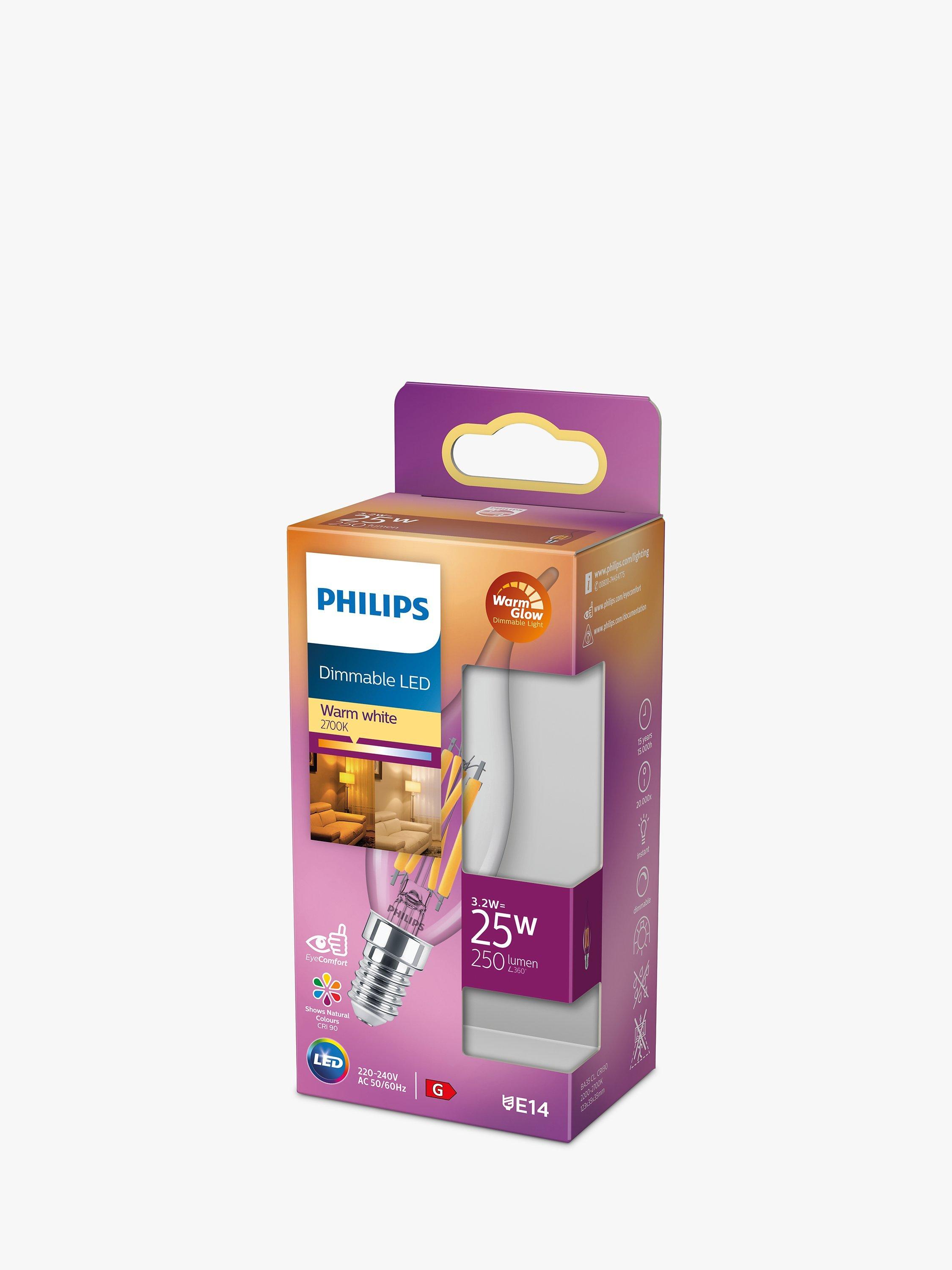 With a bent tip, this LED Candle bulb from Philips is an energy efficient option for your home. It has an E14 (SES) fitting and offers natural shades of warm white light. It's fully dimmable and has an impressive lifetime of up to 15,000 hours.