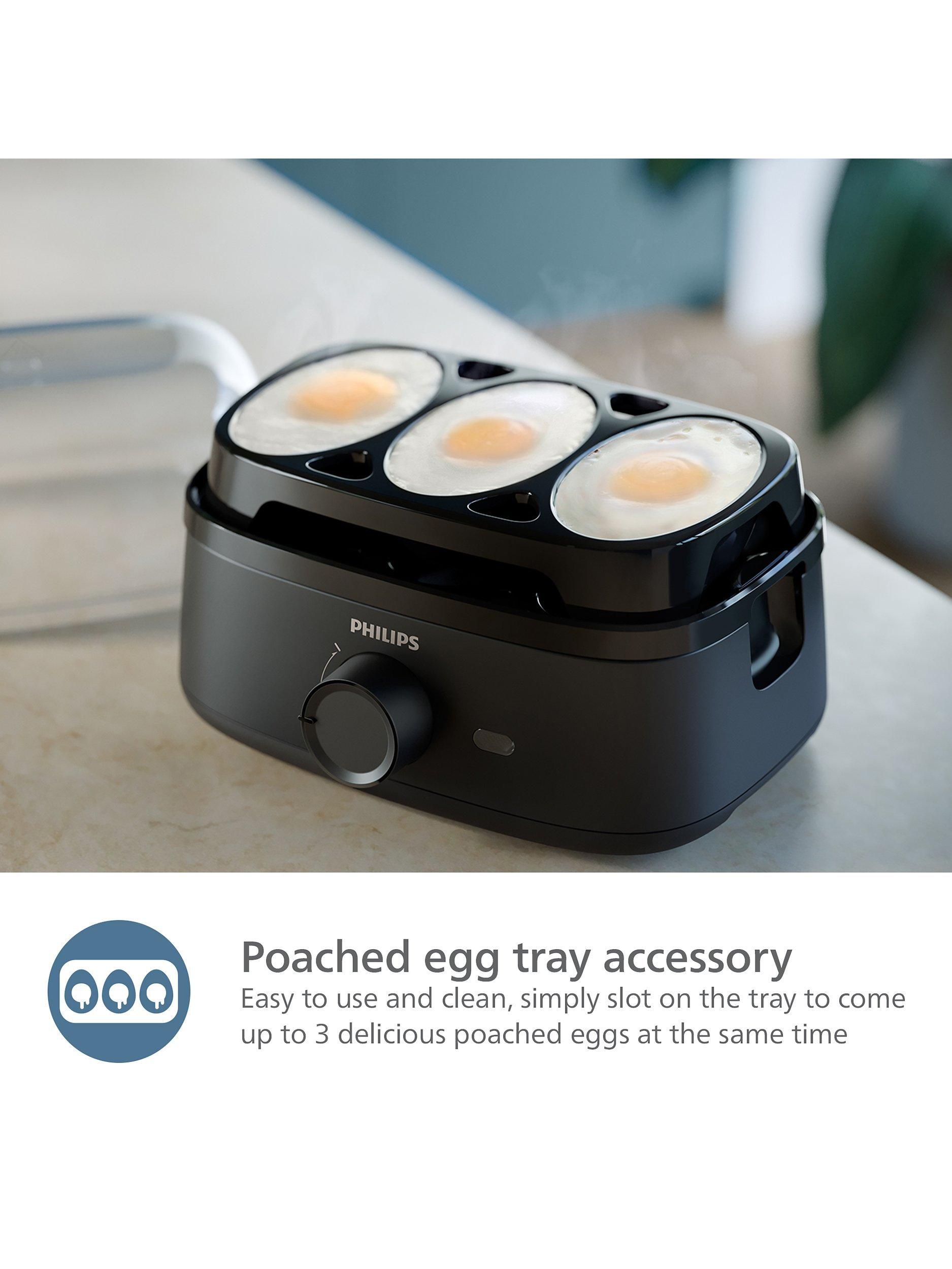 Poached egg tray accessory - The egg cooker comes with a poached egg accessory tray. Easy to use and clean, simply slot on the tray to come up to 3 delicious poached eggs at the same time.