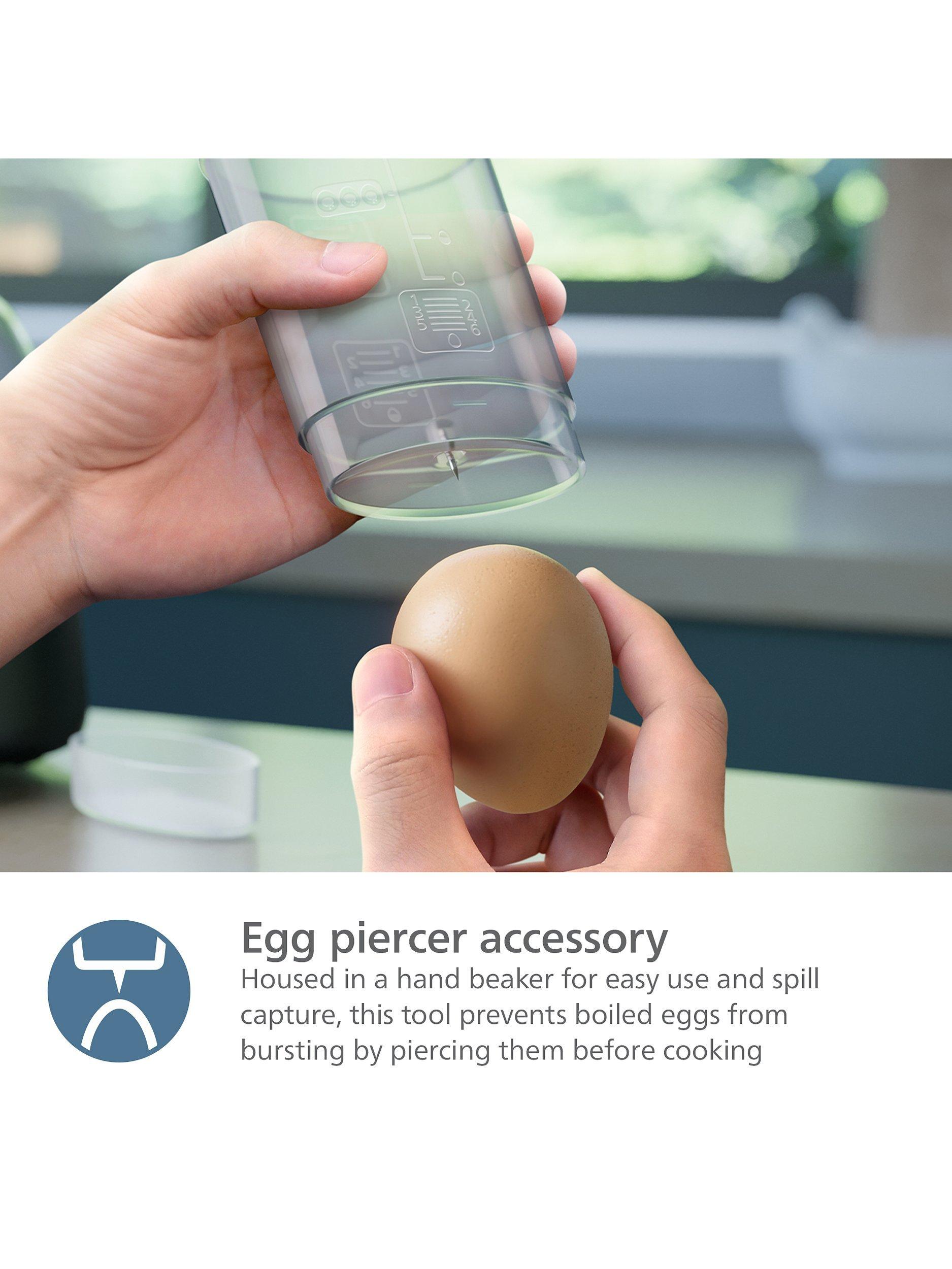 Egg piercer accessory - Boiled eggs need to be pierced before cooking to ensure they don't burst. The egg cooker includes an egg piercer. It's housed inside a hand beaker for ease of use and to capture any spills.