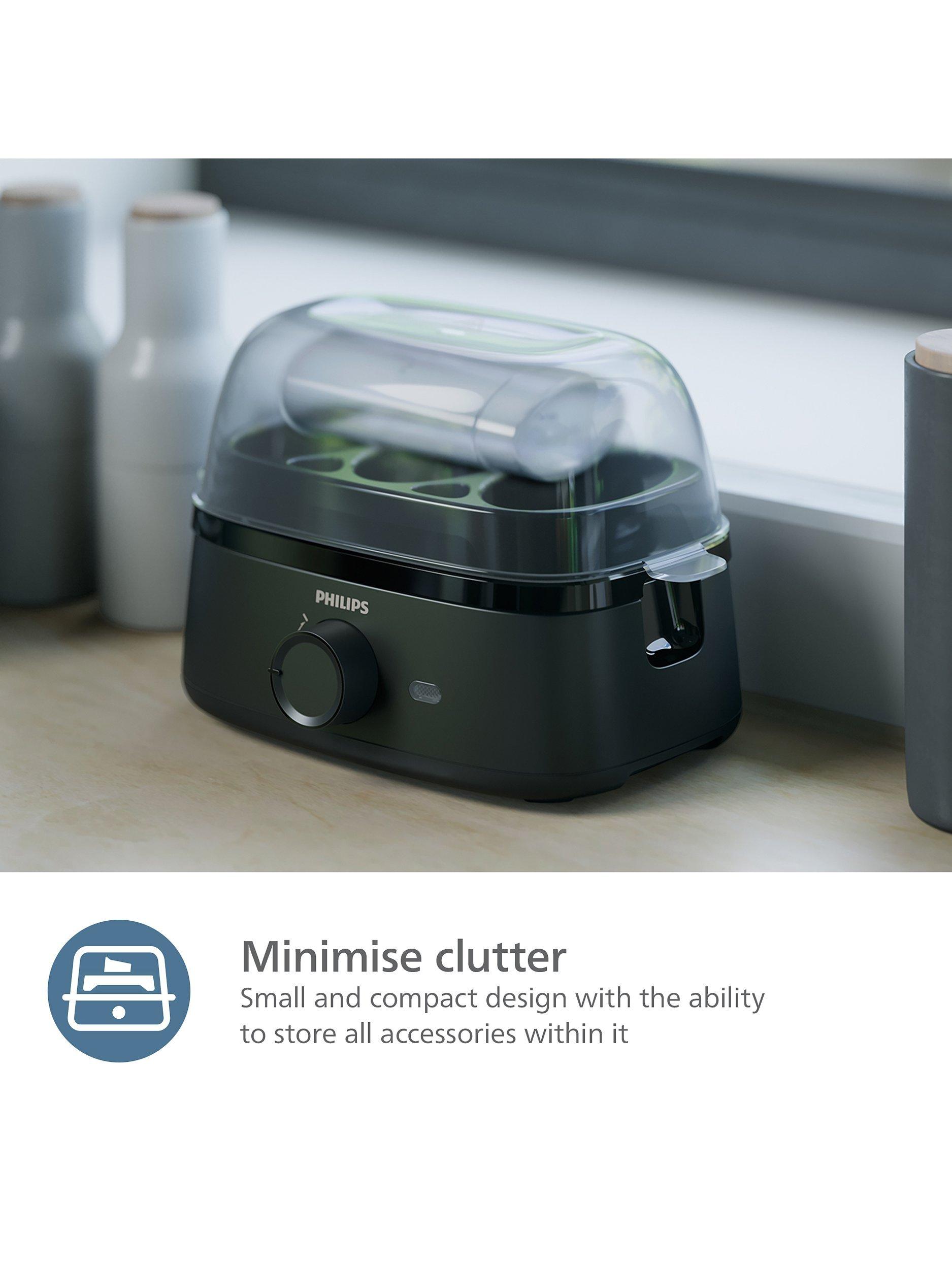 Compact, easy to store design - Designed to minimize clutter and lost accessories, the egg cooker is small and compact and able to store all accessories (measuring up, poaching tray, egg piercer and beaker) within it.