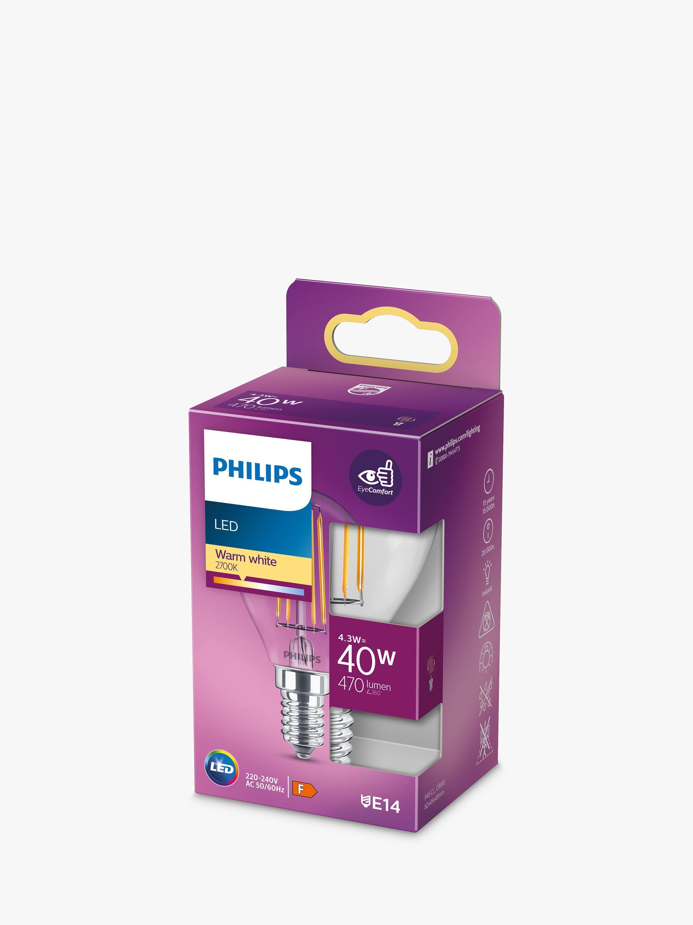 This 4.3W LED classic bulb is equivalent to 40W. Non-dimmable, it's an energy efficient option and offers comfortable shades of warm white light. It has an E14, small edison screw (SES) fitting and impressive lifetime of up to 15,000 hours.