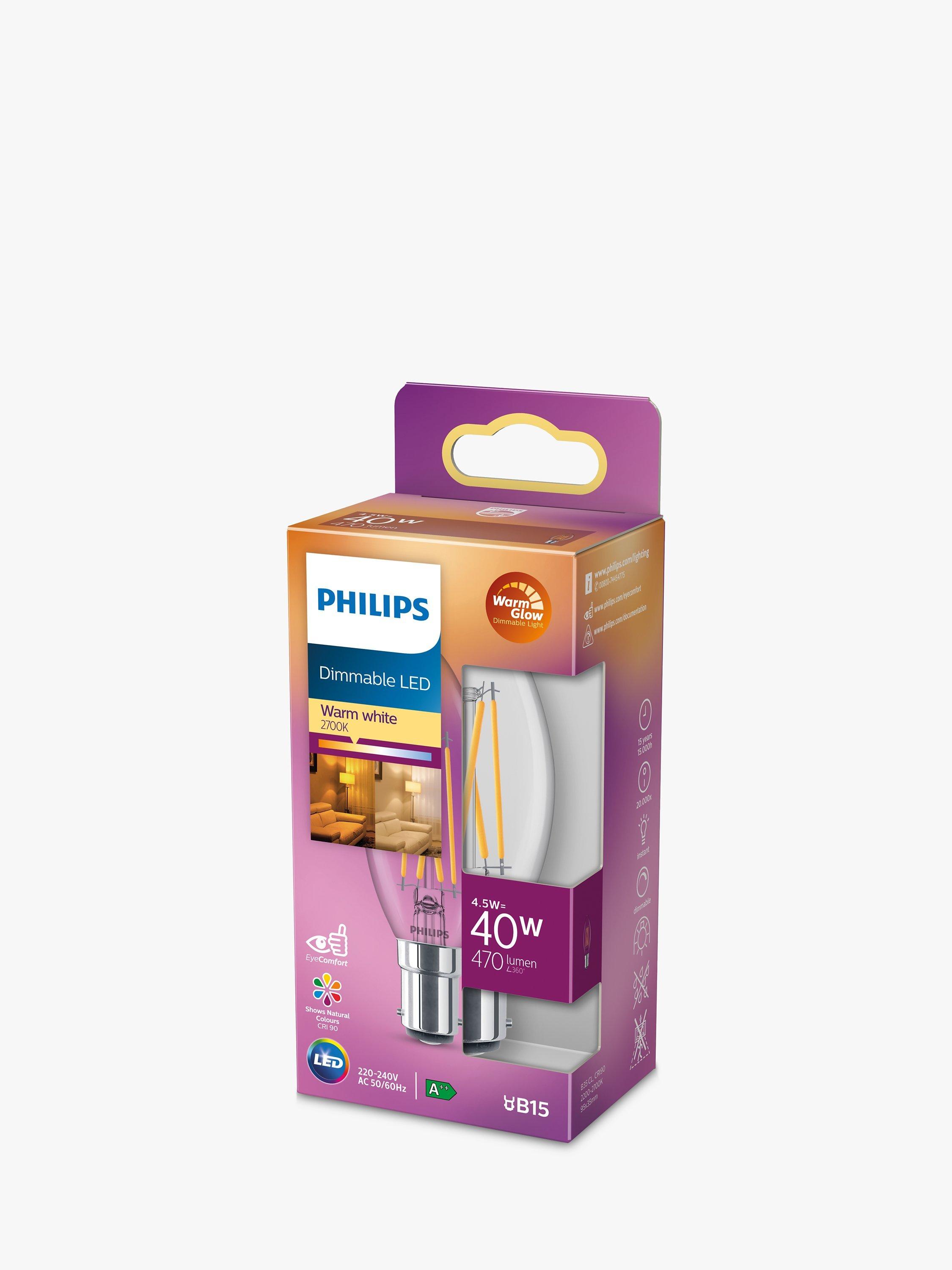 This fully dimmable LED bulb from Philips is an energy efficient option for your home. With an impressive lifetime of up to 15,000 hours, it has a bayonet cap (BC) fitting and offers natural shades of warm white light. Its 4.5W is equivalent to 40W.