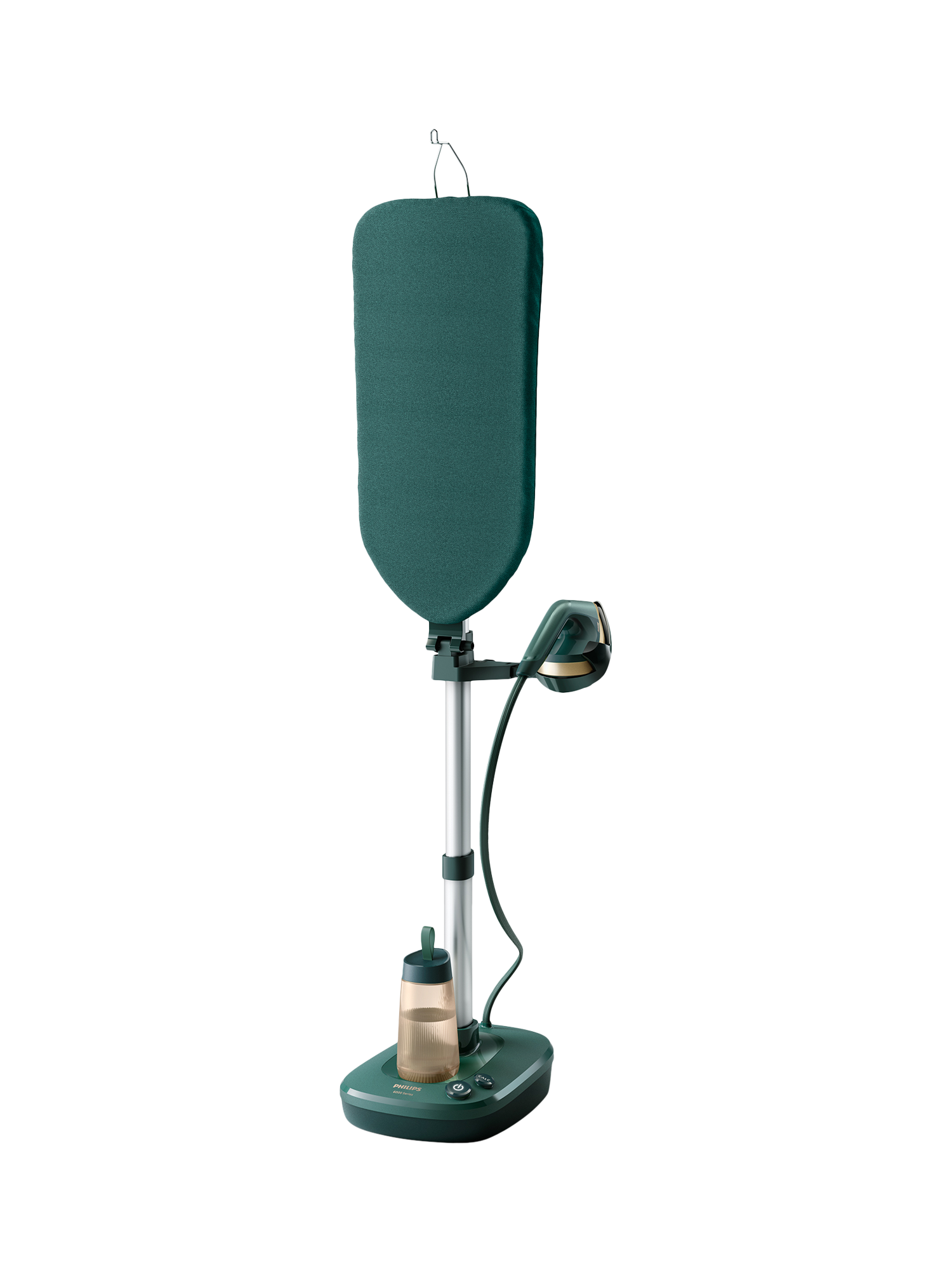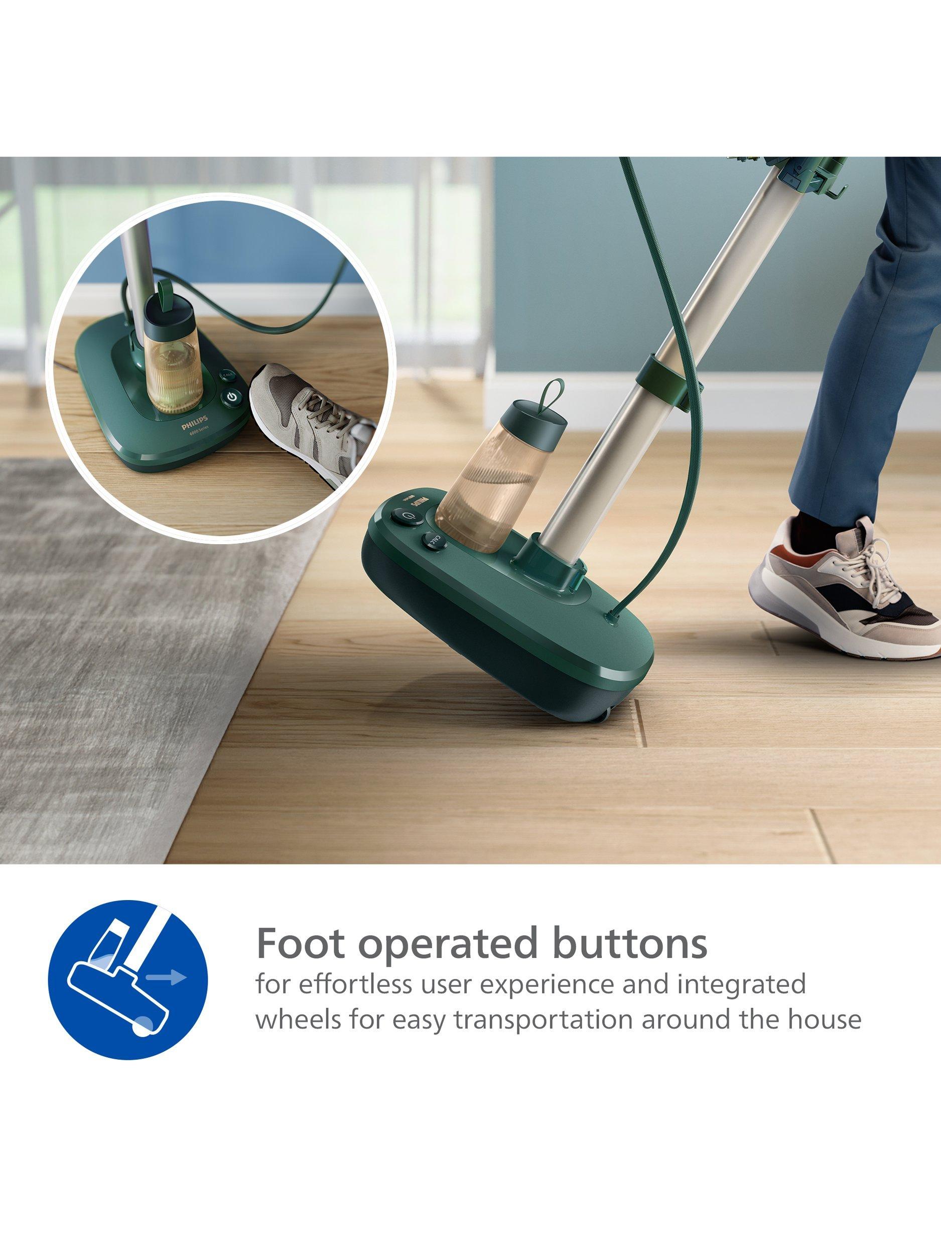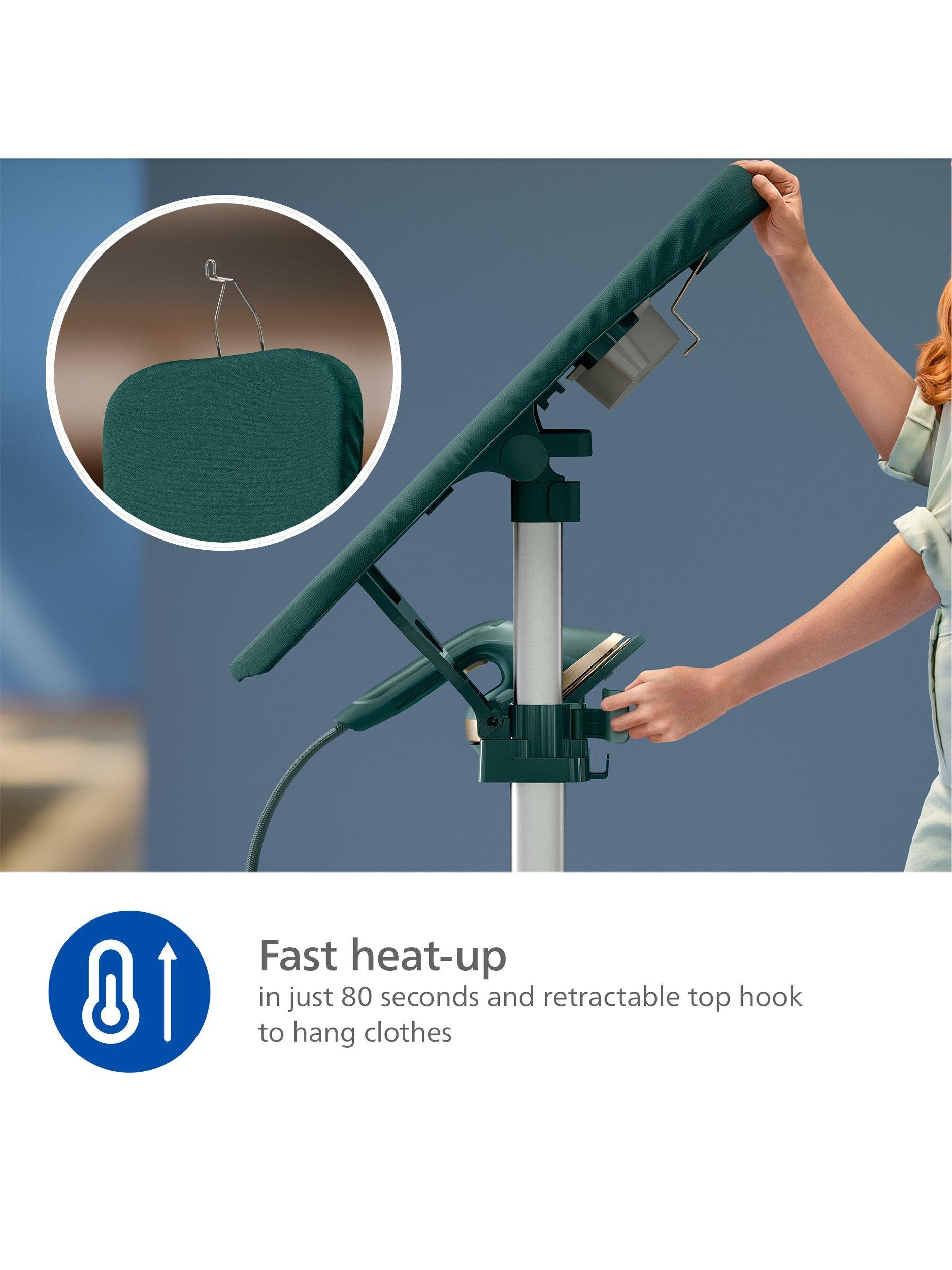An integrated multi-angle board with OptimalTEMP technology, foot-operated buttons, powerful 45 g/min steam rate, and up to 99.9% of bacteria* removed.