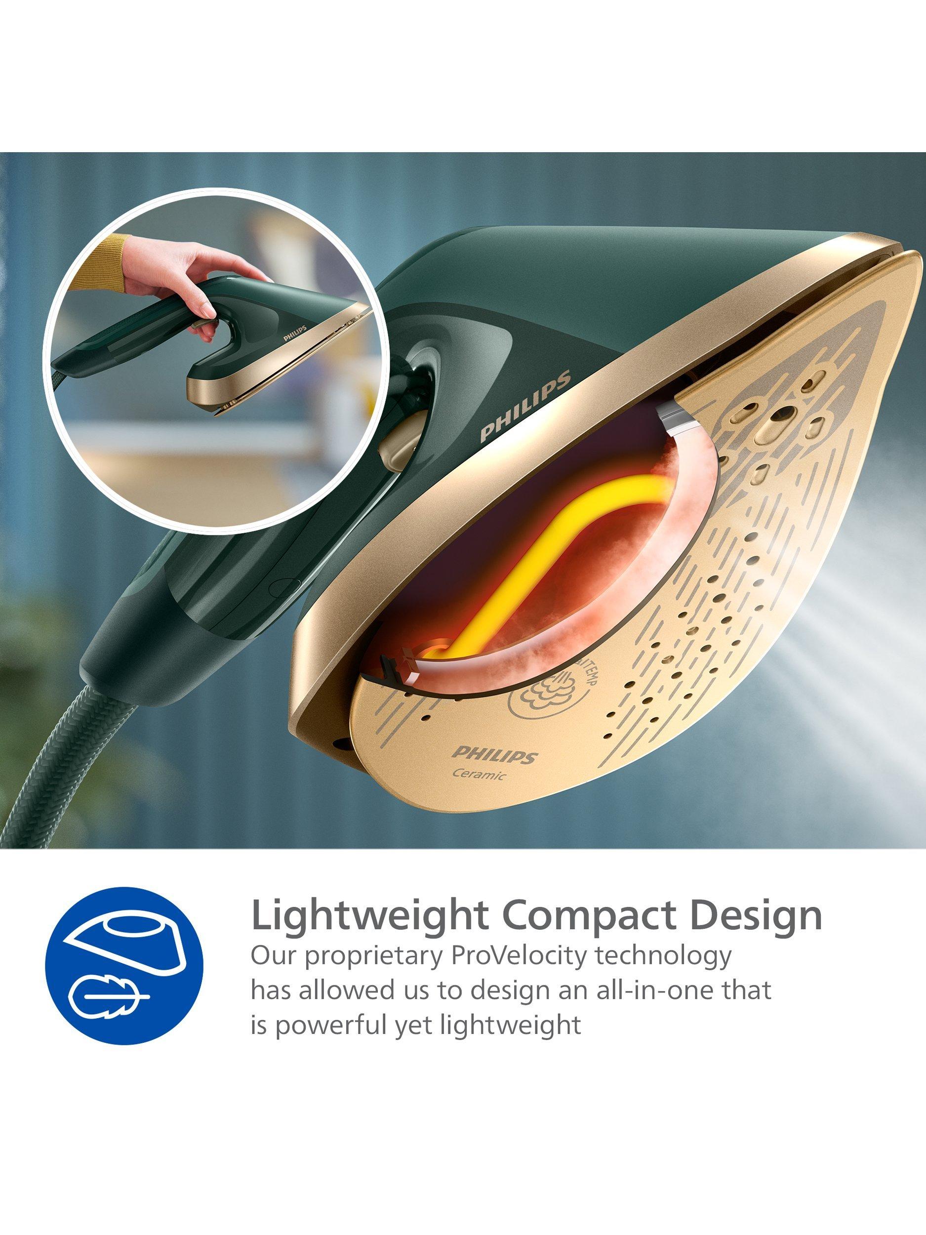 Lightweight ironing - At half the weight of a regular steam iron***, the ergonomic iron+ head ensures you can de crease clothes in comfort.