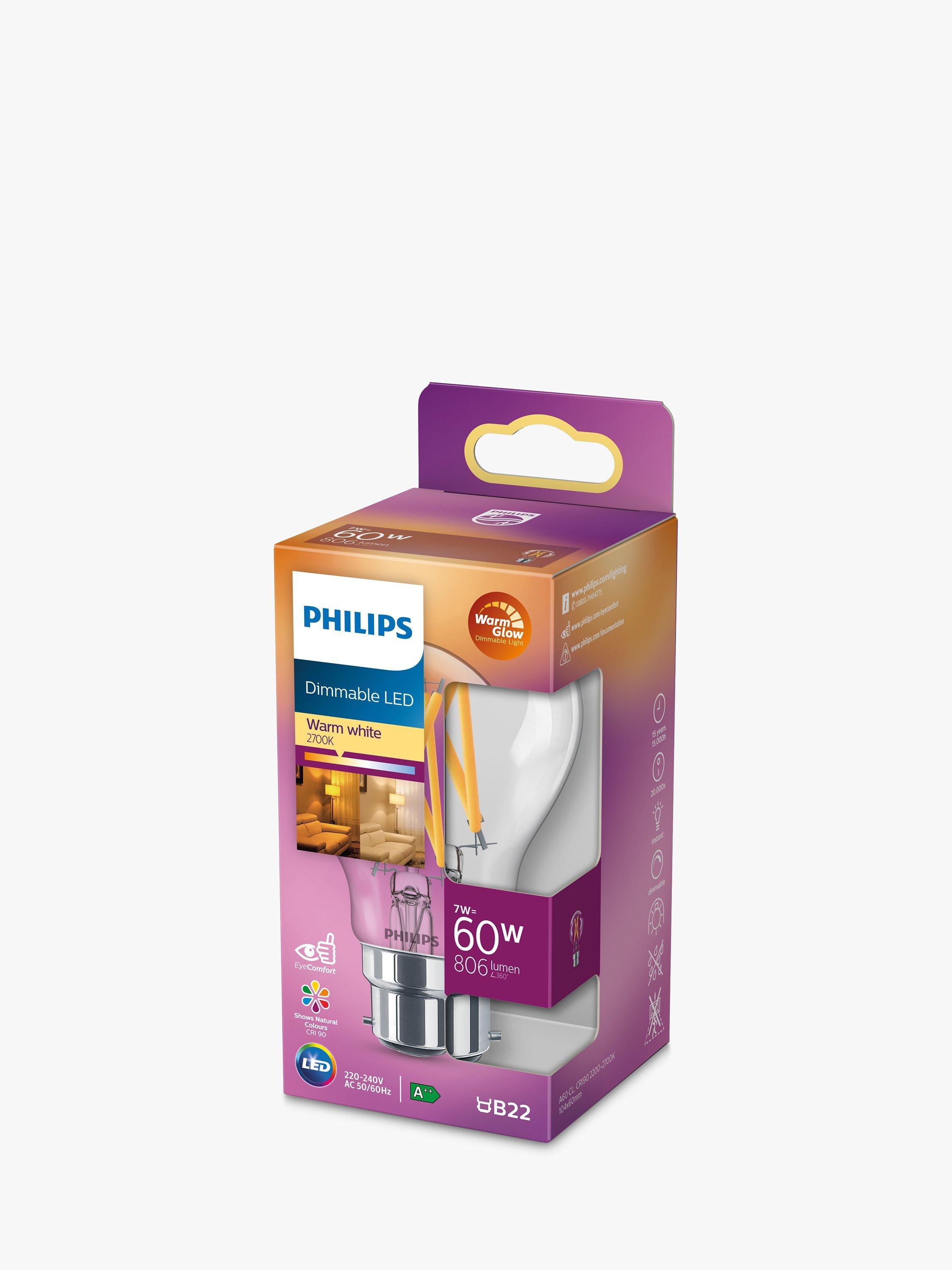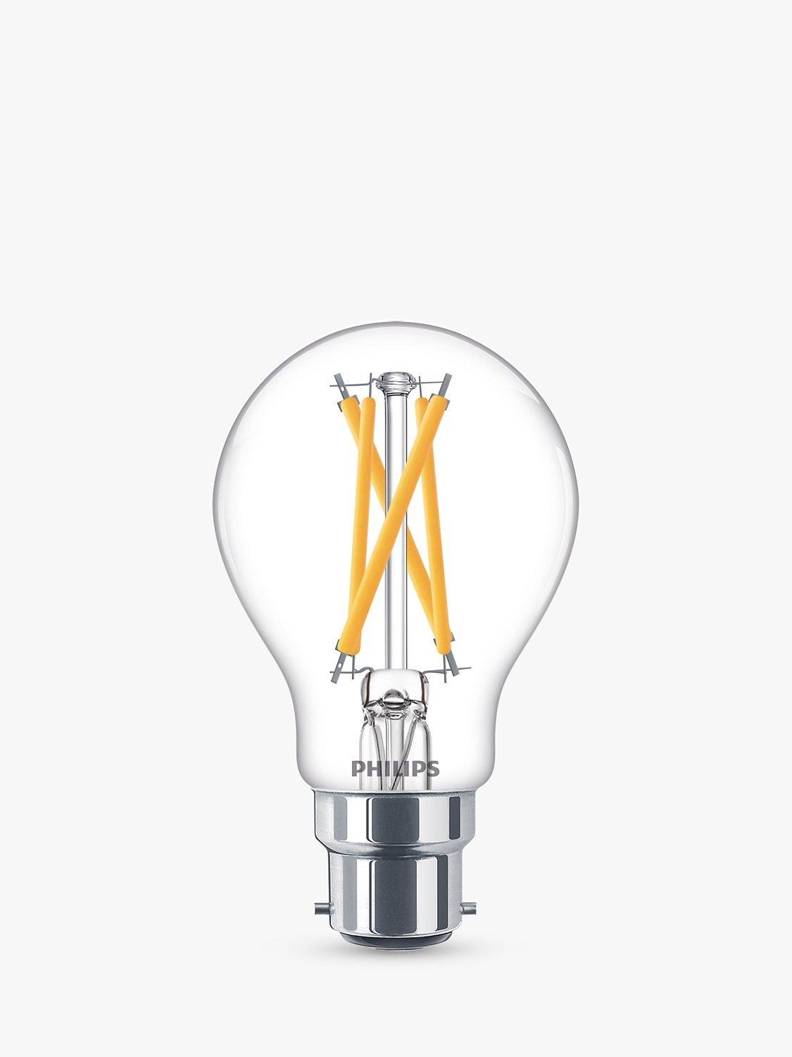 This fully dimmable Classic LED bulb from Philips is an energy efficient option for your home. With an impressive lifetime of up to 15,000 hours, it has a BC (bayonet cap) fitting and offers natural shades of warm white light.