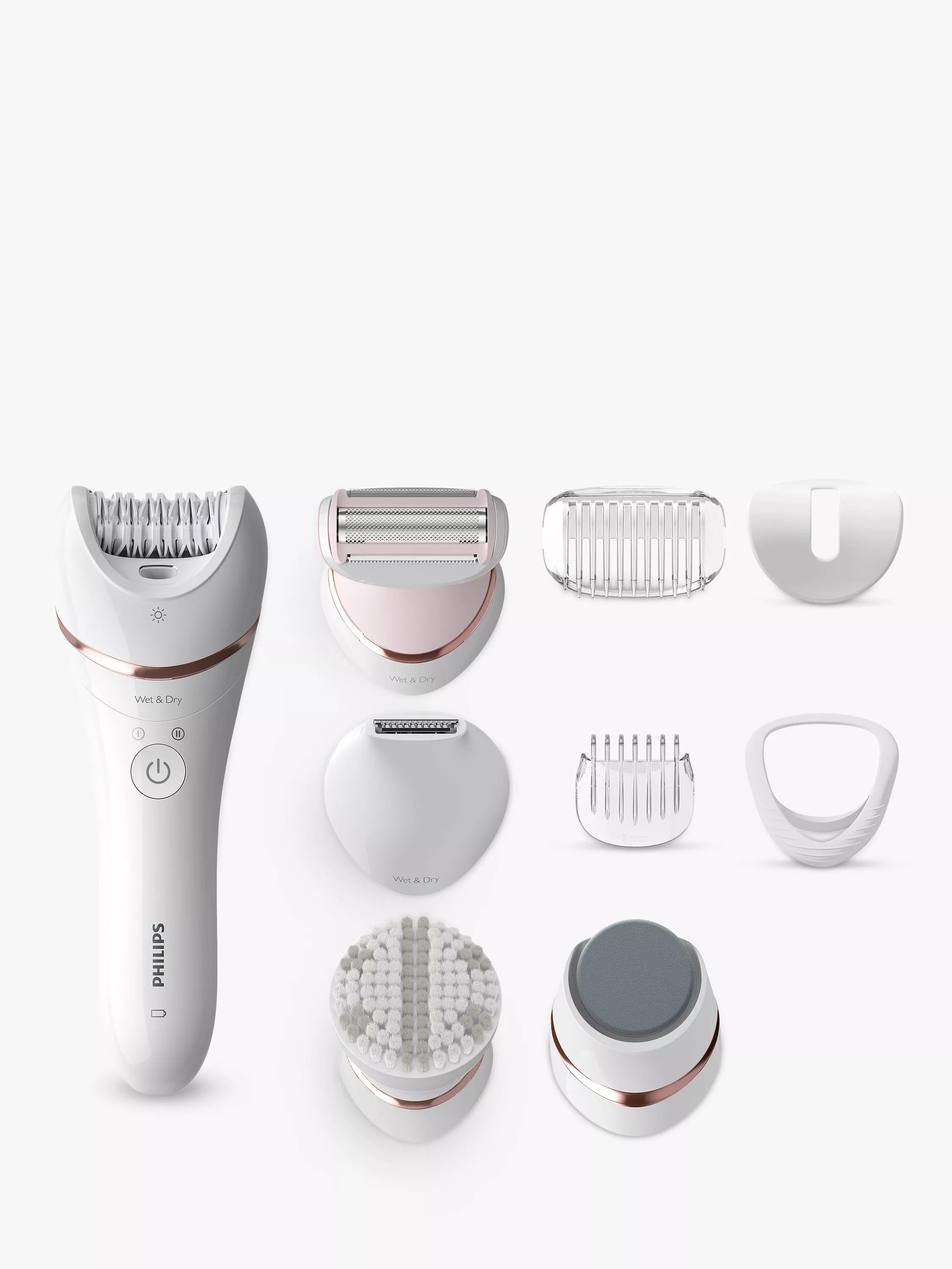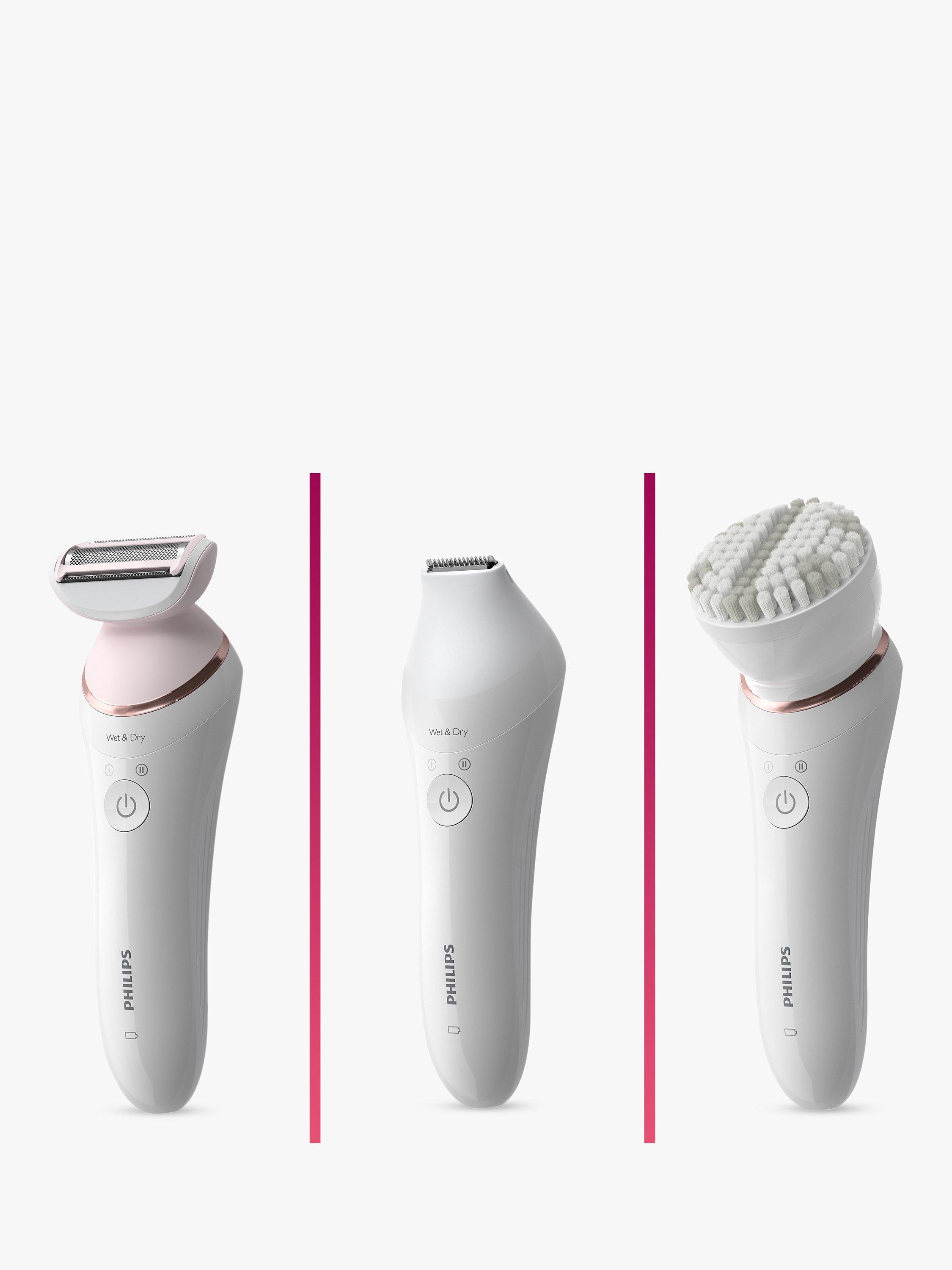 - Shaving head, trimming comb, bikini trimmer head, bikini trimmer comb, body exfoliation brush, pedicure file, delicate area cap, optimal contact cap, storage pouch, cleaning brush