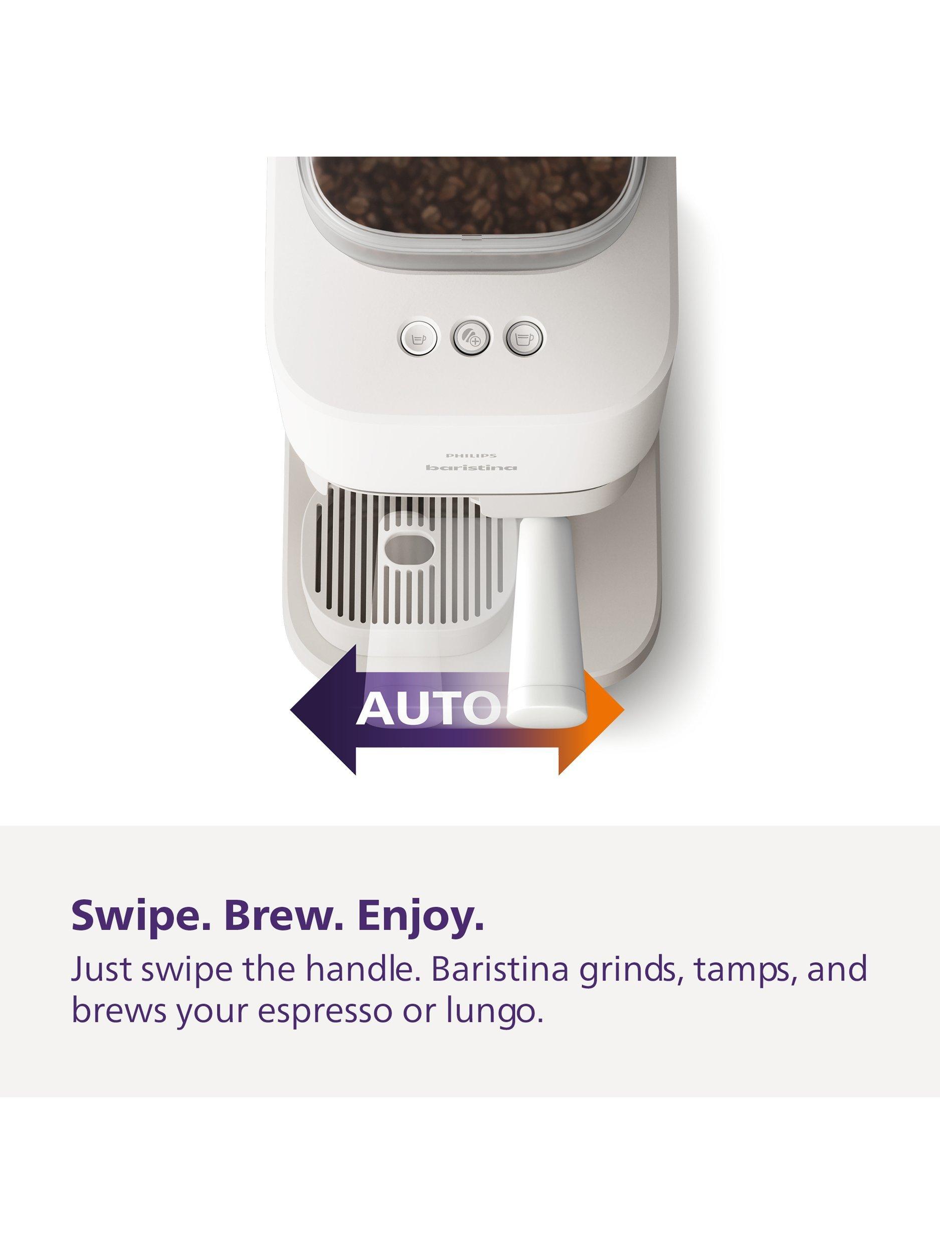 Just swipe the handle. Baristina automatically grinds, tamps and brews your coffee. You can enjoy your espresso or lungo.