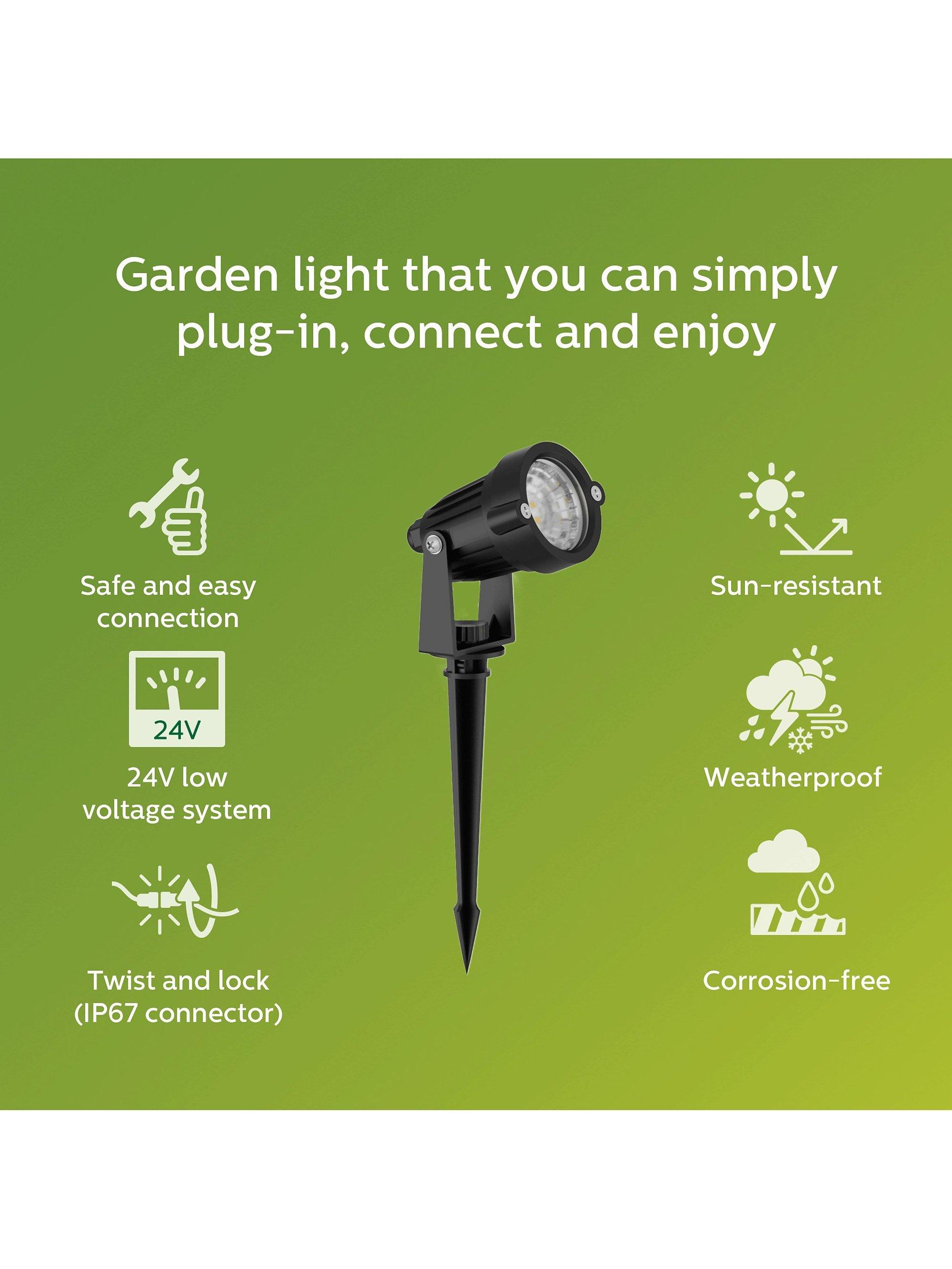 The Philips GardenLink Caper low-voltage family offers a range of outdoor lighting that you can easily and safely install. You can connect multiple lights to a single power supply and plug it into a standard socket, then easily add additional lights or reposition them whenever you like.