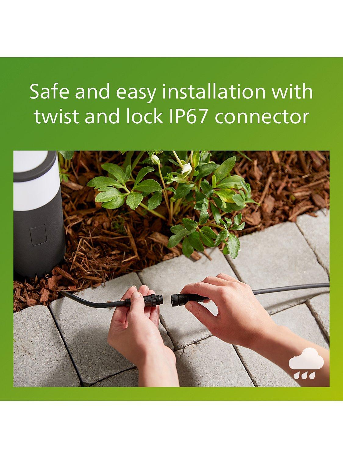 Wiring is simple, and the low-voltage means that there's no danger of harm to you, your kids or your pets. Twist and lock to plug in with an IP67 connector, safe for outdoor use.