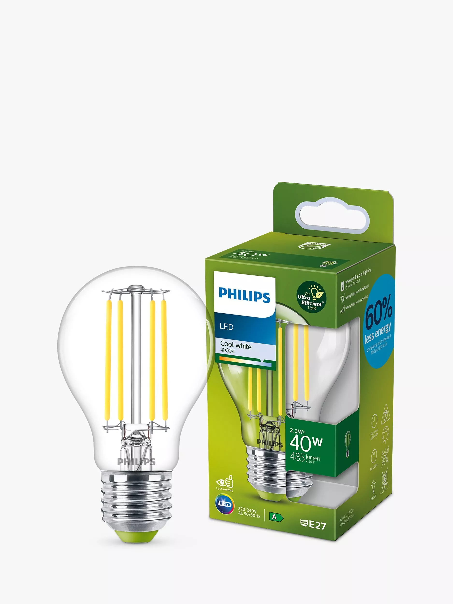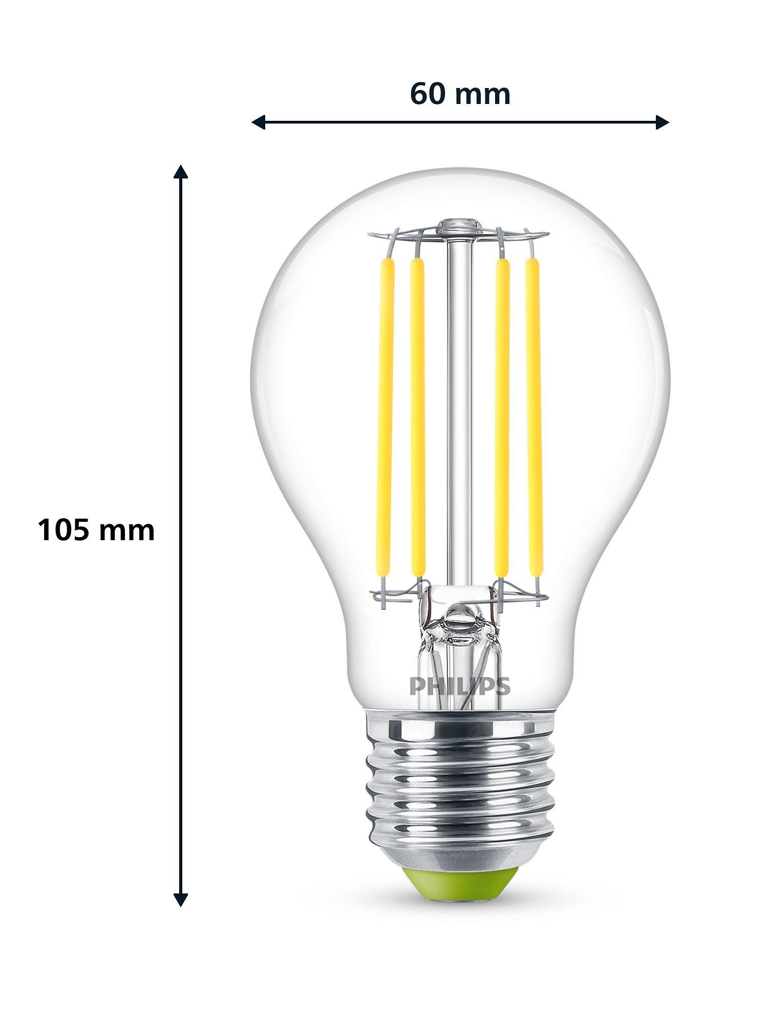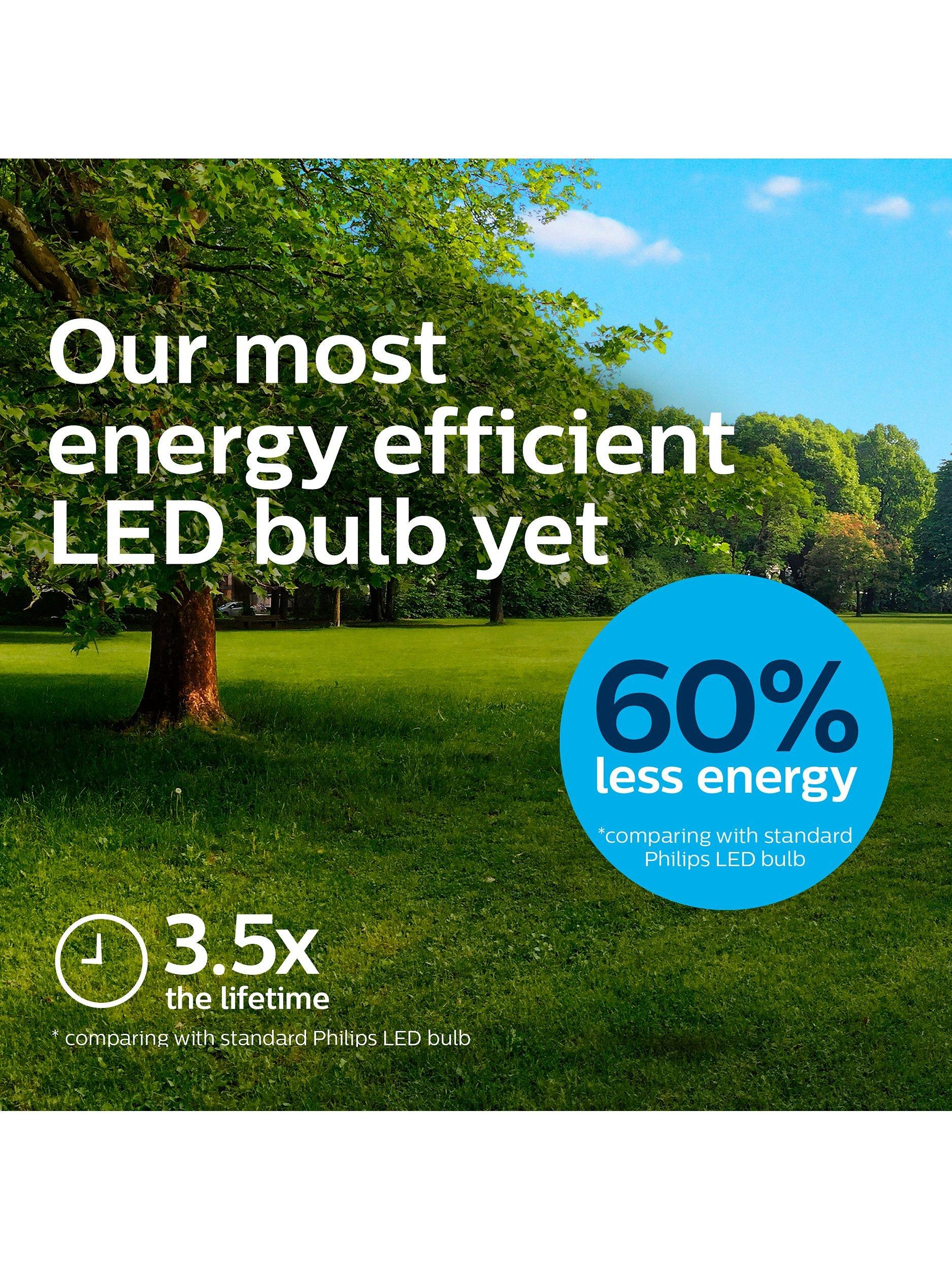 Part of Philip's Ultra Efficient range of LED bulbs, this powerful bulb is a brilliant replacement for your old incandescent bulbs. It uses 60% less energy when compared with a standard Philips LED bulb and provides a clear white light with a long lifetime.
