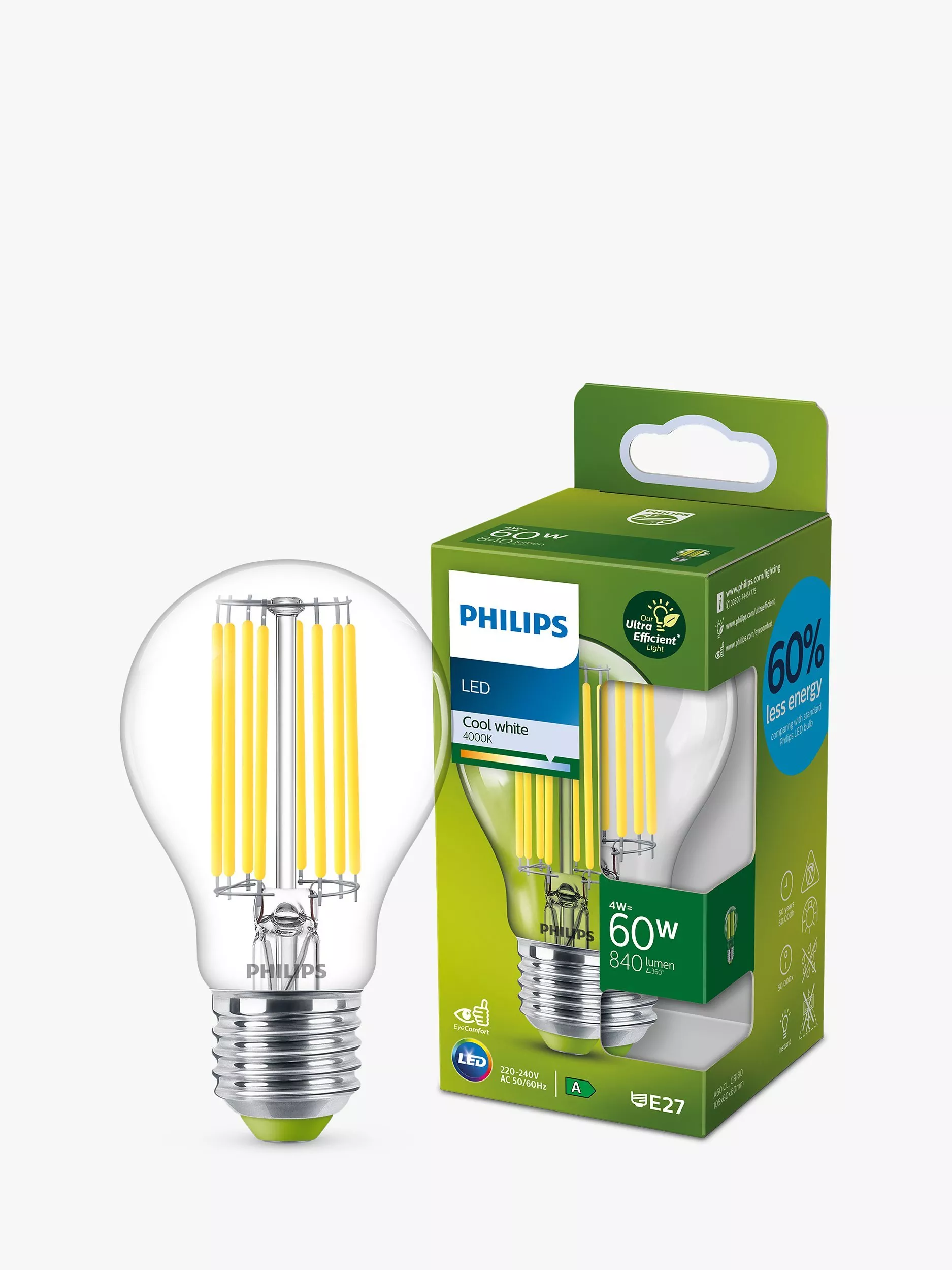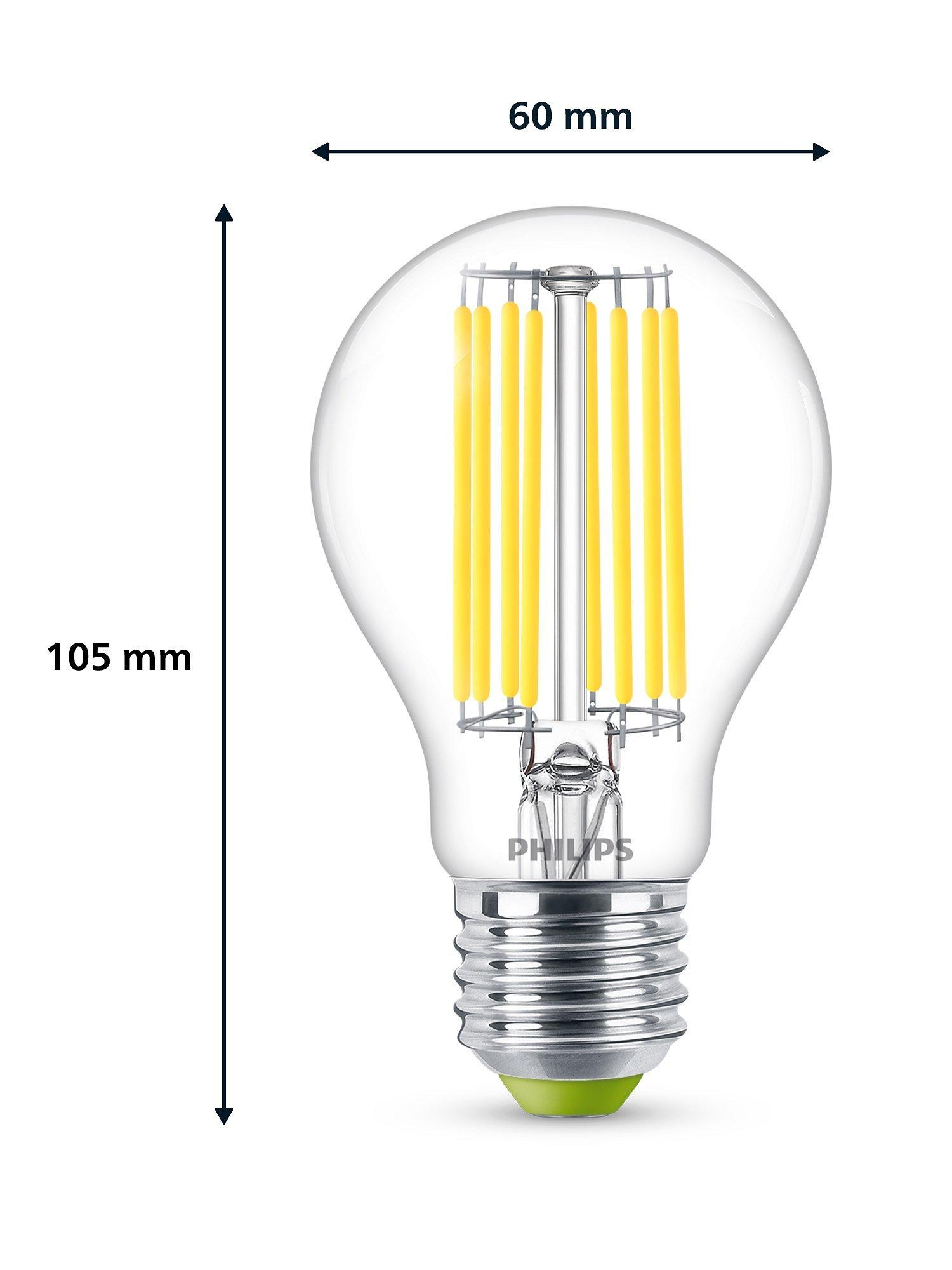 Part of Philip's Ultra Efficient range of LED bulbs, this powerful bulb is a brilliant replacement for your old incandescent bulbs. It uses 60% less energy when compared with a standard Philips LED bulb and provides a clear, cool white light with a long lifetime.