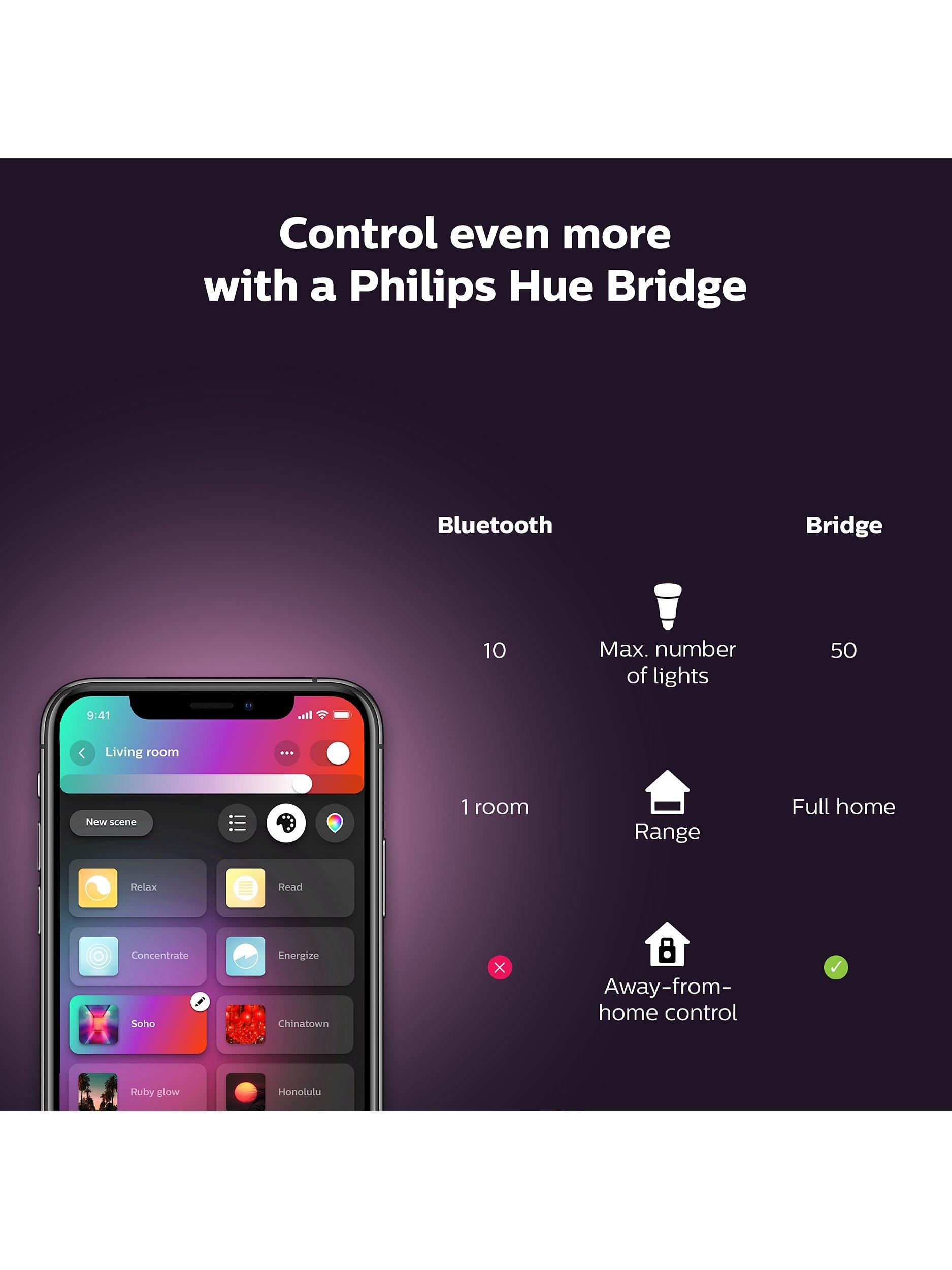 To experience the full potential of this smart light, connect to a Philips Hue Bridge (optional extra, available to purchase separately). Additional Philips Hue features include: setting timers and routines with light, controlling your lights remotely and automating your entire smart home lighting set up. There's also the option to add other accessories, including motion sensors and smart switches.