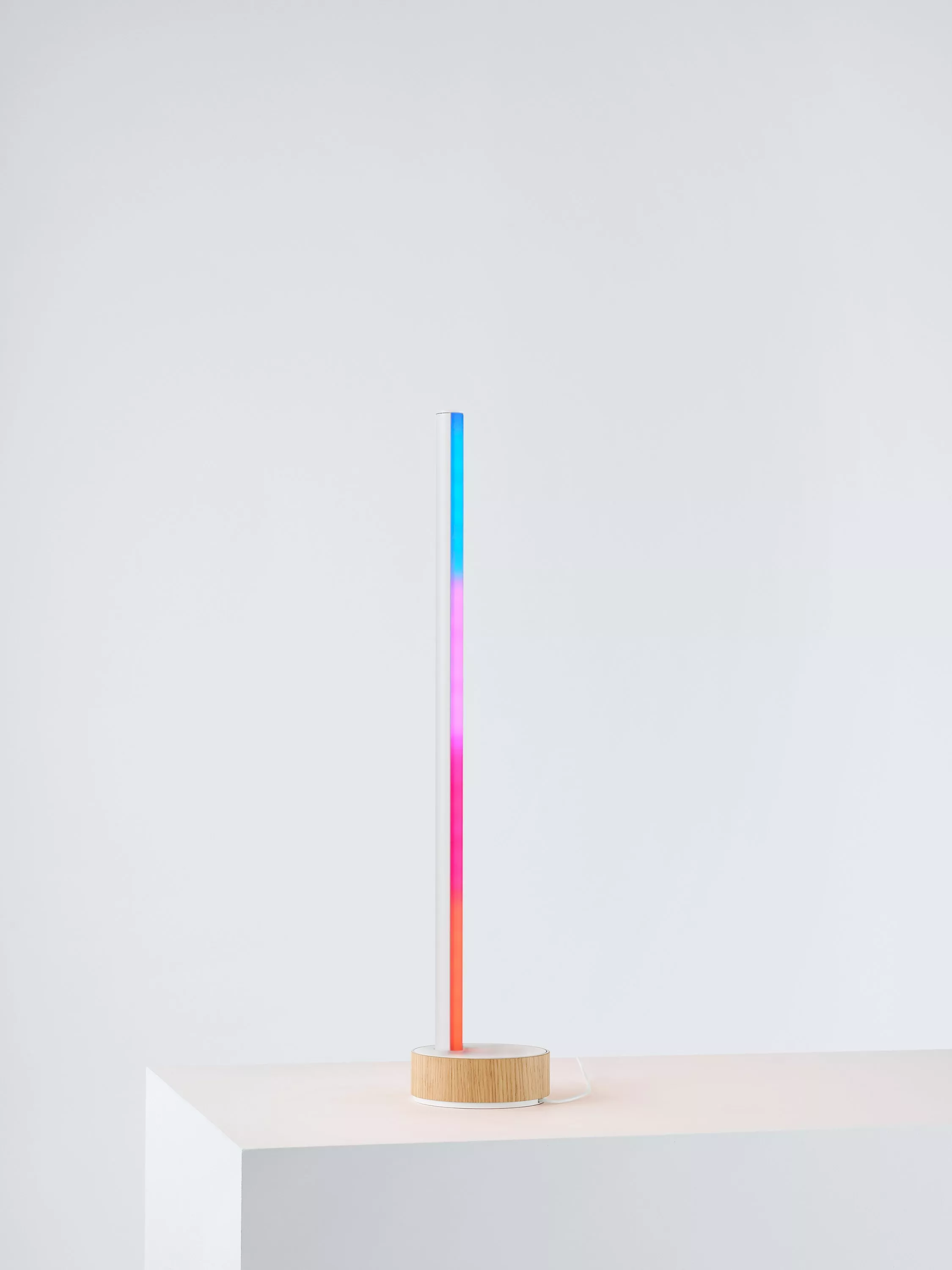 Wake up to the morning sun, scheduled to rise at your convenience. Featuring a wood-toned base, slender design and brilliant blend of colourful light, this table lamp is both a statement piece and a subtle accent for your sleep or living space.
