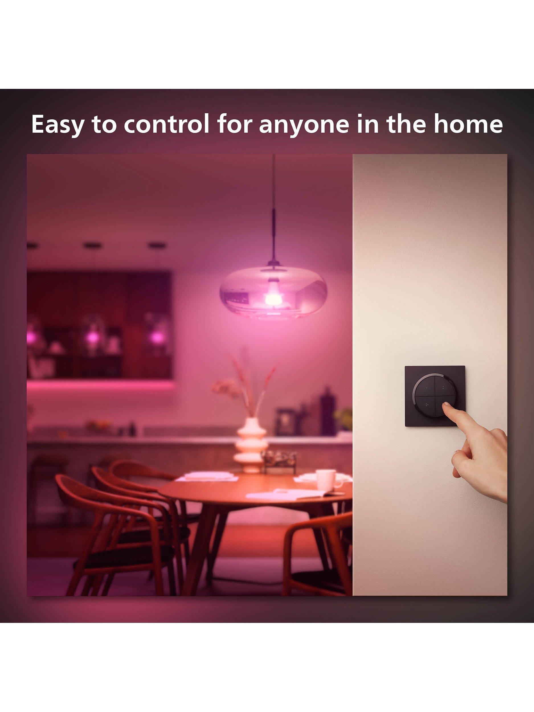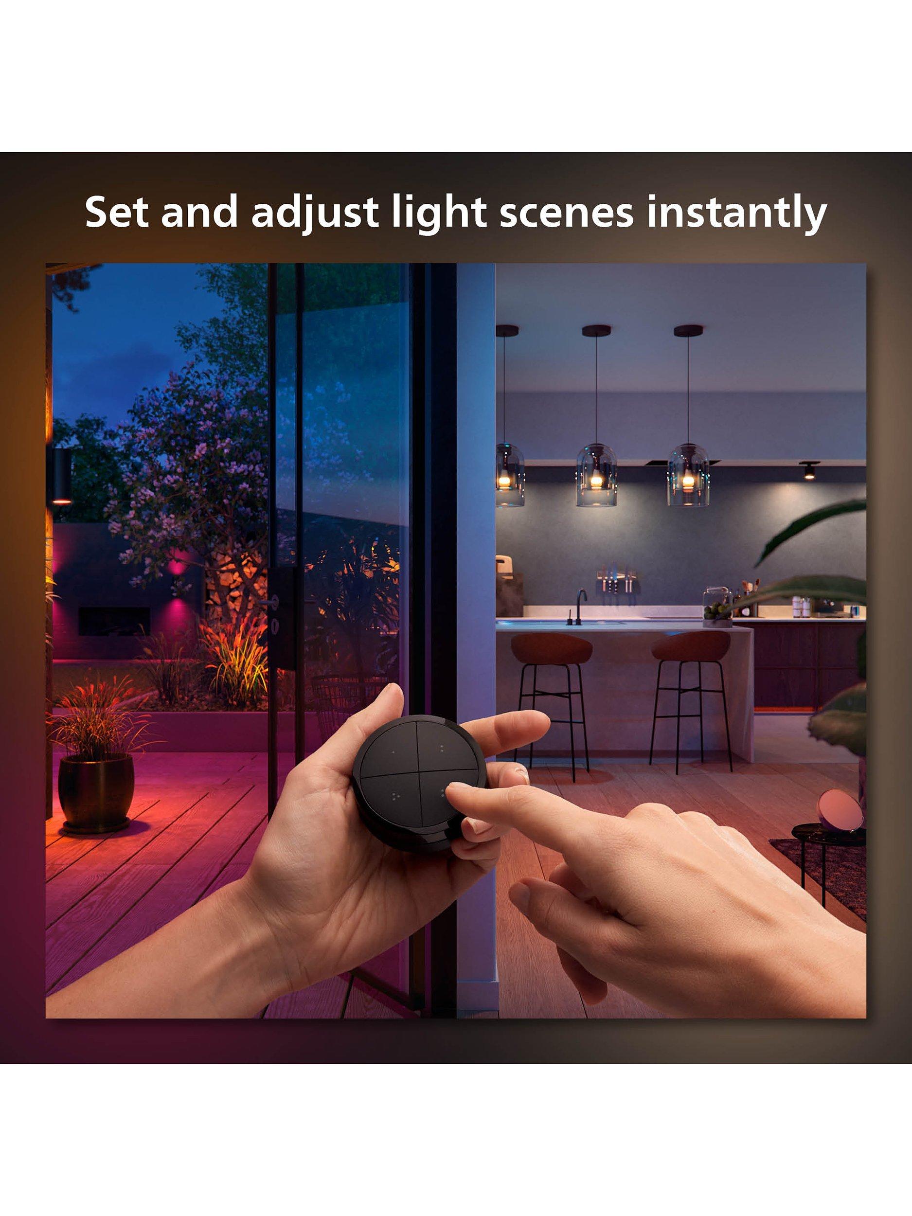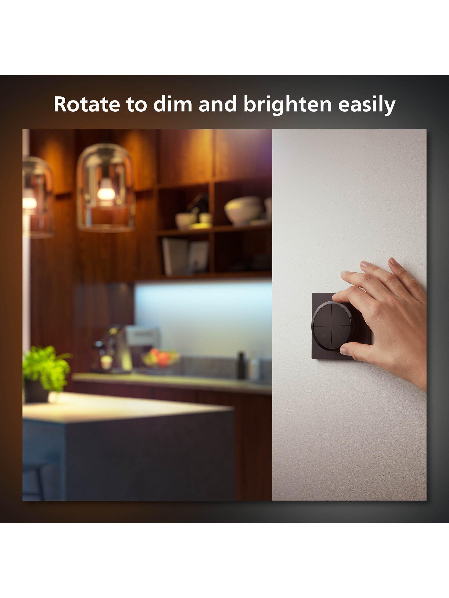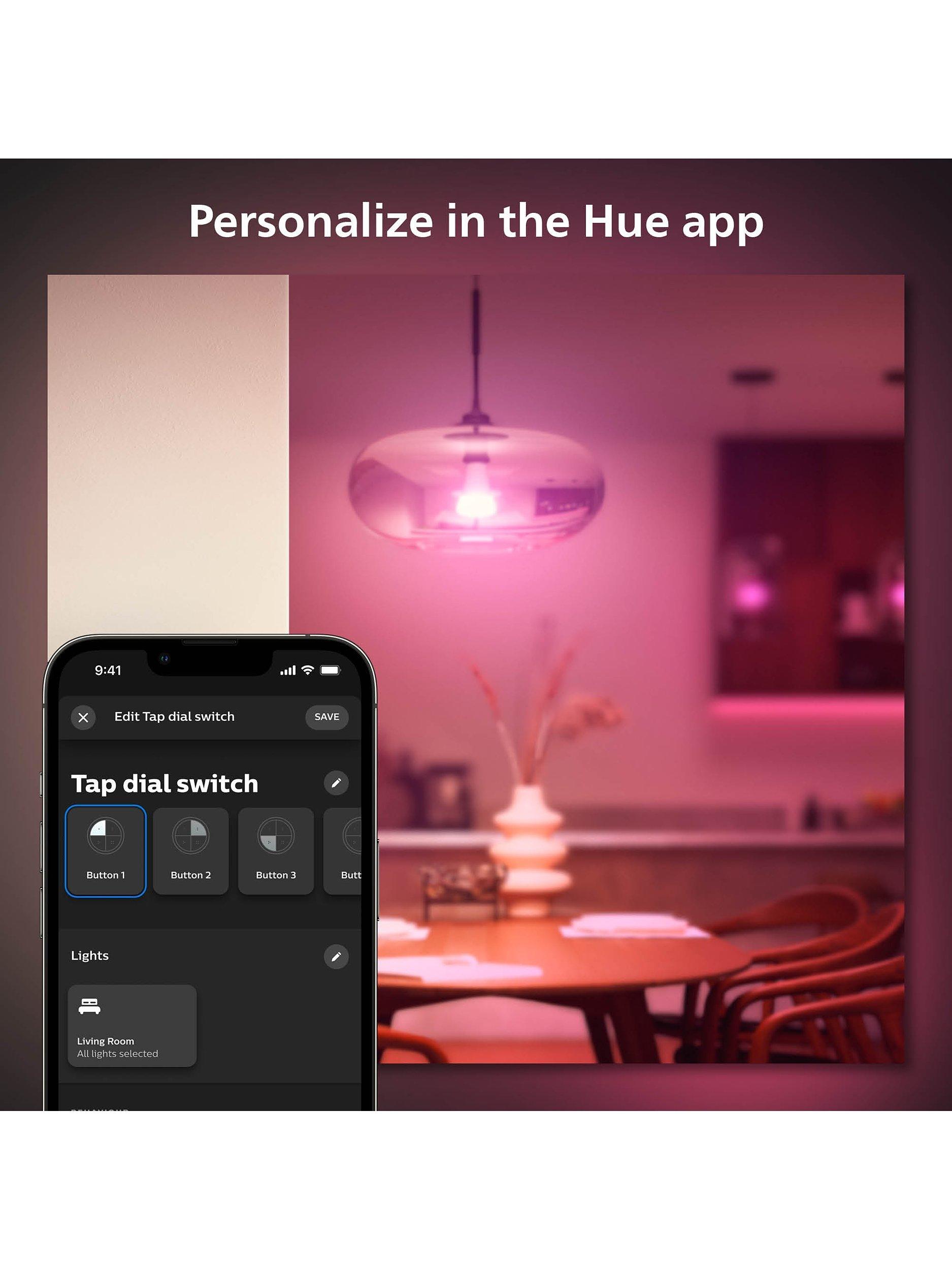 - Control up to three Rooms or a zone with each individual button of the Tap dial switch. Turn the dial to dim and brighten your Philips Hue smart lights.